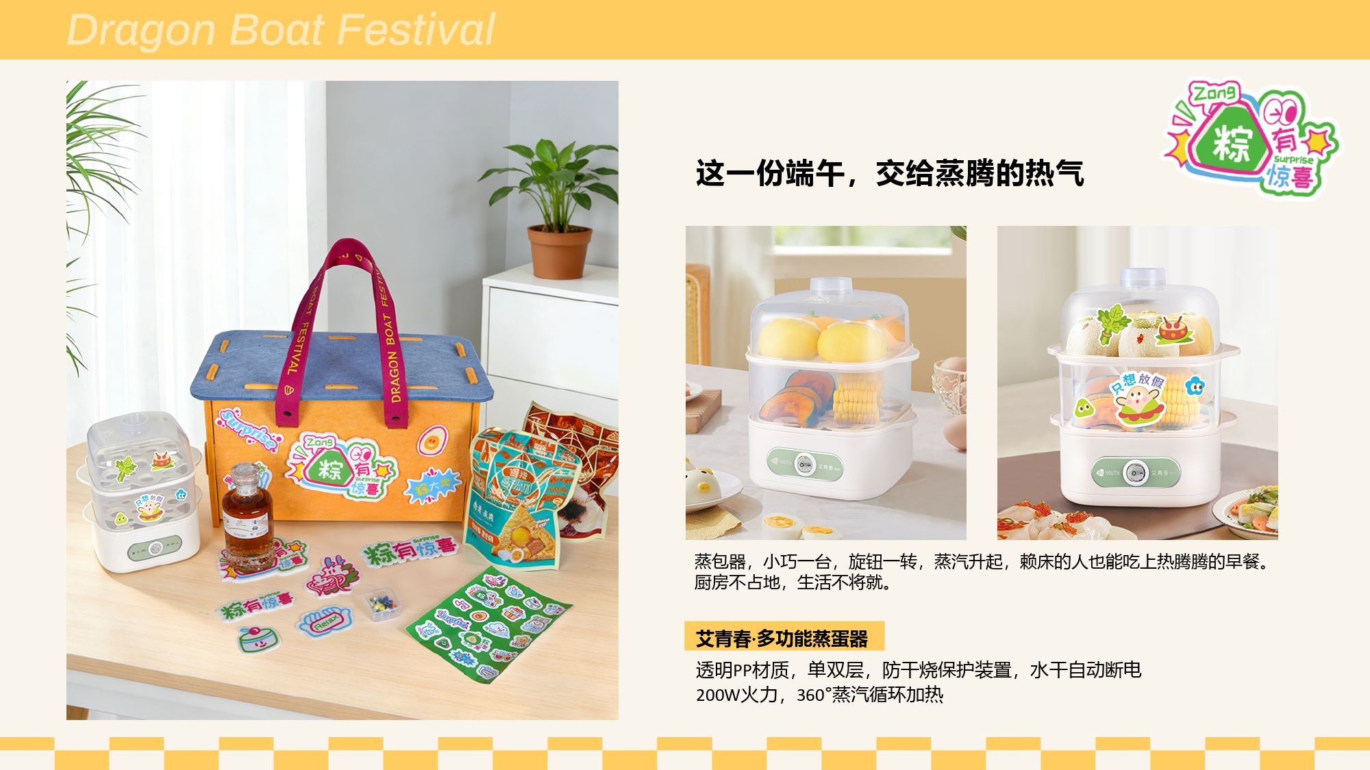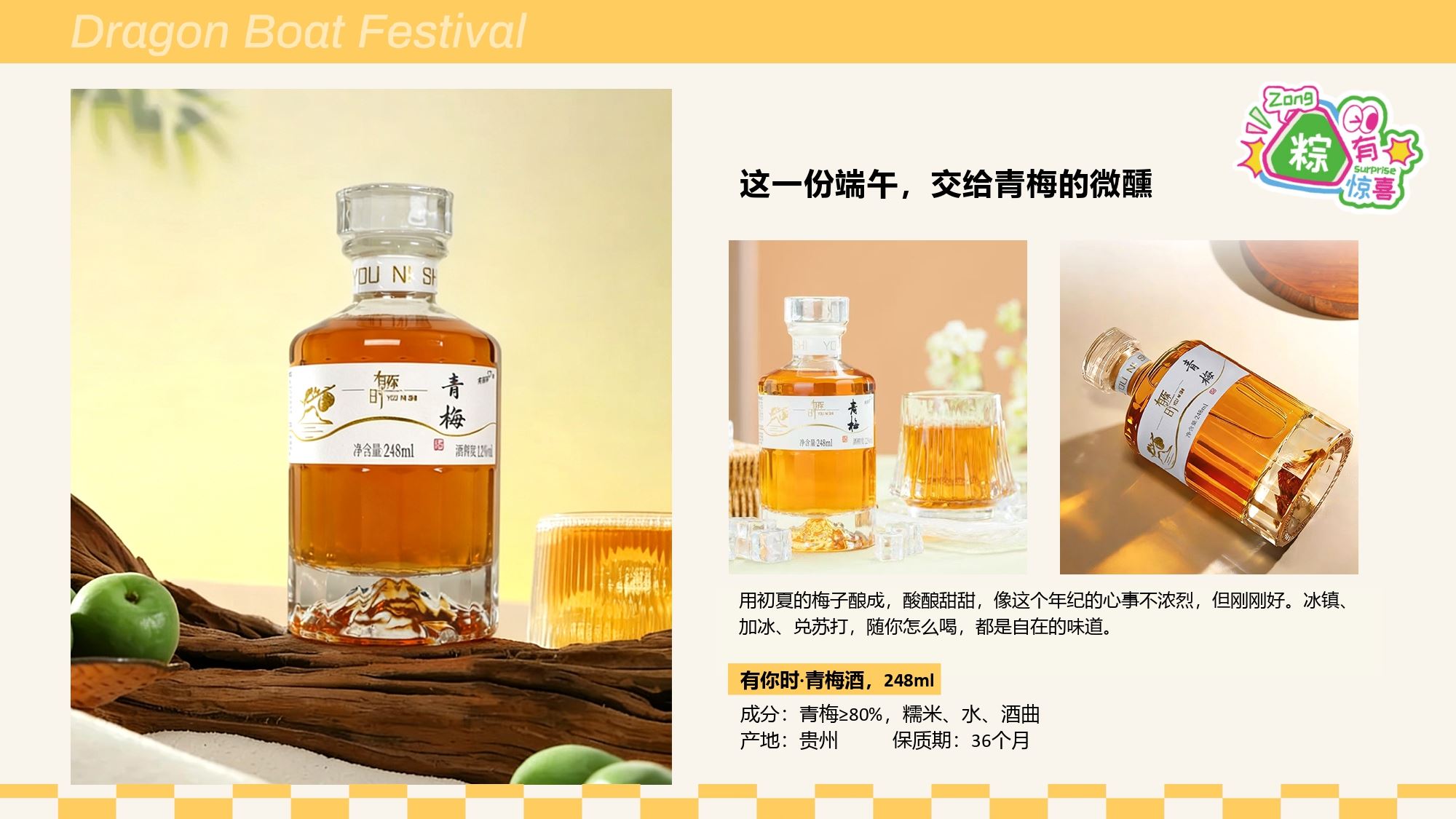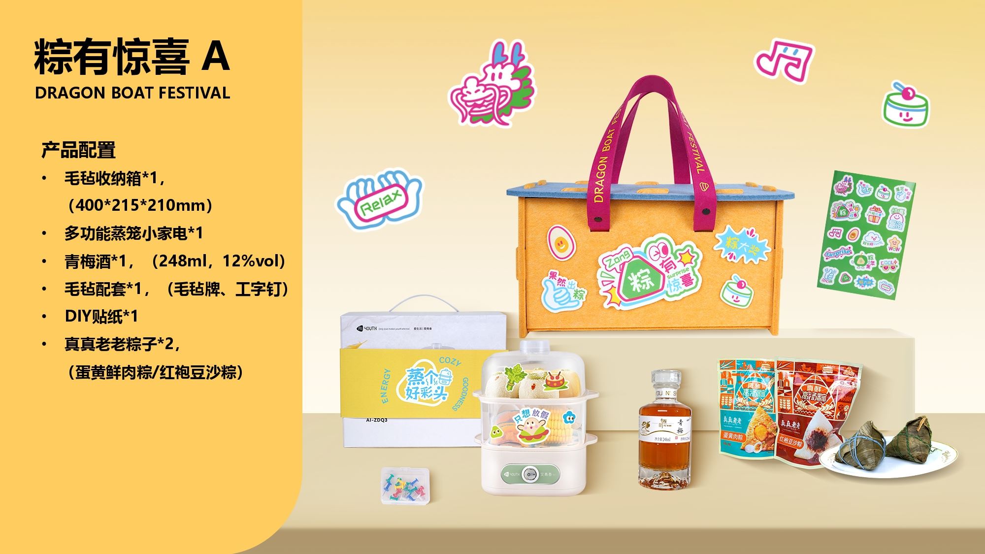 产品配置 毛毡收纳箱*1, (400*215*210mm) 多功能蒸笼小家电*1 青梅酒*1,(248ml,12%vol) 毛毡配套*1,(毛毡牌、工字钉) DIY贴纸*1 真真老老粽子*2, (蛋黄鲜肉粽/红袍豆沙粽)