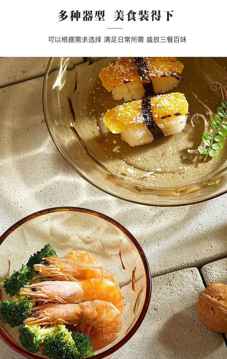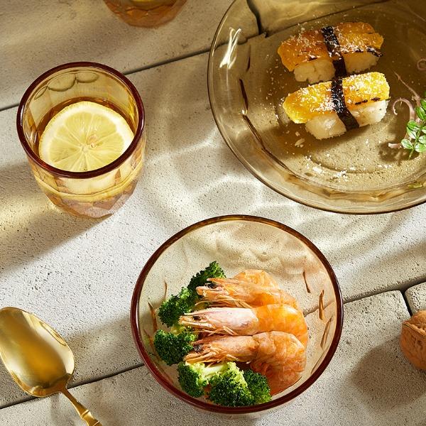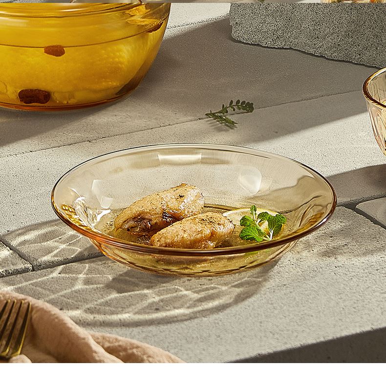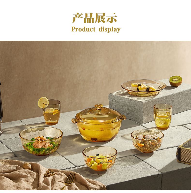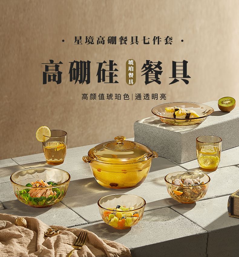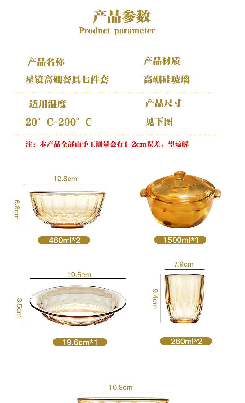 适用温度:-20°C-200°C 材 质:高硼硅玻璃 产品参数:小碗460ml*2、 盘196mm*1、高硼煲*1、大碗*1、水杯*2 彩盒尺寸:413*112*346mm 外箱尺寸:46.8*42.7*36.2cm 产品卖点:1.产品采用高硼色料玻璃材质,颜色与生俱来,永不退色。烤箱、微波炉、冰箱冷冻放心使用。2.星境高硼餐具设计理念,用线条勾勒几何切面,以面为境折射时光、徜徉星空。3.触感温润,品质卓 越,为您的餐桌增添一抹高雅。