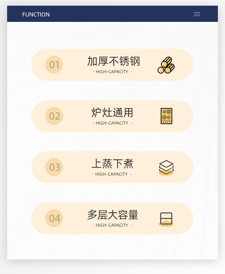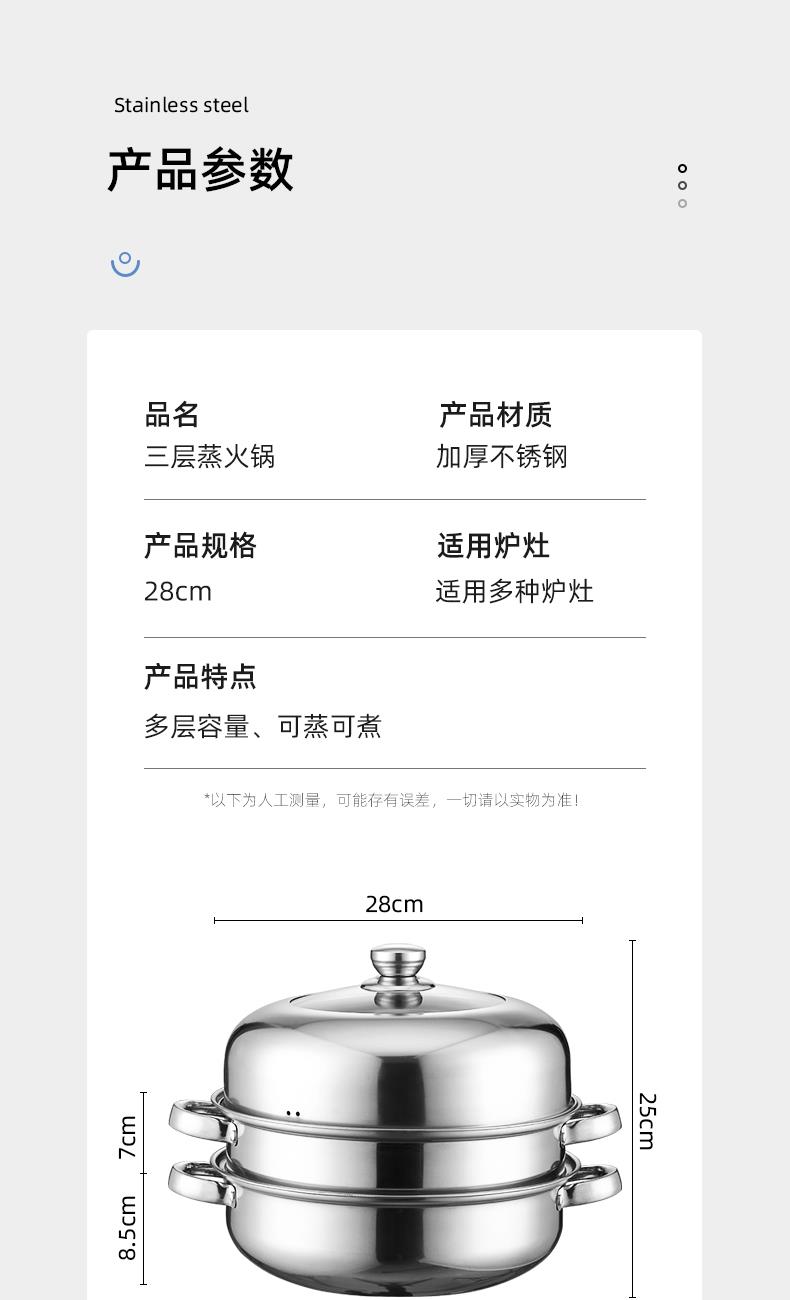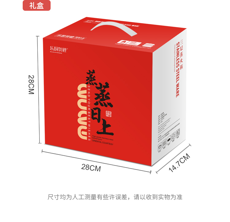 产品规格:28cm 产品材质:410不锈钢 包装方式:opp透明袋+手提彩盒 彩盒尺寸:28*14.7*28CM 外箱尺寸:77*58*58 cm 条 码:6959460801853 上蒸下煮,一锅鲜气带福来,送啥都不如送实用 藏在不锈钢蒸锅里的祝福:日子蒸蒸日上,福气层层叠叠 优质不锈钢,防锈耐腐,结实耐用,使用更安心。 不挑炉灶燃气/电磁炉通用,蒸格拿掉就是火锅 拎起这盒 “蒸蒸日上”,日子像蒸汽般往上蹿,好运不停歇