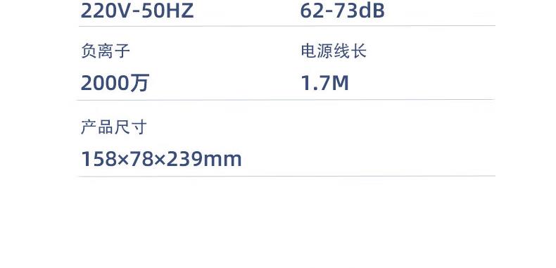 风温档位:4档 护发类型:负离子 电机转速:<30000rpm 特色功能:高速吹风大功率:1800W-2000W