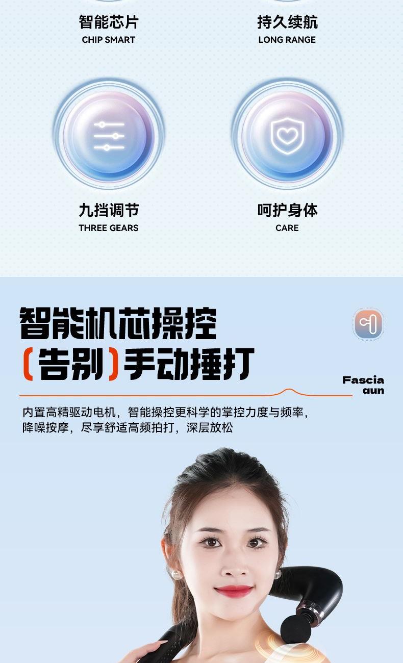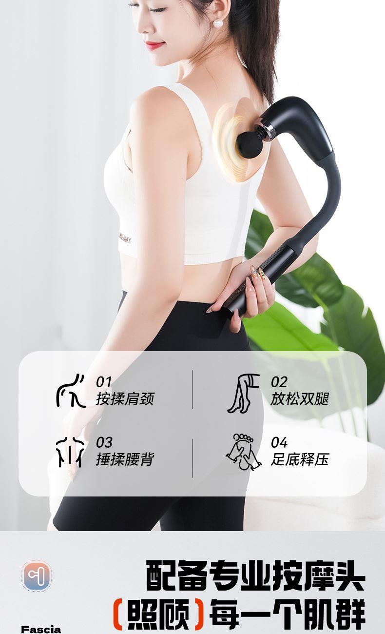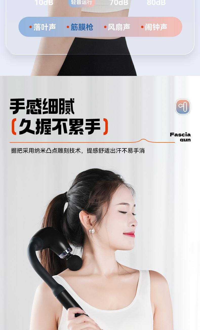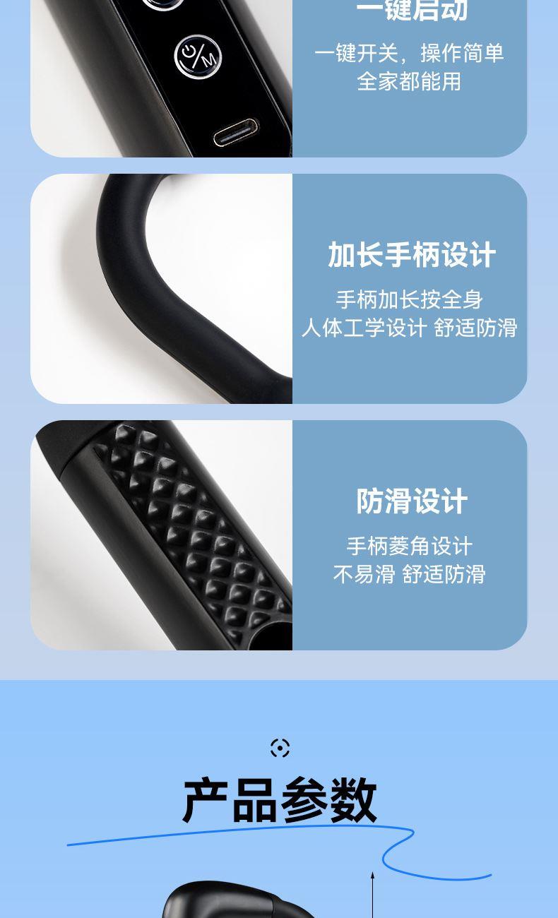 主机尺寸:34*25*5CM 产品材质:ABS+锂电池+电机+硅胶 充电方式:USB 颜色:黑色 电池容量:1500MA 档位:9种模式/9档力度额定电压:5V-1A 额定功率:20W 充电时间:2-3小时 空载时间:40分钟(一档) 负载时间:30-35分钟(一档) 电机有刷铜丝电机555电机 加长手柄设计,全身按摩自有 四款专业按摩头,照顾每一个肌群 低噪音不饶人,45db细语静享放松