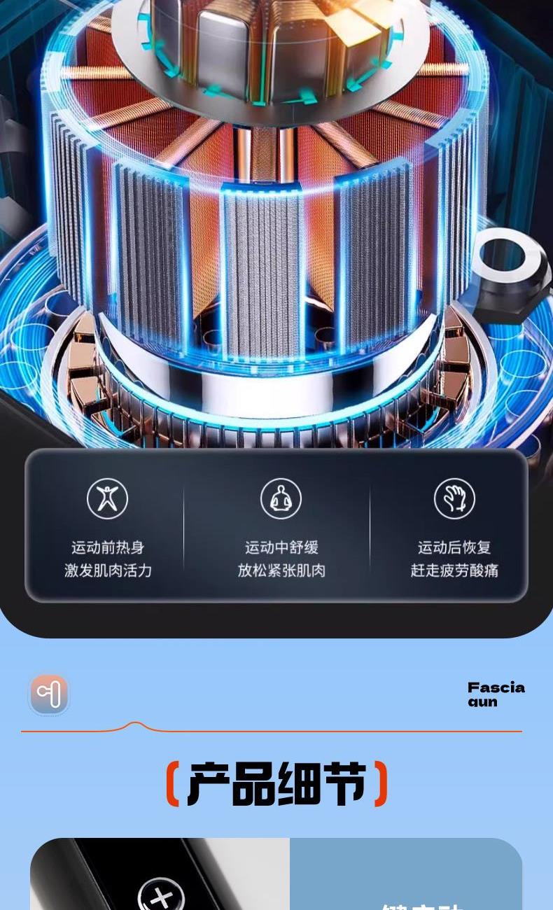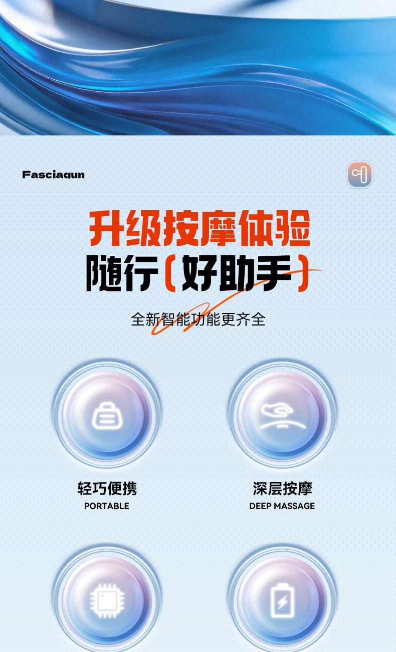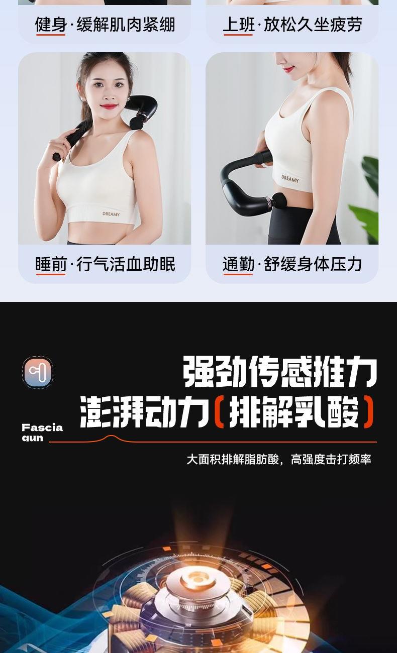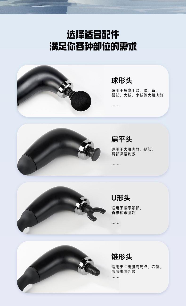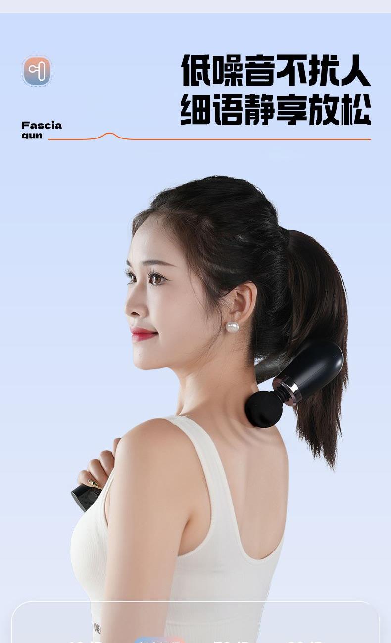 主机尺寸:34*25*5CM 产品材质:ABS+锂电池+电机+硅胶 充电方式:USB 颜色:黑色 电池容量:1500MA 档位:9种模式/9档力度额定电压:5V-1A 额定功率:20W 充电时间:2-3小时 空载时间:40分钟(一档) 负载时间:30-35分钟(一档) 电机有刷铜丝电机555电机 加长手柄设计,全身按摩自有 四款专业按摩头,照顾每一个肌群 低噪音不饶人,45db细语静享放松