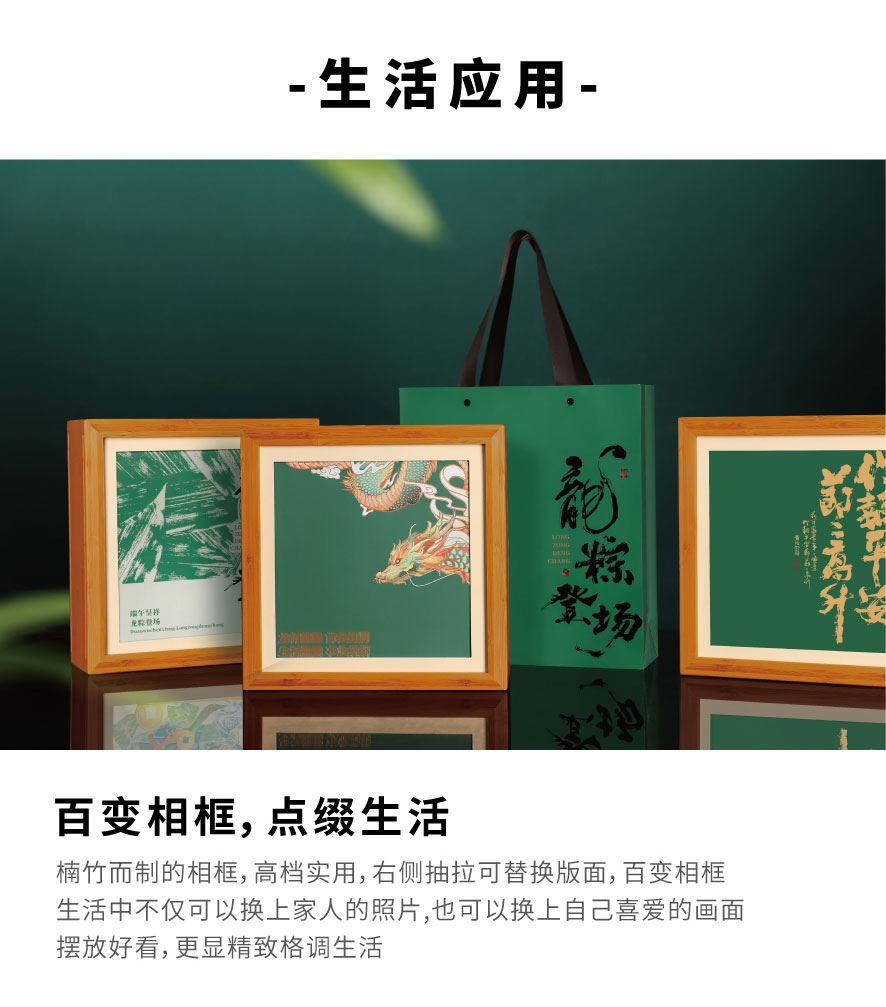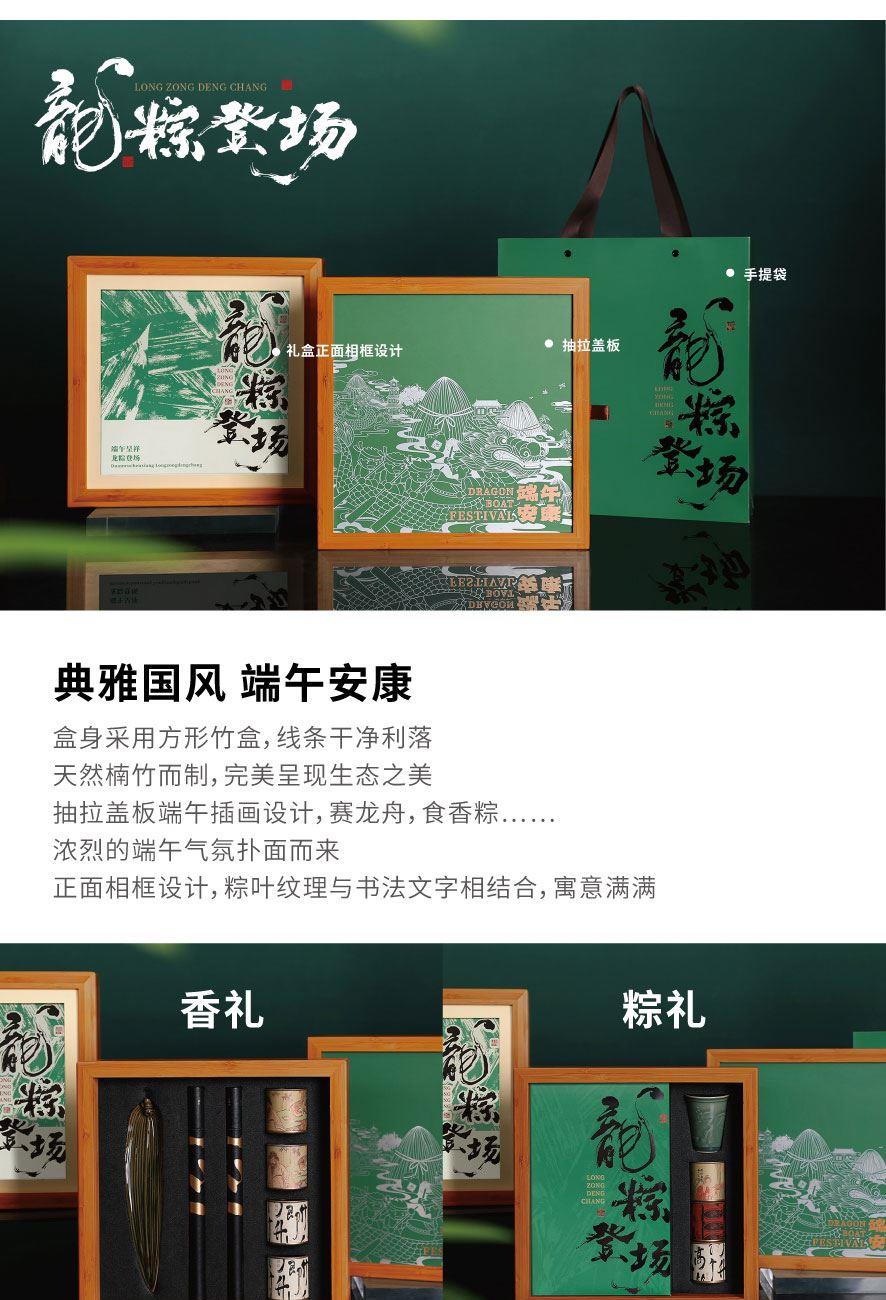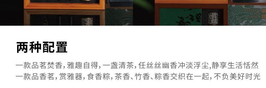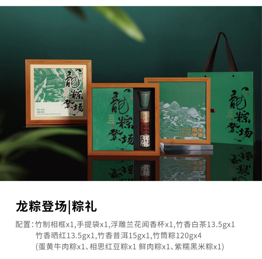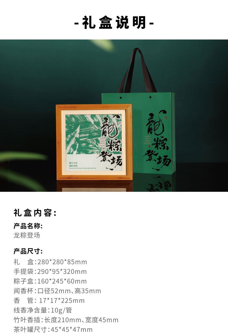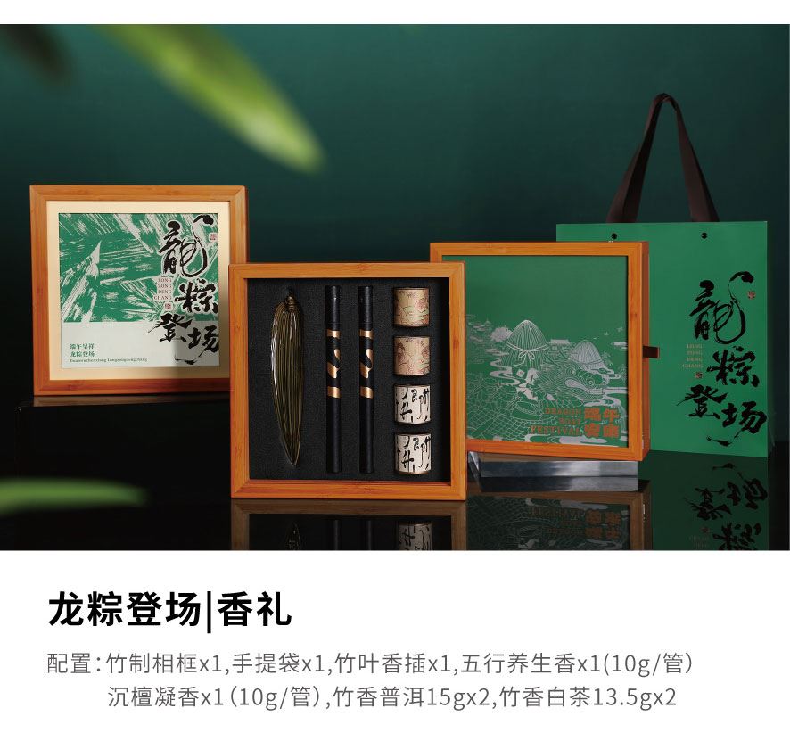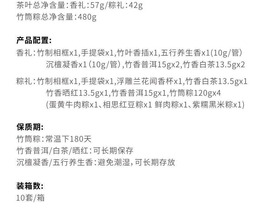 产品尺寸: 礼 盒:280*280*85mm 手提袋:290*95*320mm 粽子盒:160*245*60mm 闻香杯:口径52mm、高35mm 香 管:17*17*225mm 线香净含量:10g/管 竹叶香插:长度210mm、宽度45mm 茶叶罐尺寸:45*45*47mm 茶叶总净含量:香礼:57g/粽礼:42g 竹筒粽总净含量:480g 产品配置: 香礼:竹制相框x1,手提袋x1,竹叶香插x1,五行养生香x1(10g/管)沉檀凝香x1(10g/管),竹香普洱15gx2,竹香白茶13.5gx2 粽礼:竹制相框x1,手提袋x1,浮雕兰花闻香杯x1,竹香白茶13.5gx1竹香晒红13.5gx1,竹香普洱15gx1,竹筒粽120gx4 (蛋黄牛肉粽x1、相思红豆粽x1鲜肉粽x1、紫糯黑米粽x1) 保质期: 竹筒粽:常温下180天 竹香普洱/白茶/晒红:可长期保存 沉檀凝香/五行养生香:避免潮湿,可长期存放