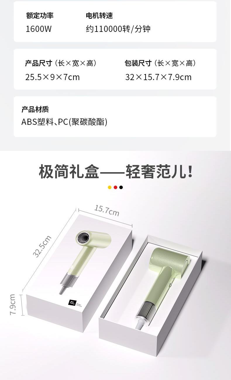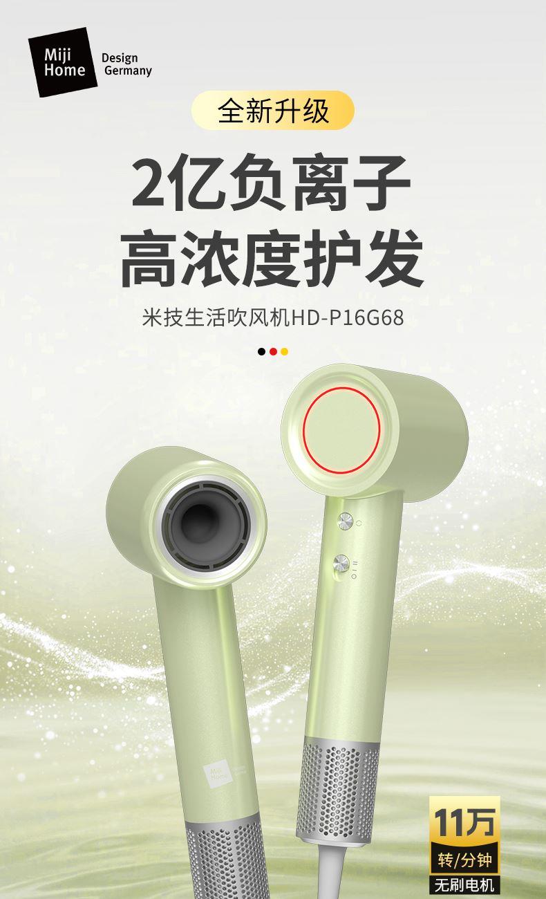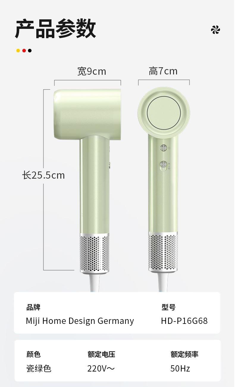 米技生活(Design Germany) 商品编号:72226544218 特色功能:高速吹风 功率:800W-2000W(含) 护发类型:负离子 认证型号:HD-P16G68 热风档位:三档 风速:20m/s 额定功率:1600W