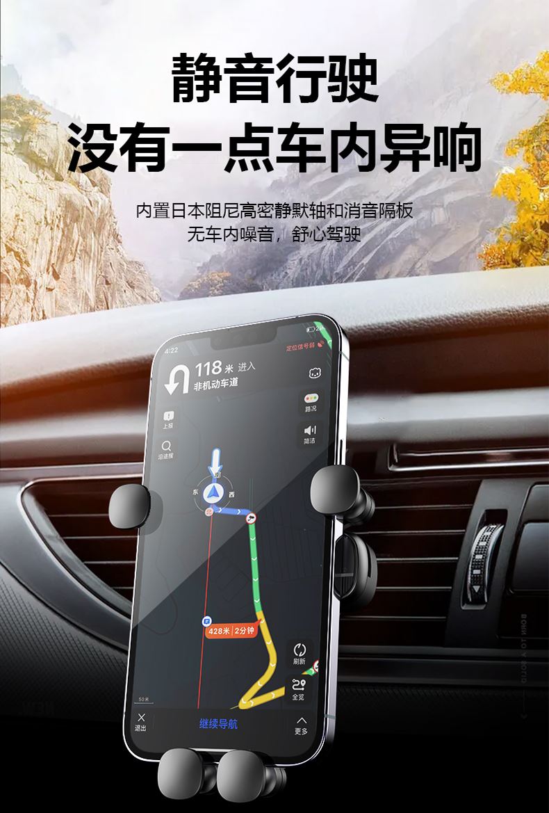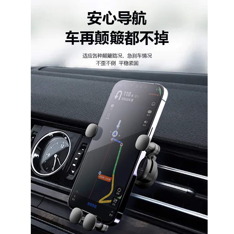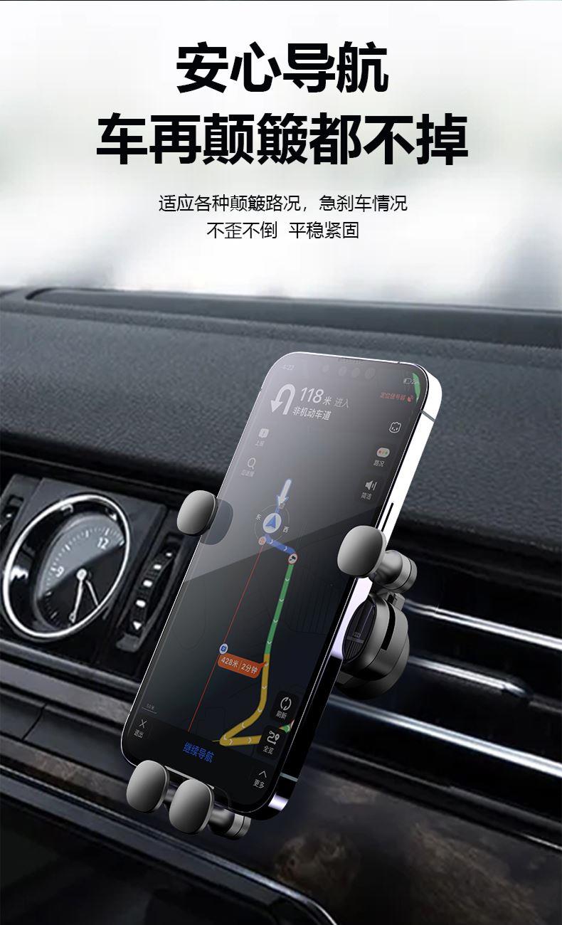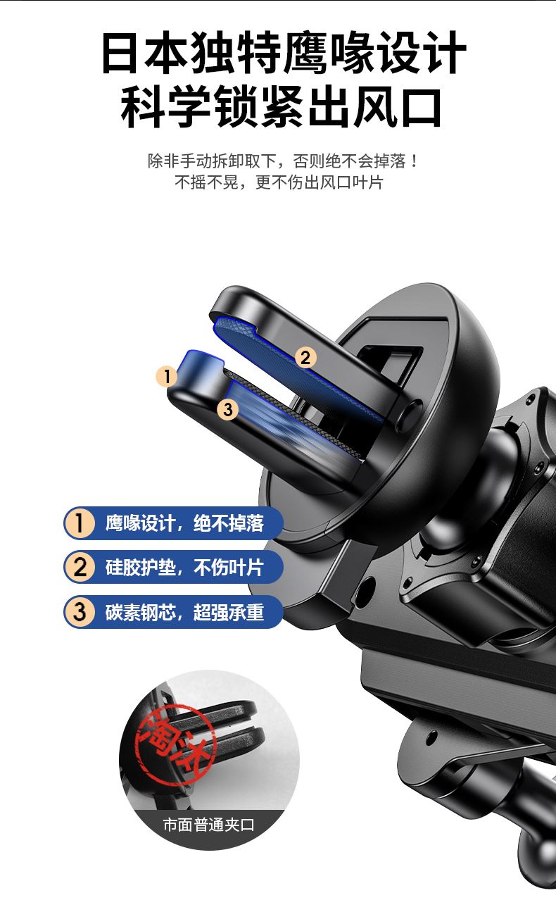 产品尺寸:11.5*4*9.5cm 产品颜色:黑色 绿色 红色 银色 材 料:ABS+PC+硅胶 适用设备:4.7-7英寸手机 产品净重: 48g 安装方式: 出风口夹装式 产品特点 特点一:碳素钢芯 超强承重 特点二:不挡视线 安全驾驶 特第三:方便快捷 单手秒取妙放