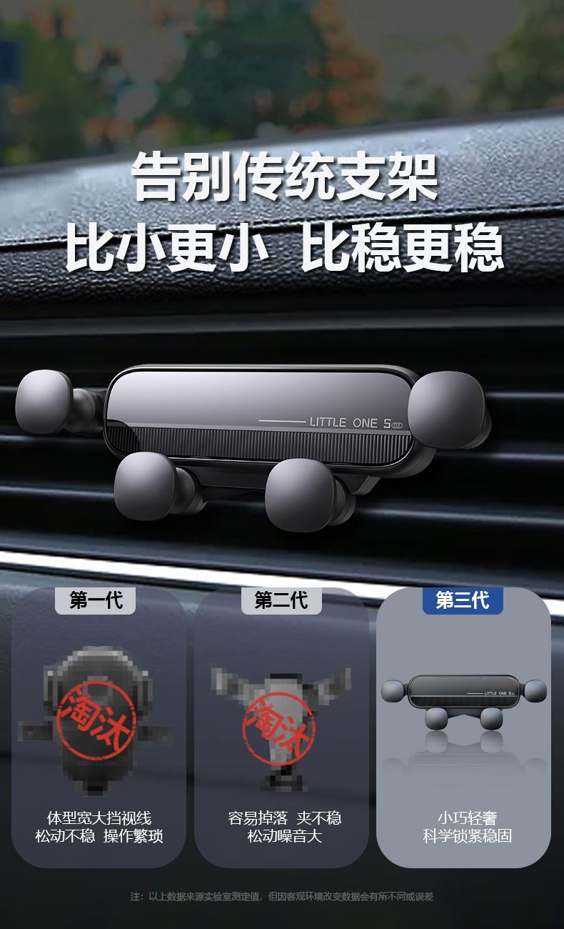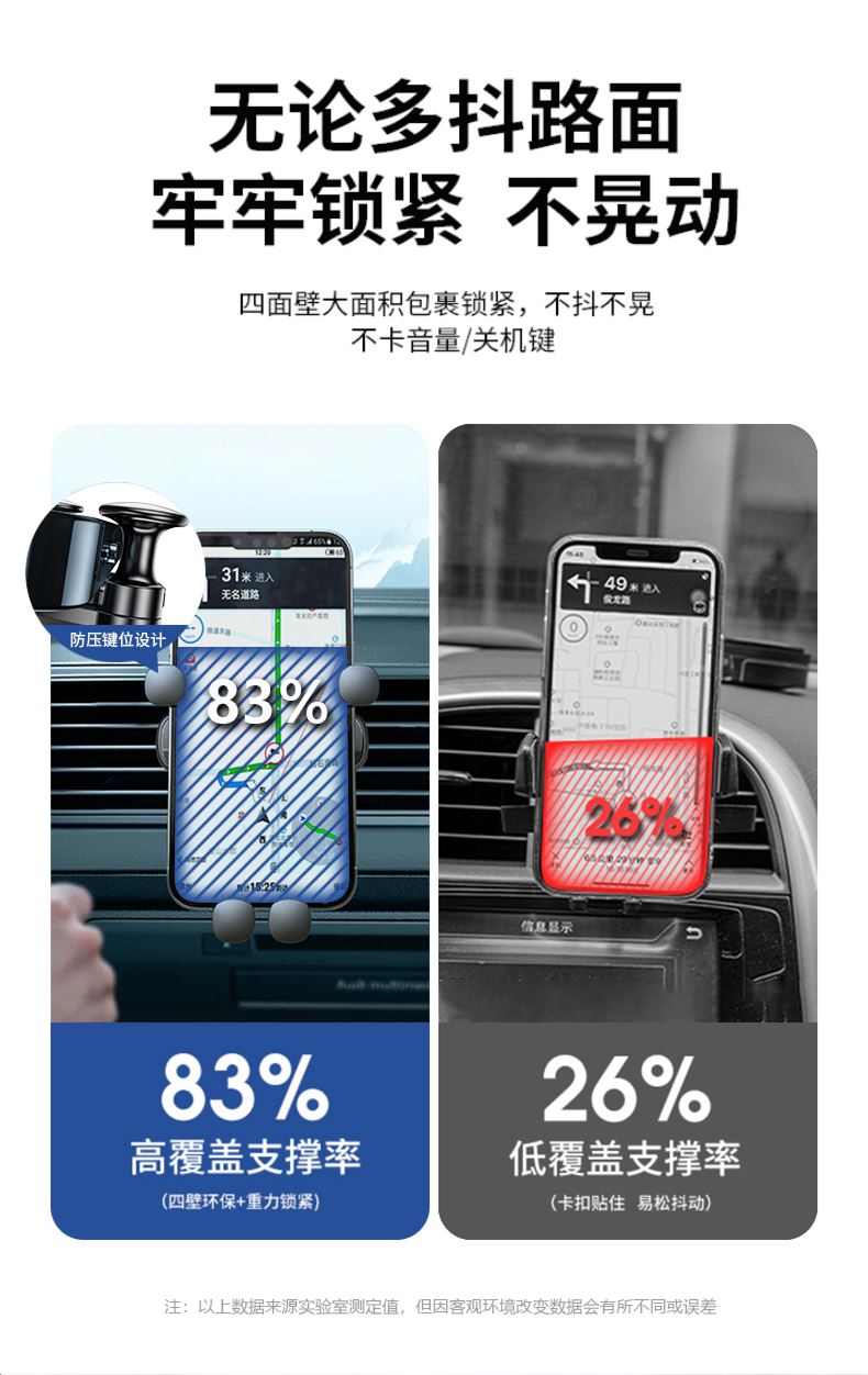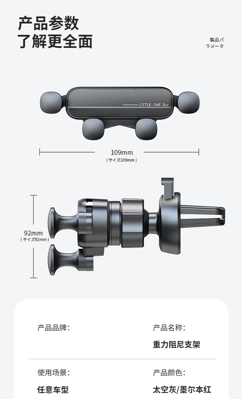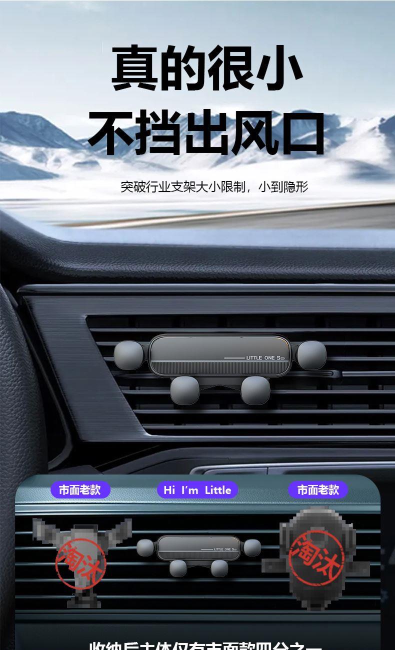 产品尺寸:11.5*4*9.5cm 产品颜色:黑色 绿色 红色 银色 材 料:ABS+PC+硅胶 适用设备:4.7-7英寸手机 产品净重: 48g 安装方式: 出风口夹装式 产品特点 特点一:碳素钢芯 超强承重 特点二:不挡视线 安全驾驶 特第三:方便快捷 单手秒取妙放