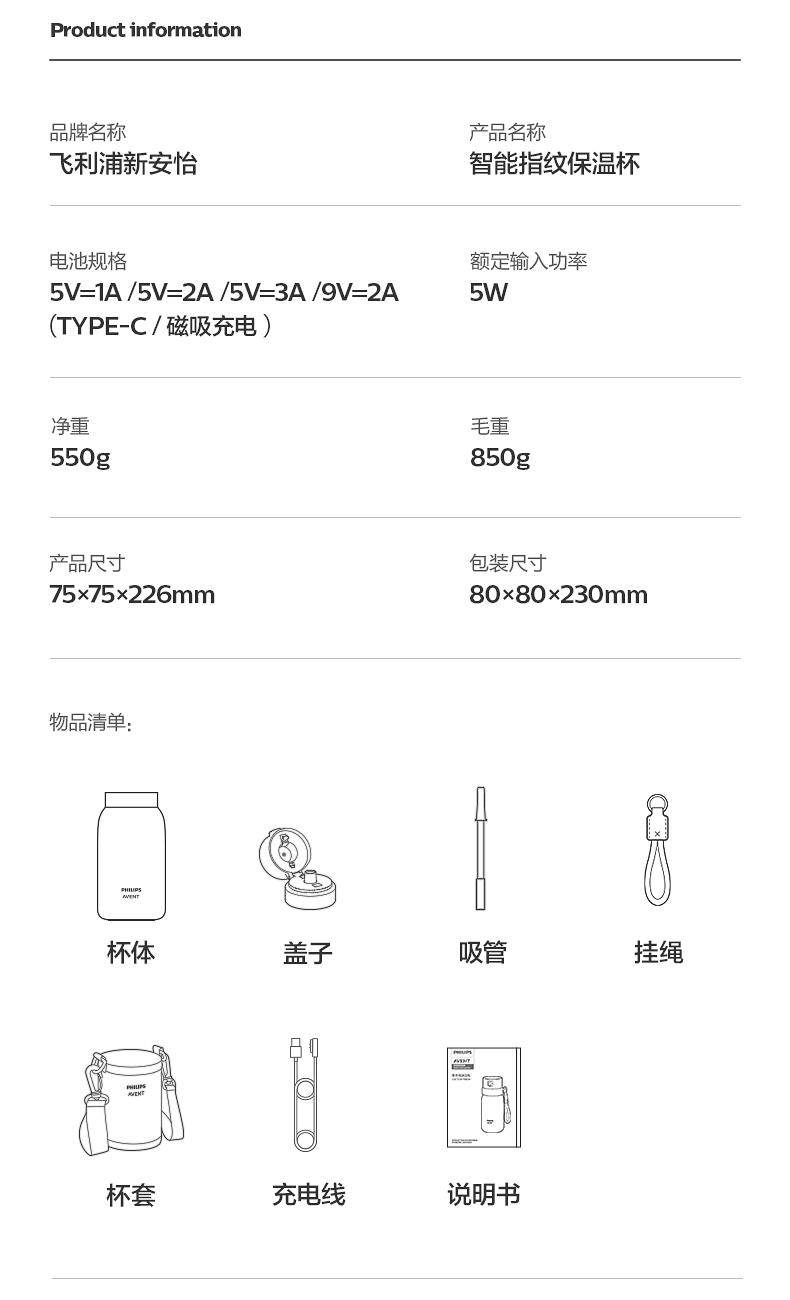 飞利浦新安怡智能指纹保温杯-北极白(Y-ZWS02)