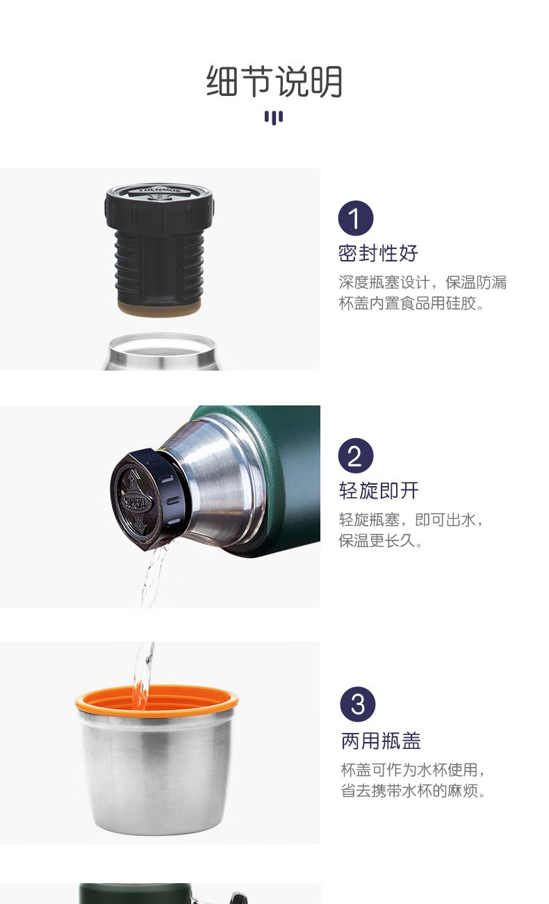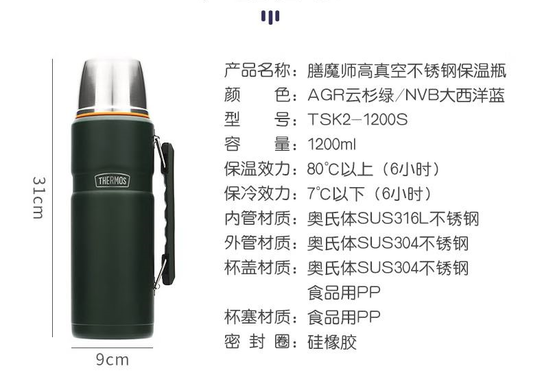 颜 色:AGR云杉绿 NVB大西洋蓝 容 量:1200ml 类 型:旅行壶 定 制:可以定制 材 质:316钢 保 温:6小时大约60°C 保 冷:6小时大约10°C