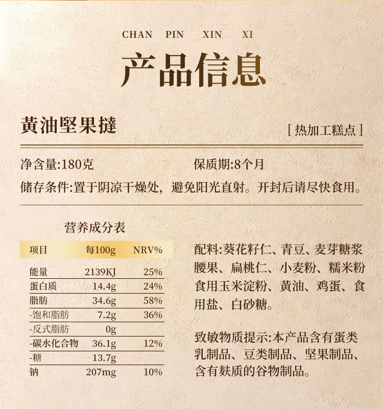 采用法国进口总统黄油,添加4大坚果,饱满果仁,甜而不腻