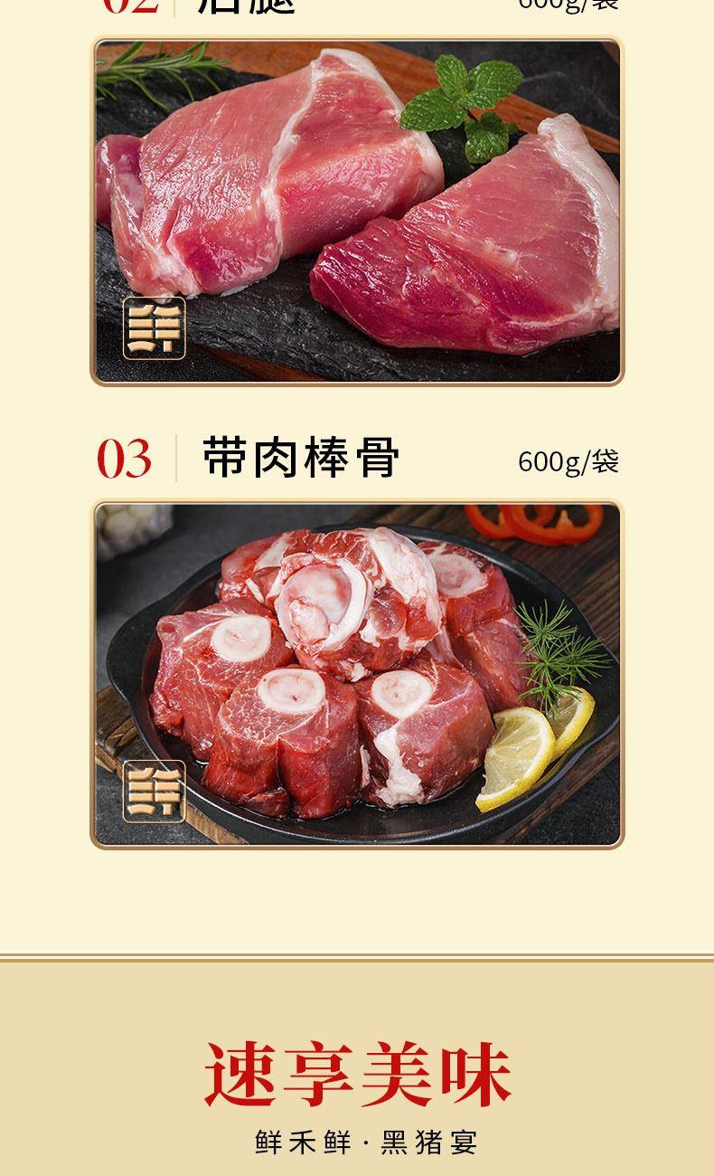 冰鲜黑猪前腿 600g*2袋 冰鲜黑猪后腿 600g*1袋 冰鲜黑猪带肉棒骨 600g*1袋