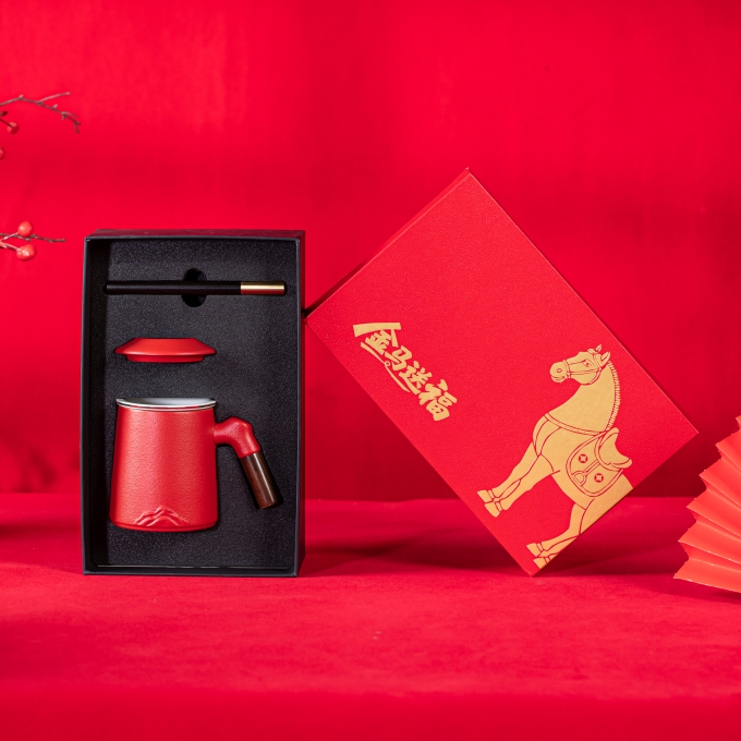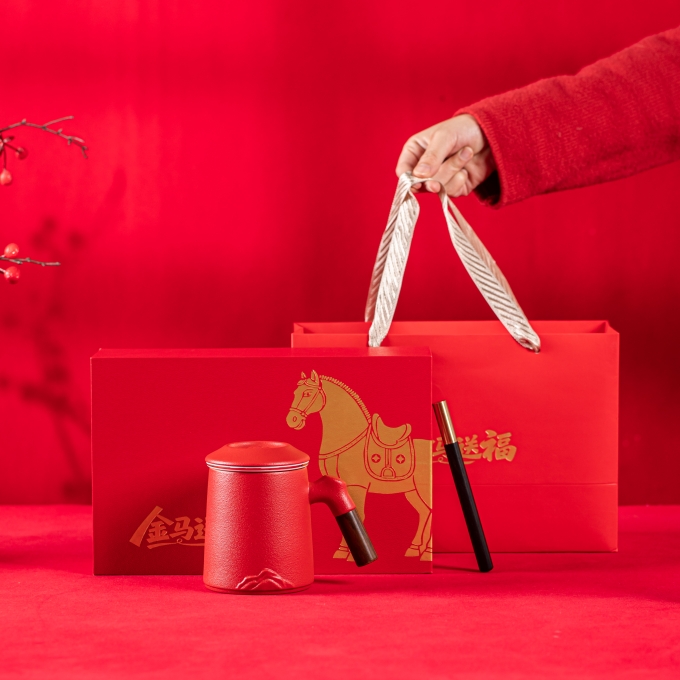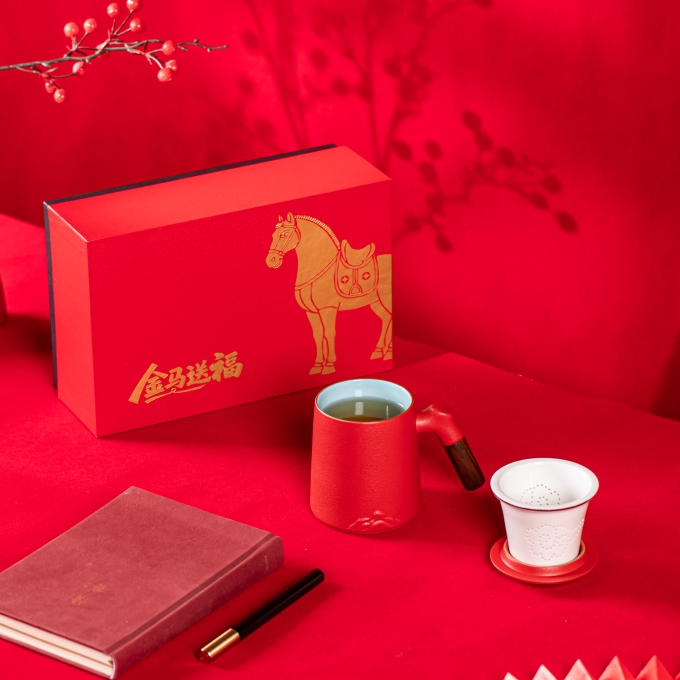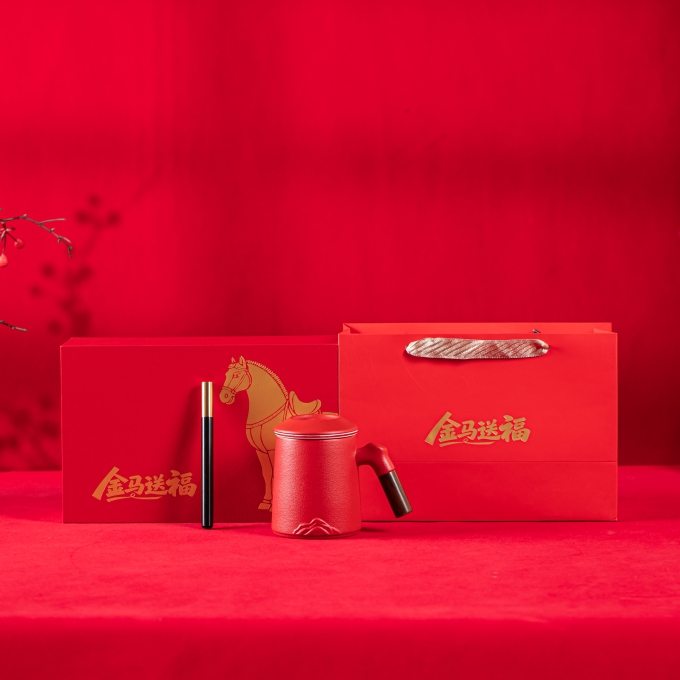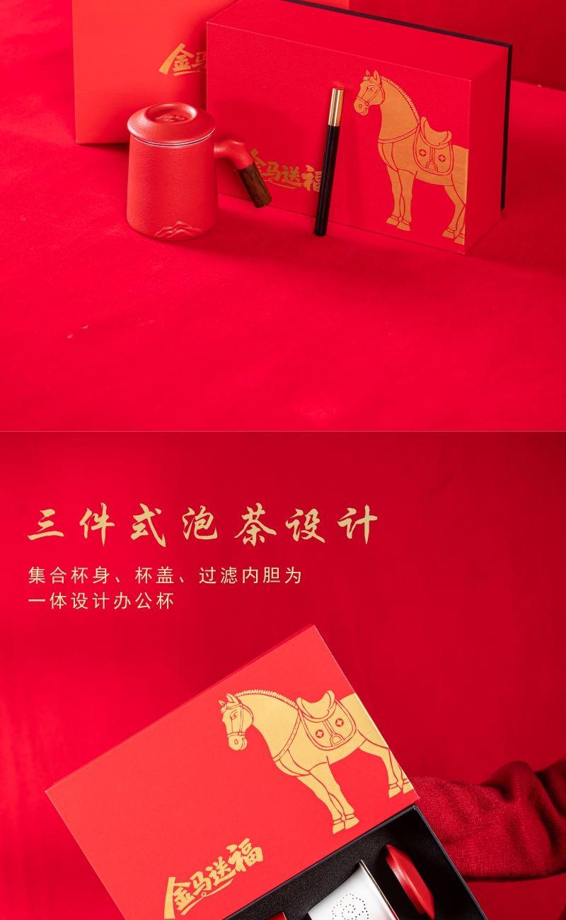 产品配置:办公杯(过滤内胆)x1 、签字笔x1 、礼盒礼袋x1 产品规格:办公杯145*110mm容量*400ml、签字笔147*11mm 产品重量:1.02kg 产品毛重:1.40kg 产品特点: 1、金马礼盒,新年礼的满分选择; 2、美学:金马纹样藏福韵; 3、实用:茶具套装好上手; 4、体面:礼盒包装显心意。