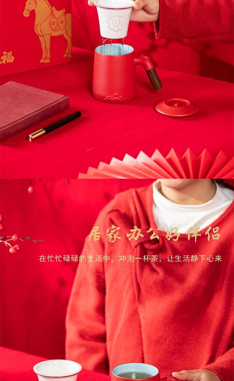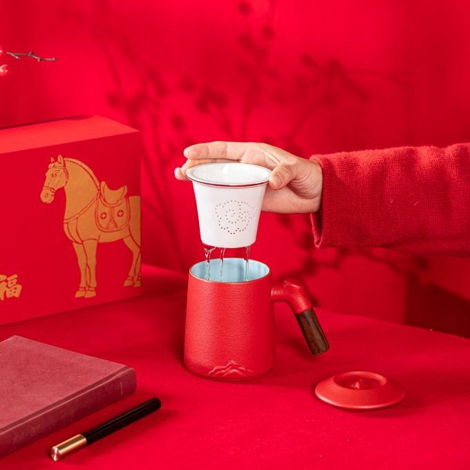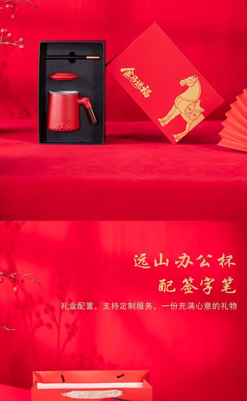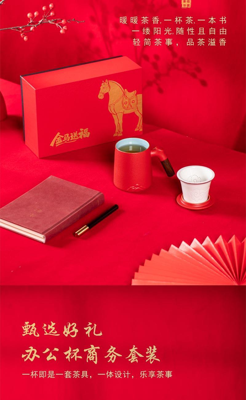 产品配置:办公杯(过滤内胆)x1 、签字笔x1 、礼盒礼袋x1 产品规格:办公杯145*110mm容量*400ml、签字笔147*11mm 产品重量:1.02kg 产品毛重:1.40kg 产品特点: 1、金马礼盒,新年礼的满分选择; 2、美学:金马纹样藏福韵; 3、实用:茶具套装好上手; 4、体面:礼盒包装显心意。