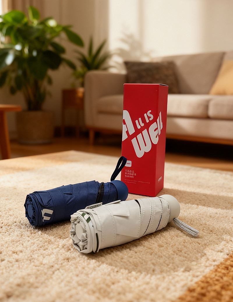产品内容 1、 五折六骨晴雨伞×1 伞下直径90CM 合金纤维骨架 2、 小确幸口袋杯×1 304内胆 PP杯盖 200毫升容量 外盒: 25×14×7cm 小确幸主题口袋杯+小号晴雨伞主题伞