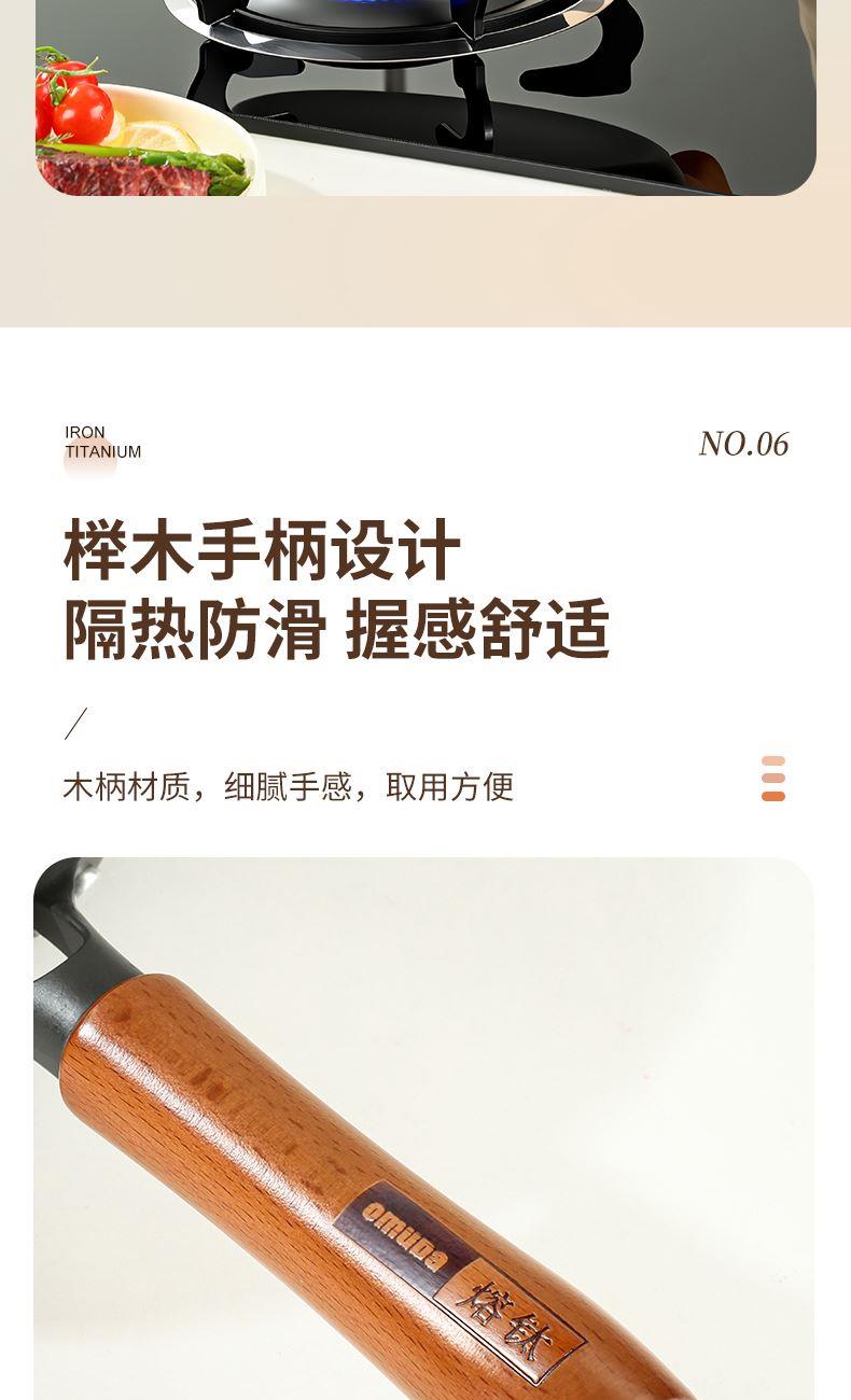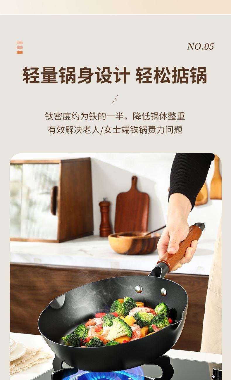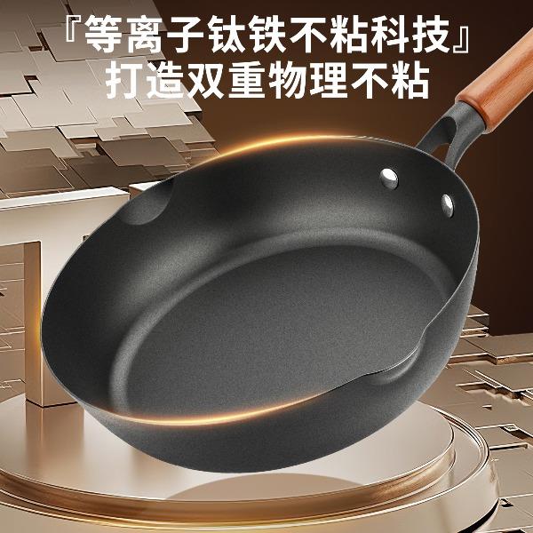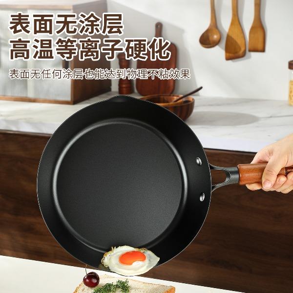 直径:26cm 净重:1.56kg 材质:精铁熔钛 ①等离子钛铁不粘科技,打造双重物理不粘 ② 铁钛熔合,材质更健康,10000°C+等离子熔覆微孔不粘 ③ 高温等离子硬化,表面无涂层,耐刮耐磨,可使用金属铲 ④ 锅体旋压工艺,底厚壁薄,有效提升密度的同时,不粘性能更优 ⑤轻量锅身设计,轻松掂锅 ⑥榉木手柄设计,隔热防滑,握感舒适