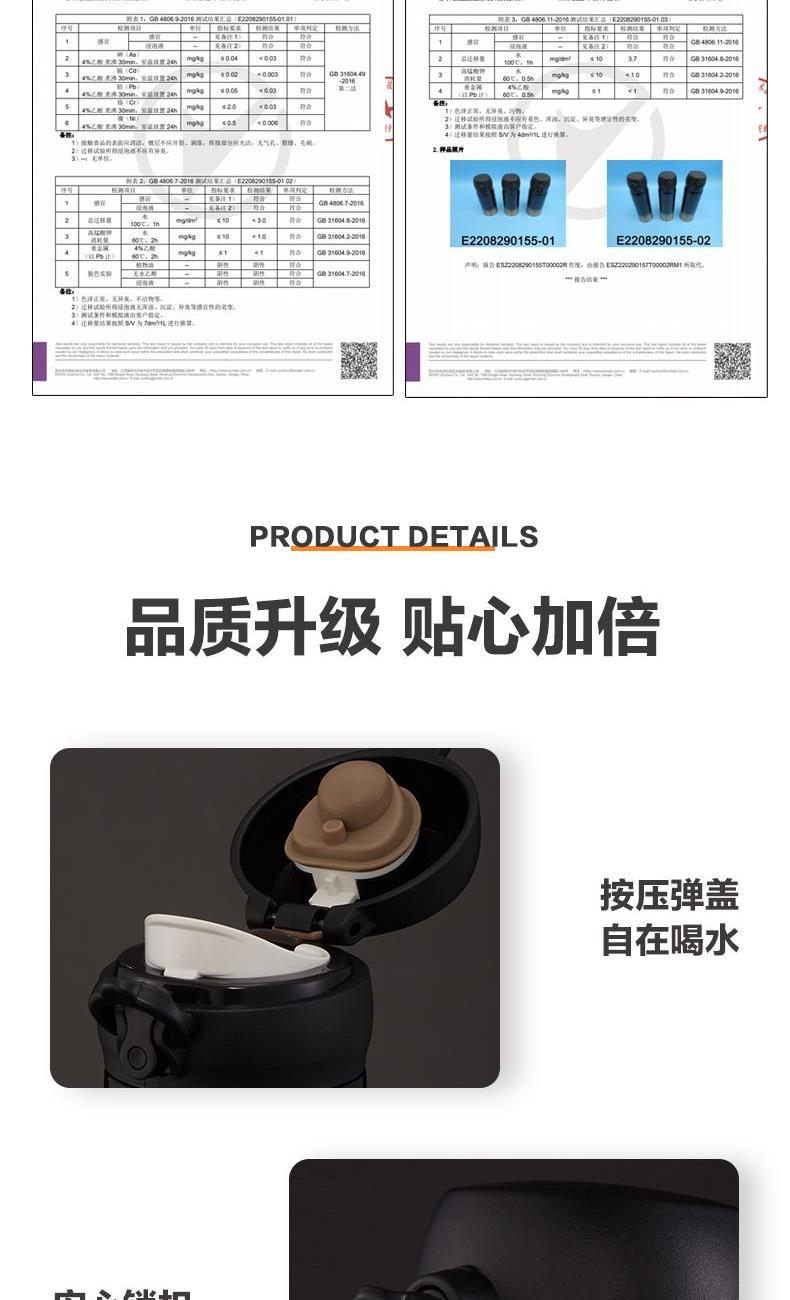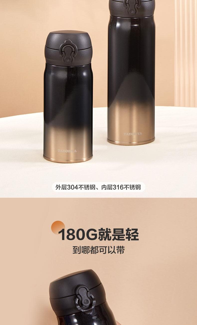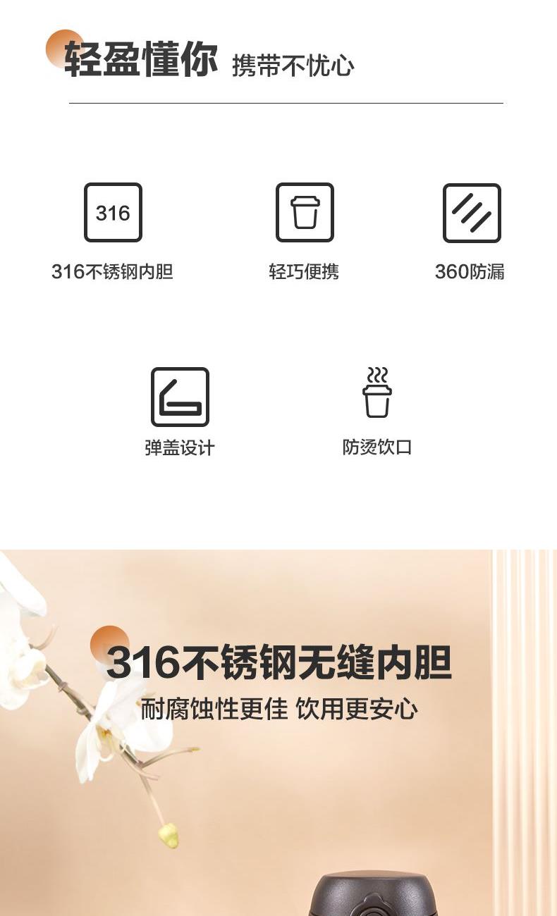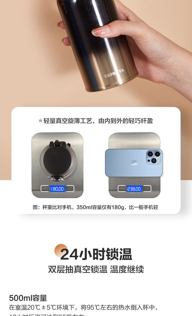 材质:外层304不锈钢,内层316不锈钢 规格:500ml,208g 特点:316不锈钢内胆,耐腐蚀性更佳,饮用更安心;双层抽真空锁温,温度继续;超轻便携;安心锁扣加硅胶圈,密封不滴漏;一键弹盖,防烫饮口。