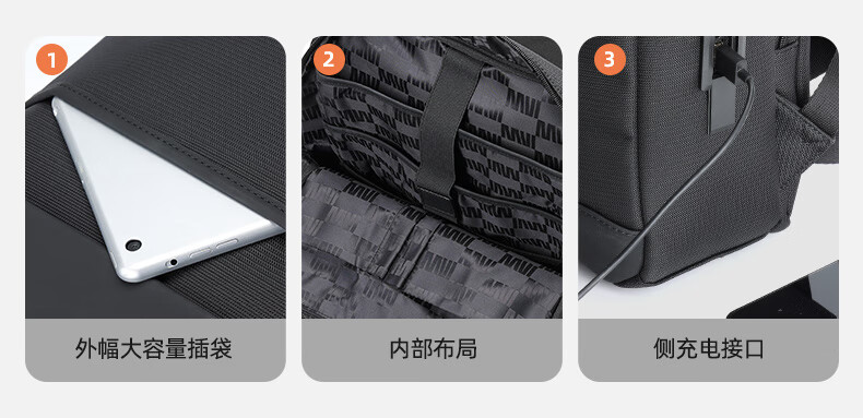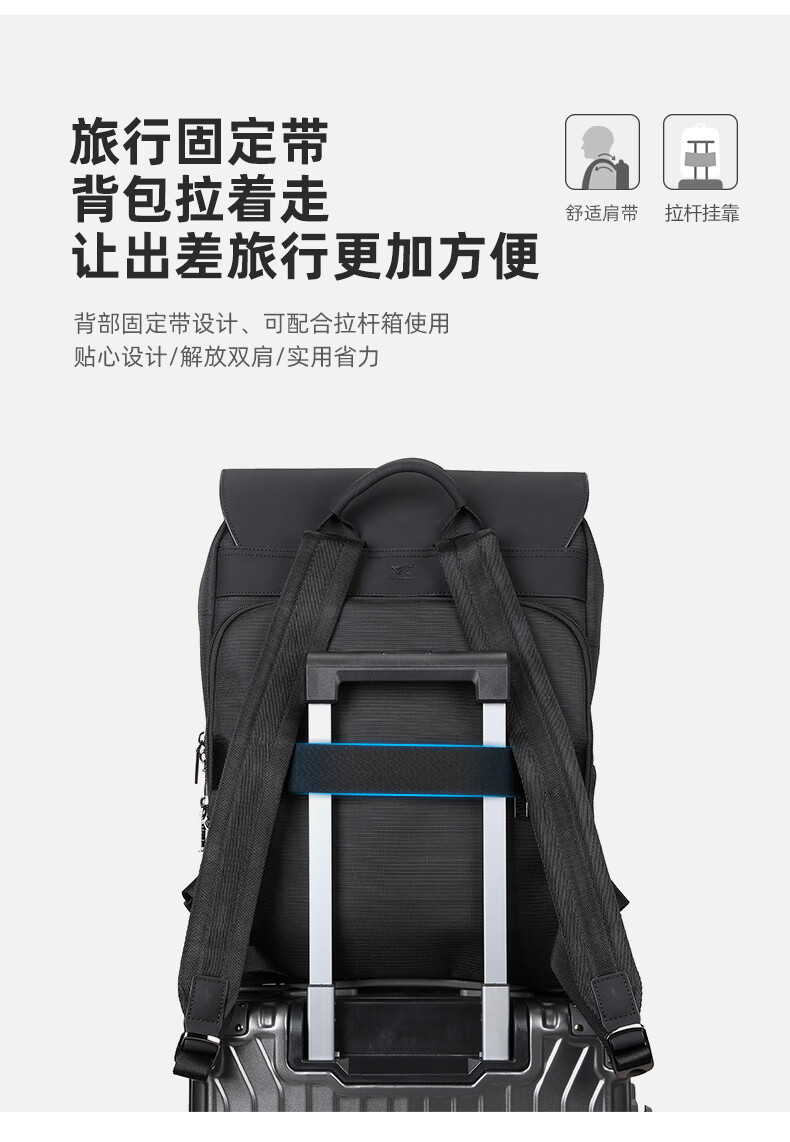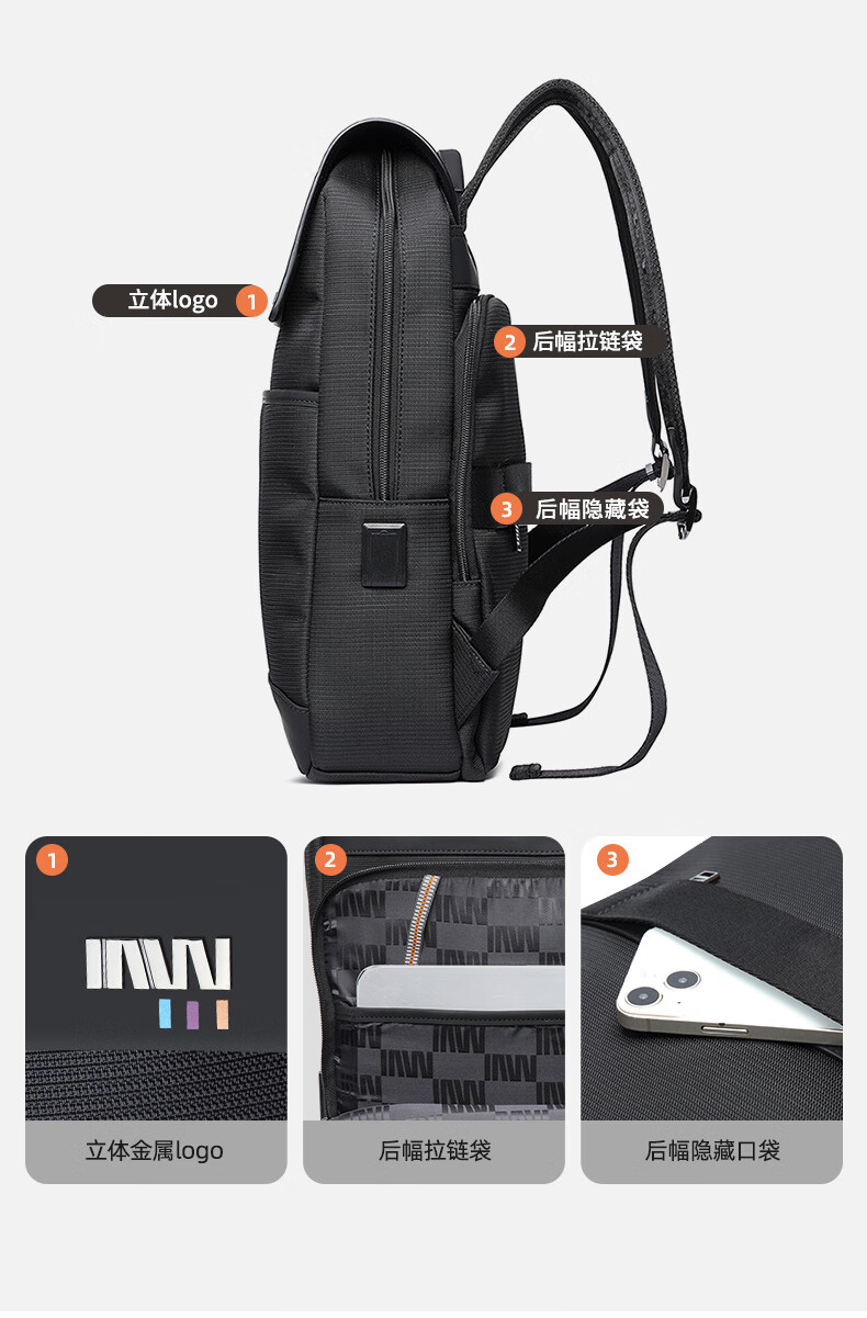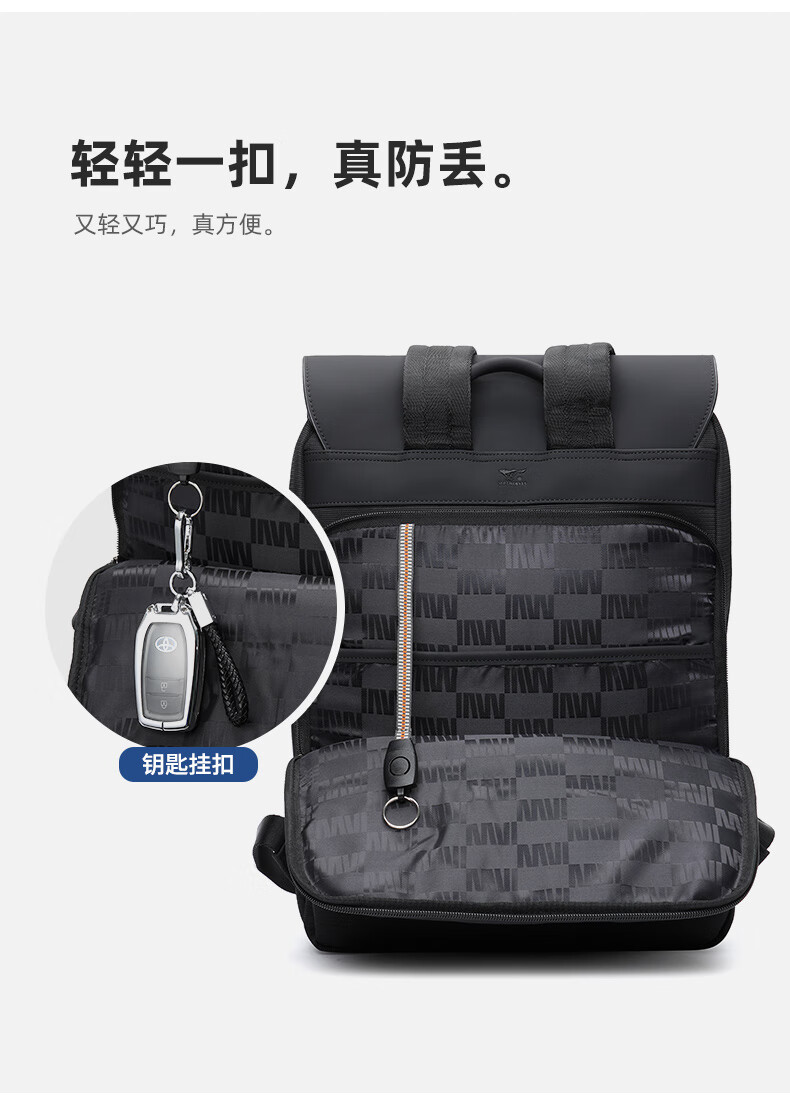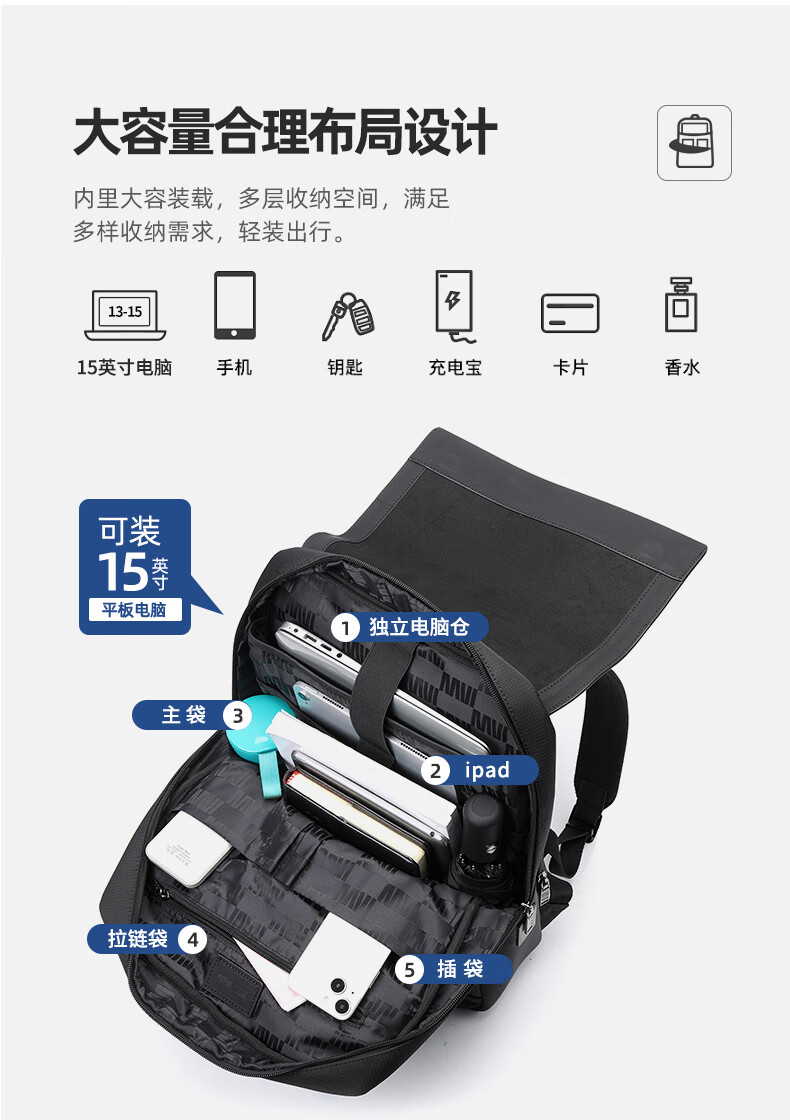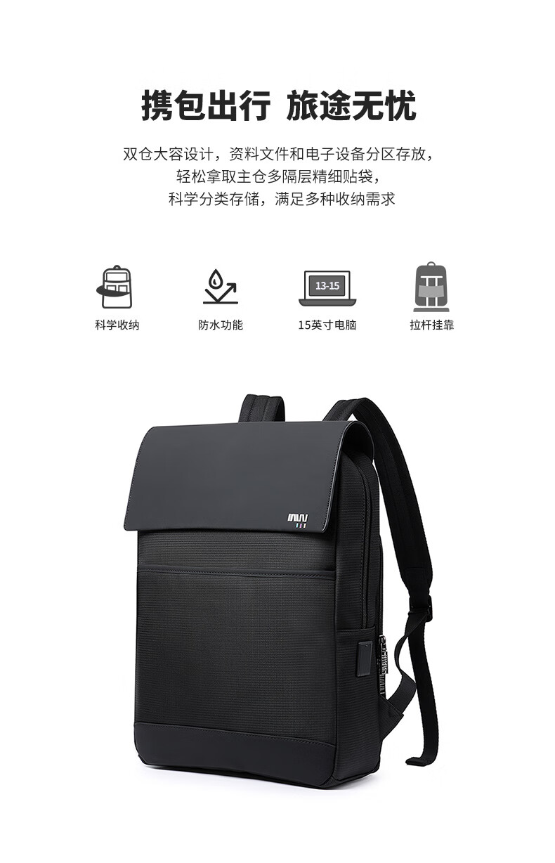 类别:背包 外部材质:织物 闭合方式:翻盖式 规格:305x100x390mm 容纳电脑尺寸:15英寸 风格:通勤风 商务风 携包出行,旅途无忧,立体挺括包型兼顾时尚外观与功能性,轻松驾驭多种都市出行场景 内里大容装载,多层收纳空间,满足多样收纳需求,轻装出行,采用高密度织物面料,防刮耐用,防泼贱,轻松应对泼水,便携外置USB充电接口,3D透气蜂窝设计,柔软减压肩带
