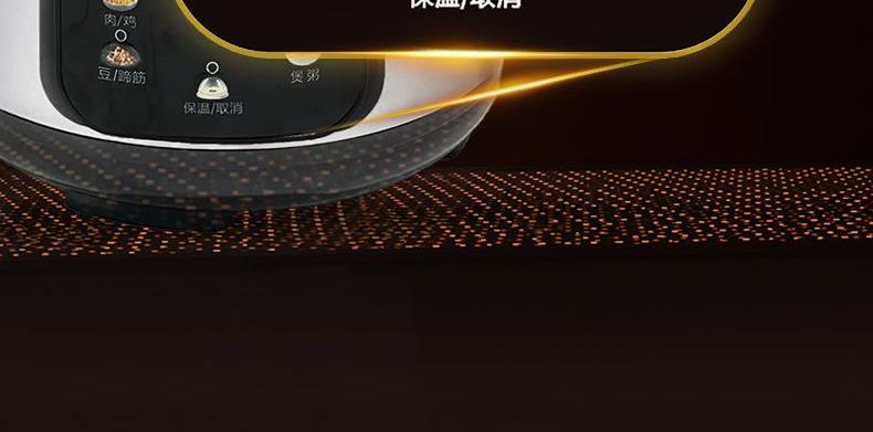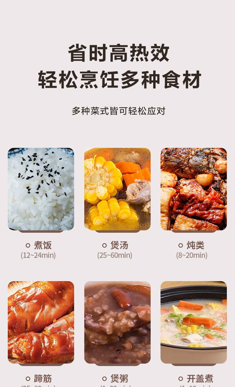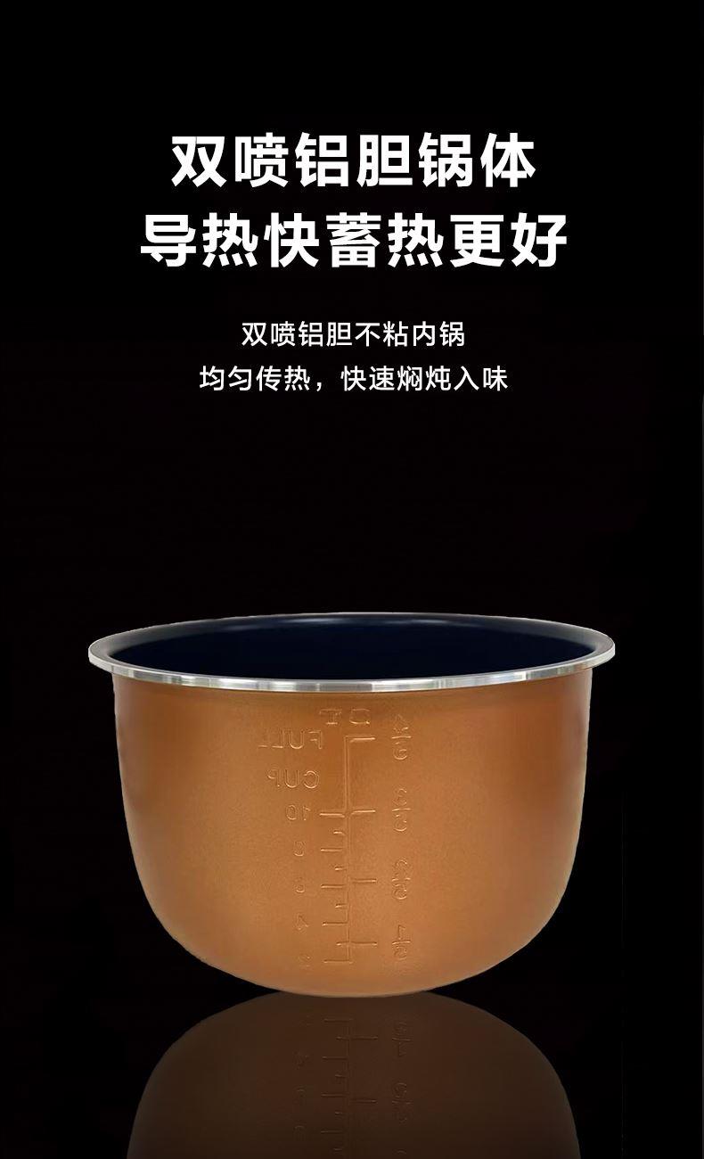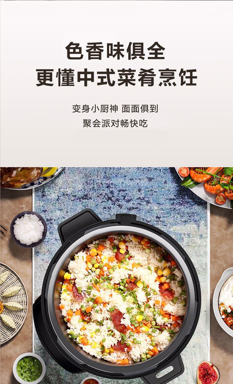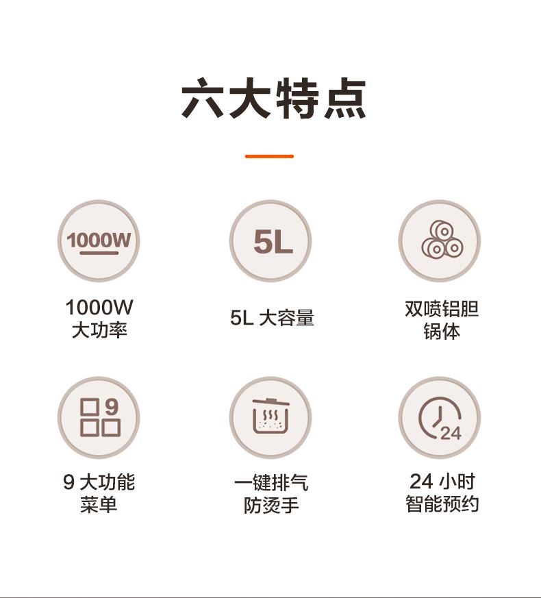 1.高压烹制:高压高温,速热入味,充分保留食材本味营养,汤浓饭香。 2.黄金容量:5L黄金大容量,多种烹饪功能,解锁花样美味。 3.智能触控: 智能触控操作,一键烹饪,轻松操作。 4.智能预约:24H长效预约,提前预约,准点开饭。 5.双喷铝胆:导热快一倍,防刮耐用,炖煮不粘不糊锅。
