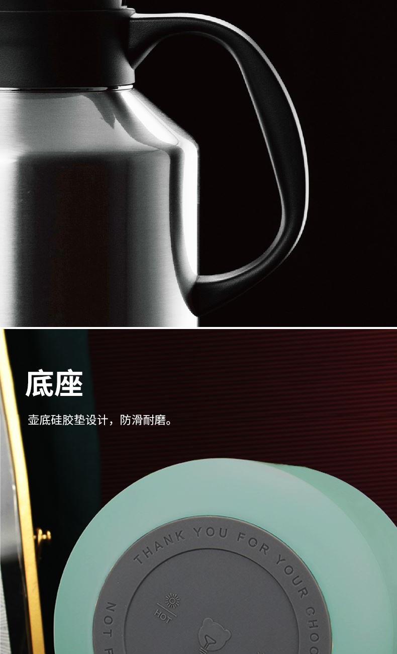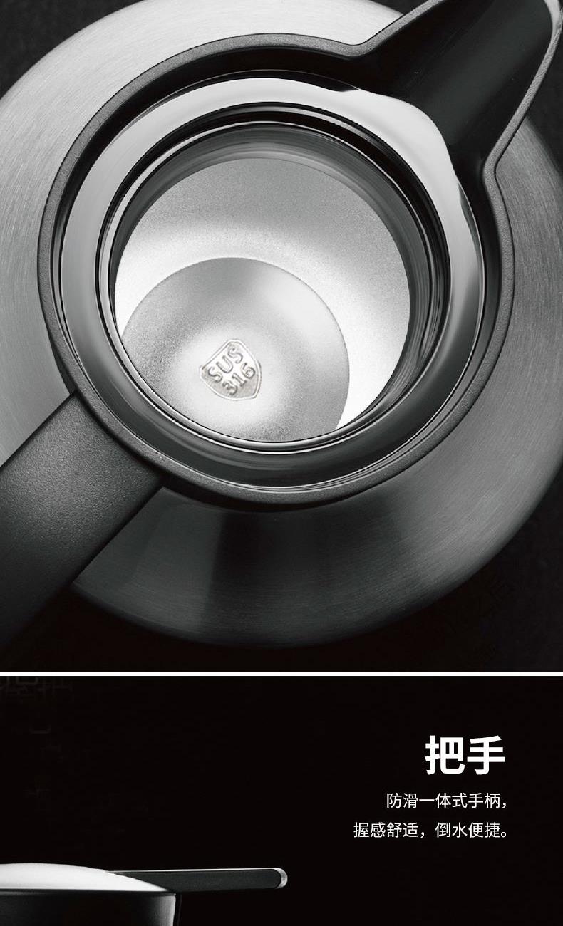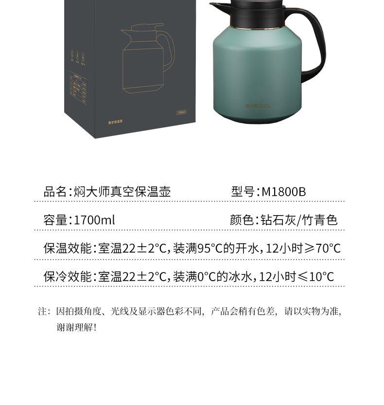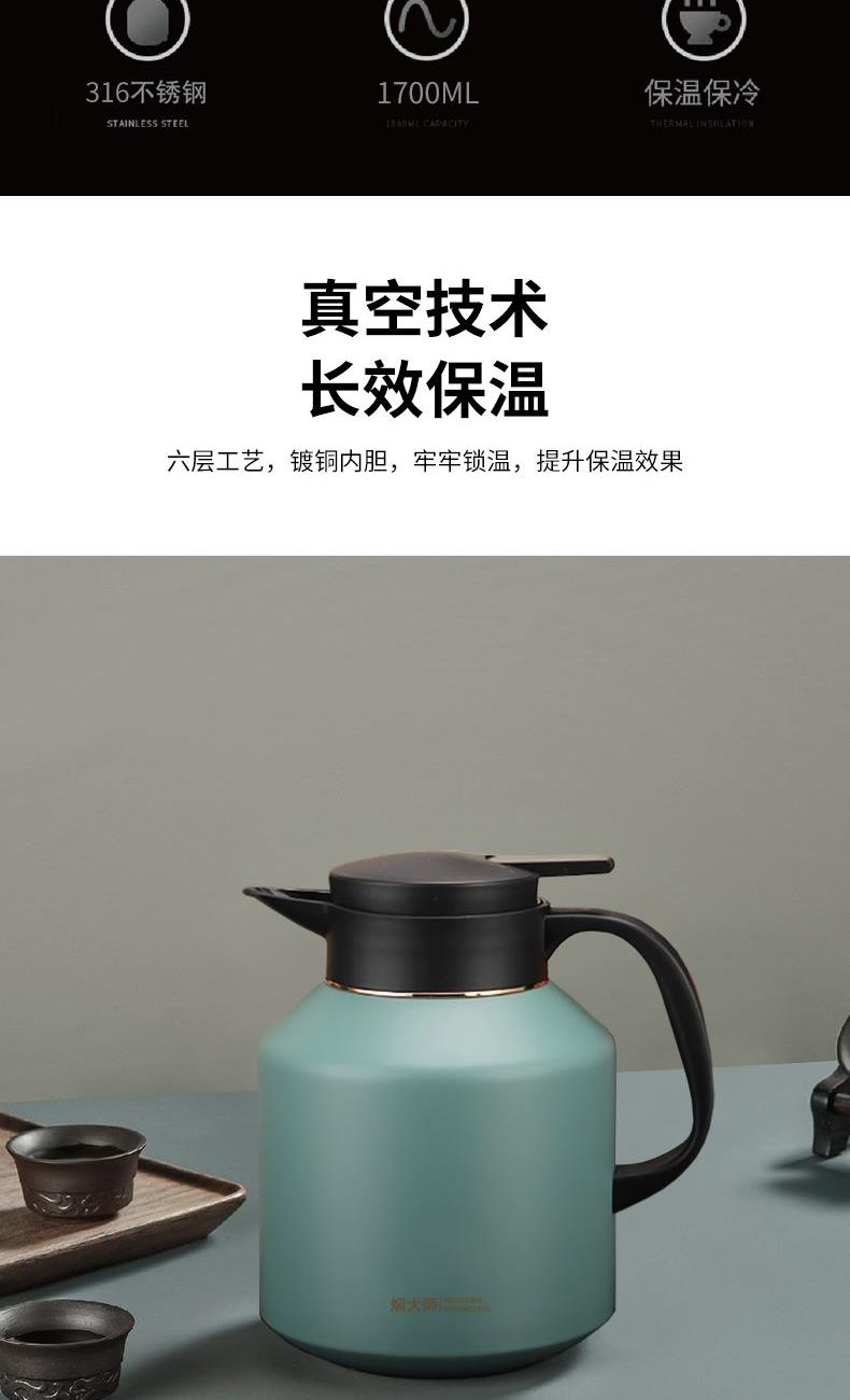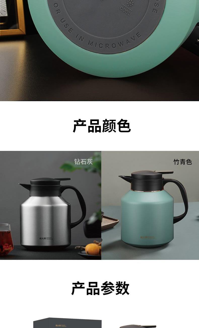 外壳材质:奥氏体型不锈钢06Cr19Ni10(304) 内胆材质:奥氏体型不锈钢06Cr17Ni12Mo2(316) 塑 件:聚丙烯PP(食品接触用) 密 封 圈:食品接触用硅胶 保温效力:室温25℃条件下95℃满水容量测试12h≥50℃ 配 置:316不锈钢保温壶 容 量:1700ml 颜 色:钻石灰 包装尺寸:180*160*225mm 装 箱 数:12只/箱 材质优渥,坚固耐用 真空隔热,长效保温 多人饮茶,一壶搞定 一键操作,防溅省力 时尚外观,精致典雅