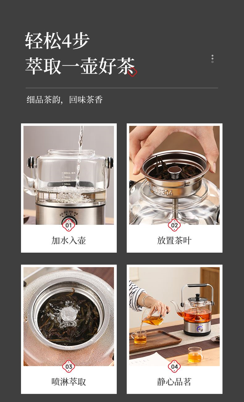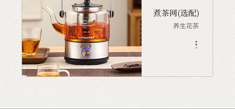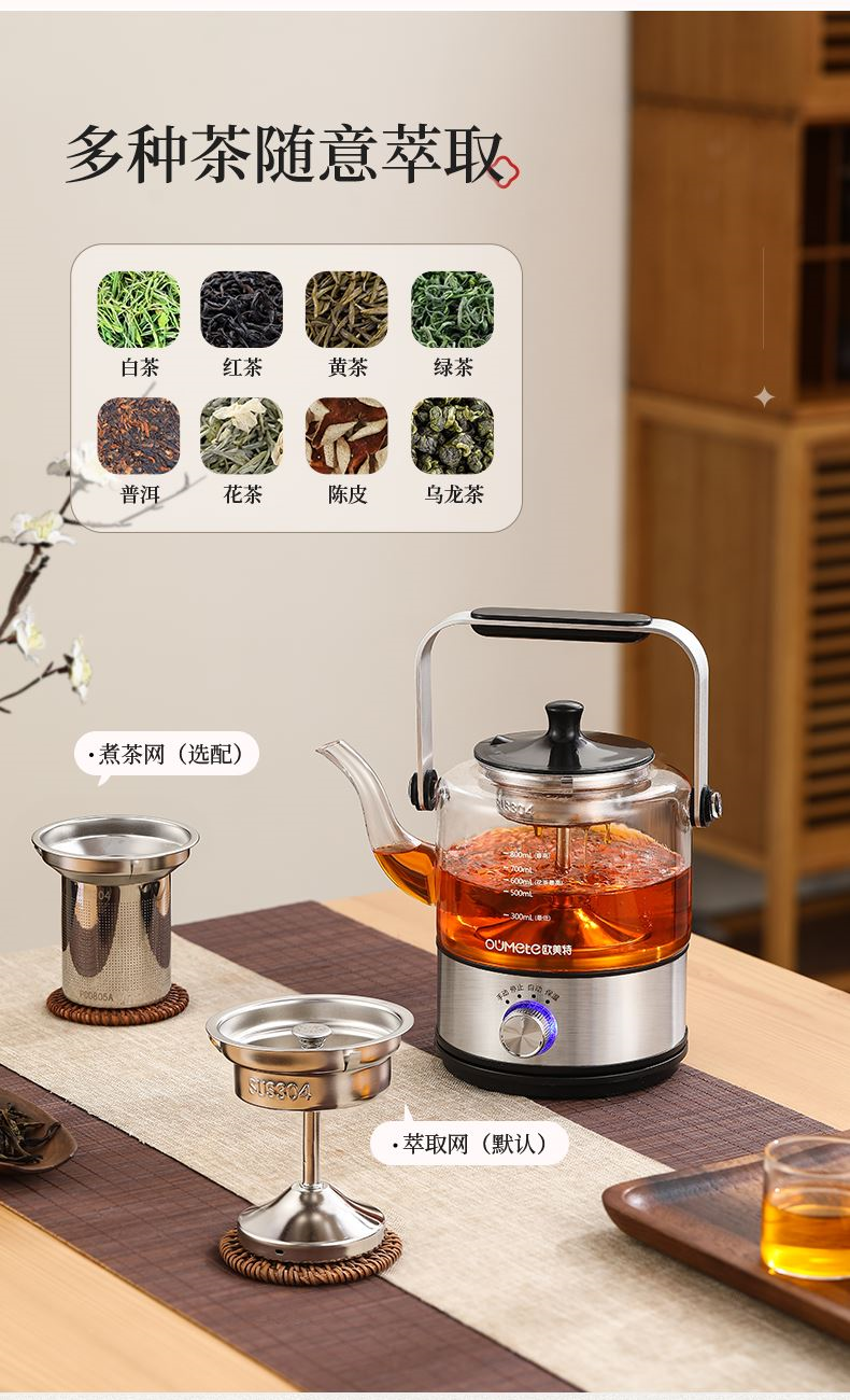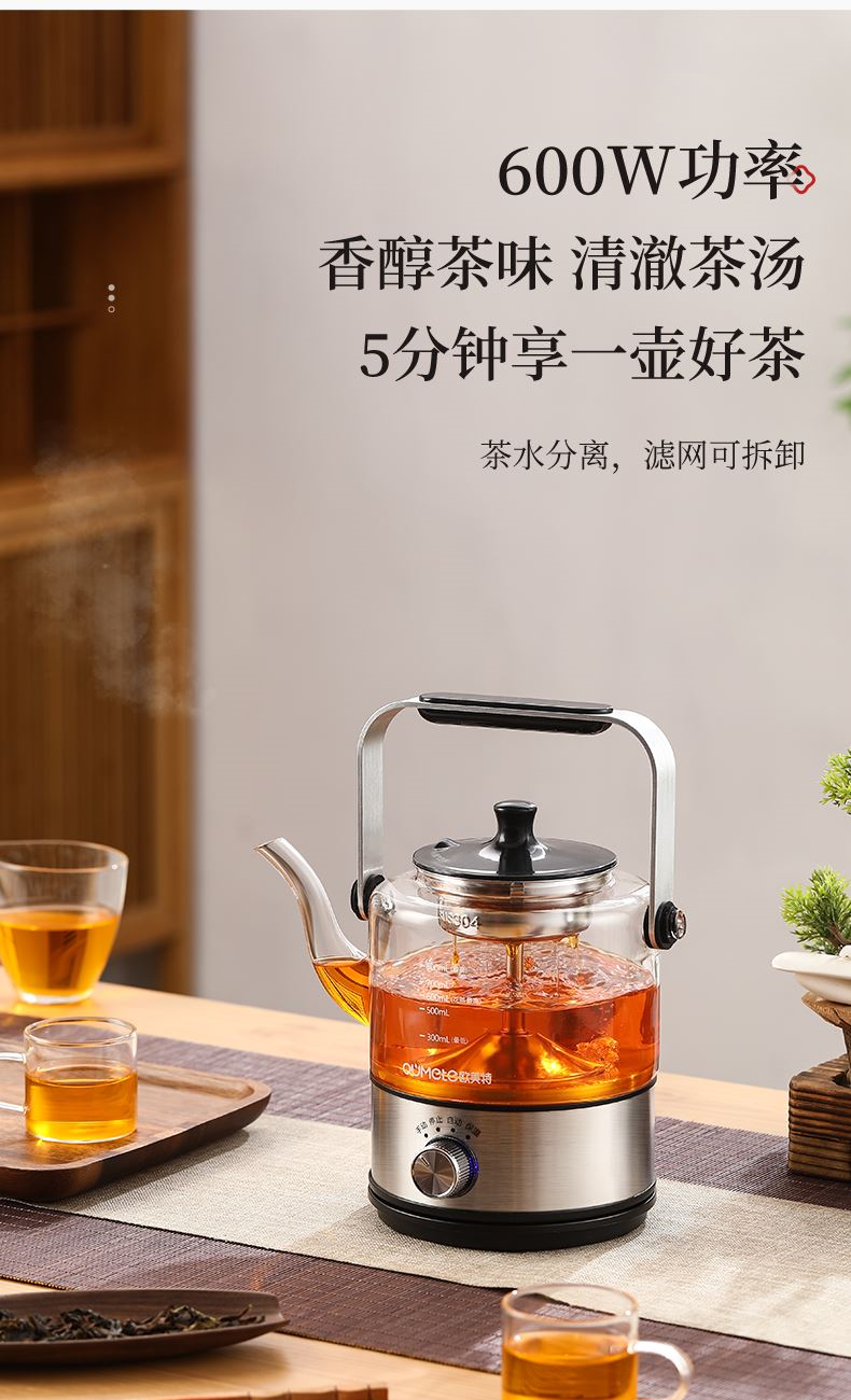 1、全新升级分体式过滤网--声音更小,更易清洗,煮茶口感好