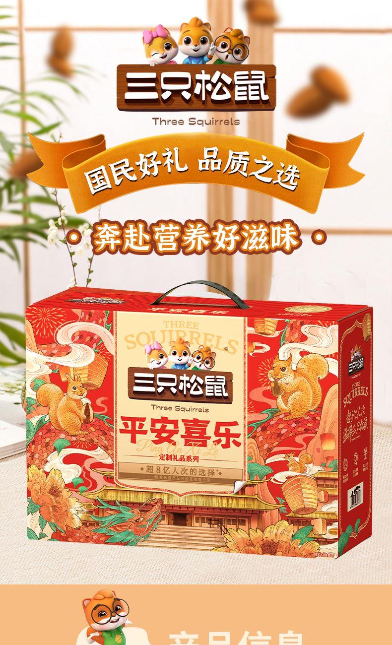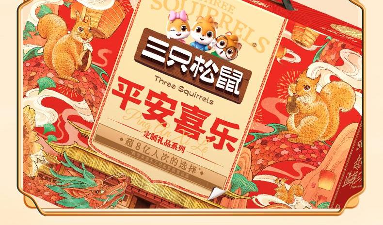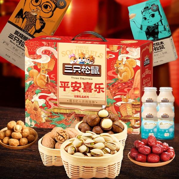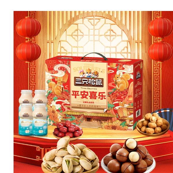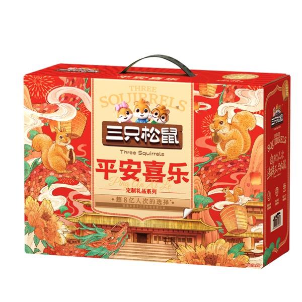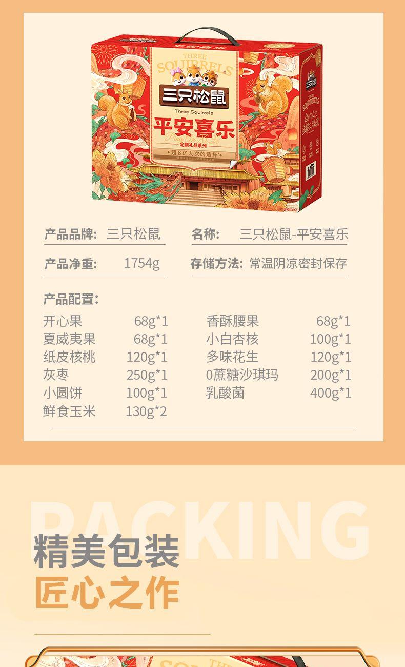 三只松鼠-平安喜乐 1754g 配置: 三只松鼠-开心果/68g 三只松鼠-香酥腰果68g 三只松鼠-夏威夷果68g 三只松鼠-小白杏核100g 三只松鼠-纸皮核桃120g 三只松鼠-多味花生120g 三只松鼠-灰枣250g 三只松鼠-0蔗糖沙琪玛200g 三只松鼠-小圆饼100g 三只松鼠-乳酸菌400g 三只松鼠-鲜食玉米段130g*2袋