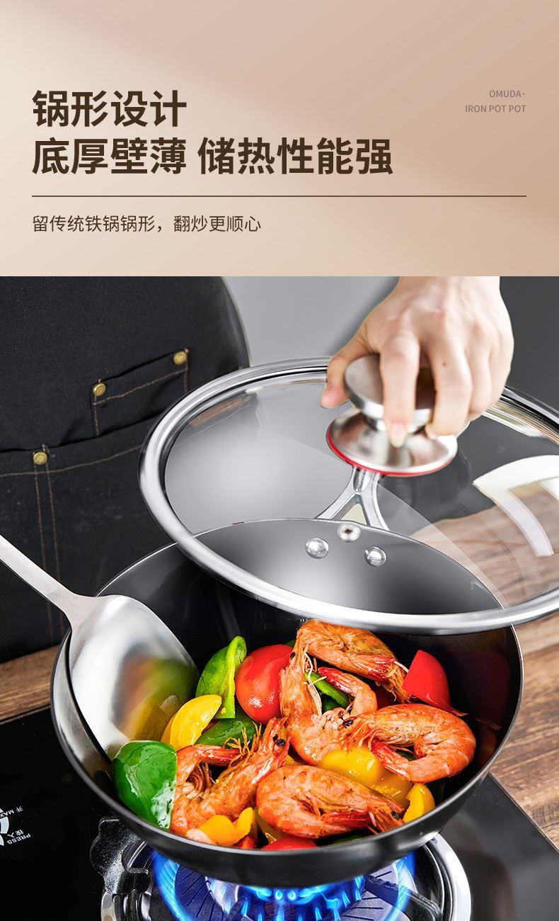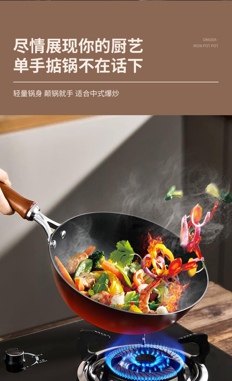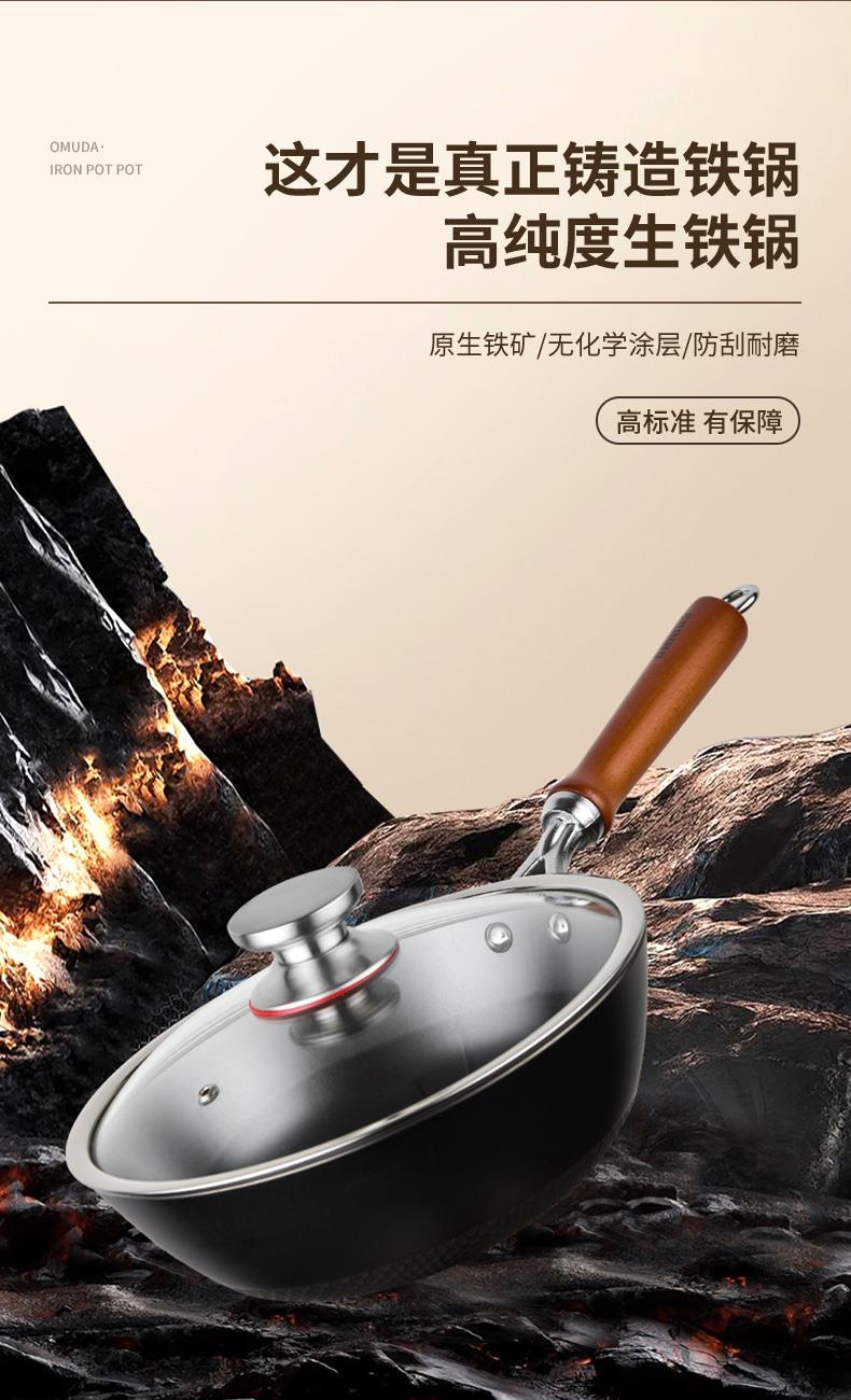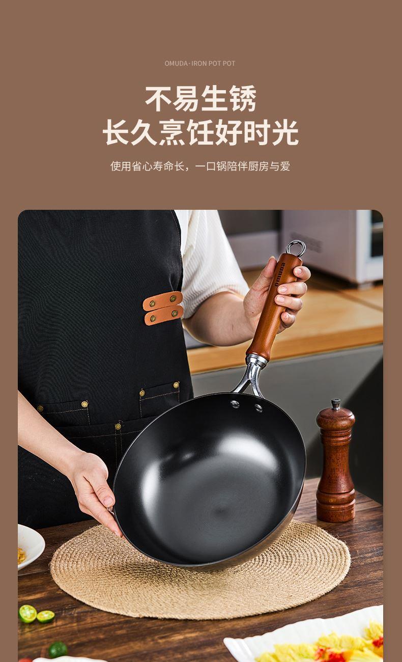 材质:灰生铁(铸铁) ① 原生态生铁锅,锅体采用深矿原生铁材质,经高温提炼、浇铸、切口、修边、抛光、氮化等多道工序匠心制作而成。 ②锅体自然发色,表面经高科技氮化防锈工艺处理,抗腐蚀防锈能力远高于行业标准。 ③铁材质导受热高,导热快速,旺火爆炒,让食材脆嫩爽口,口齿留香。 ④圆底设计,保留传统铁锅锅形,翻炒更顺心,底厚壁薄,储热性能强,传热快速均匀,不易焦糊,不含有对人体有害的重金属元素,健康安全。 ⑤进口防烫木柄,防烫更环保