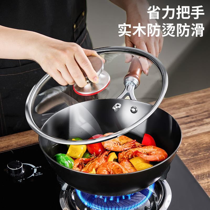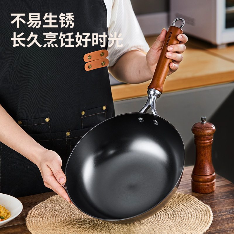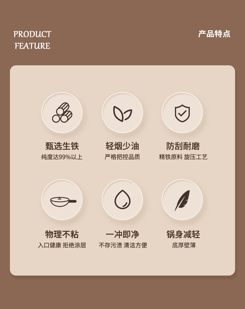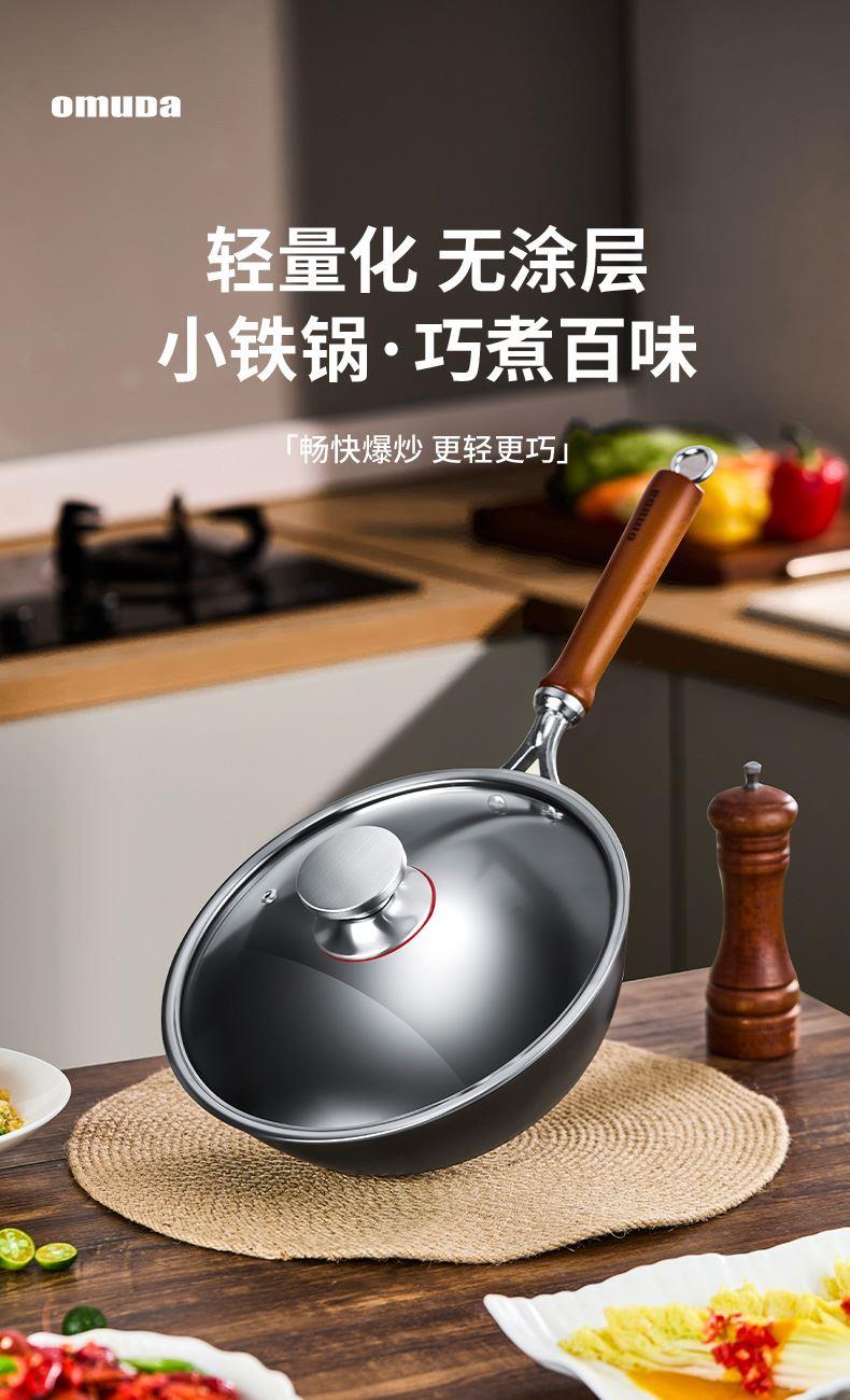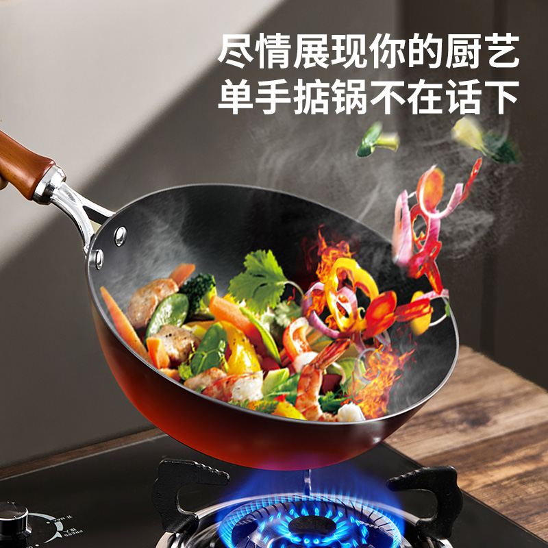 材质:灰生铁(铸铁) ① 原生态生铁锅,锅体采用深矿原生铁材质,经高温提炼、浇铸、切口、修边、抛光、氮化等多道工序匠心制作而成。 ②锅体自然发色,表面经高科技氮化防锈工艺处理,抗腐蚀防锈能力远高于行业标准。 ③铁材质导受热高,导热快速,旺火爆炒,让食材脆嫩爽口,口齿留香。 ④圆底设计,保留传统铁锅锅形,翻炒更顺心,底厚壁薄,储热性能强,传热快速均匀,不易焦糊,不含有对人体有害的重金属元素,健康安全。 ⑤进口防烫木柄,防烫更环保