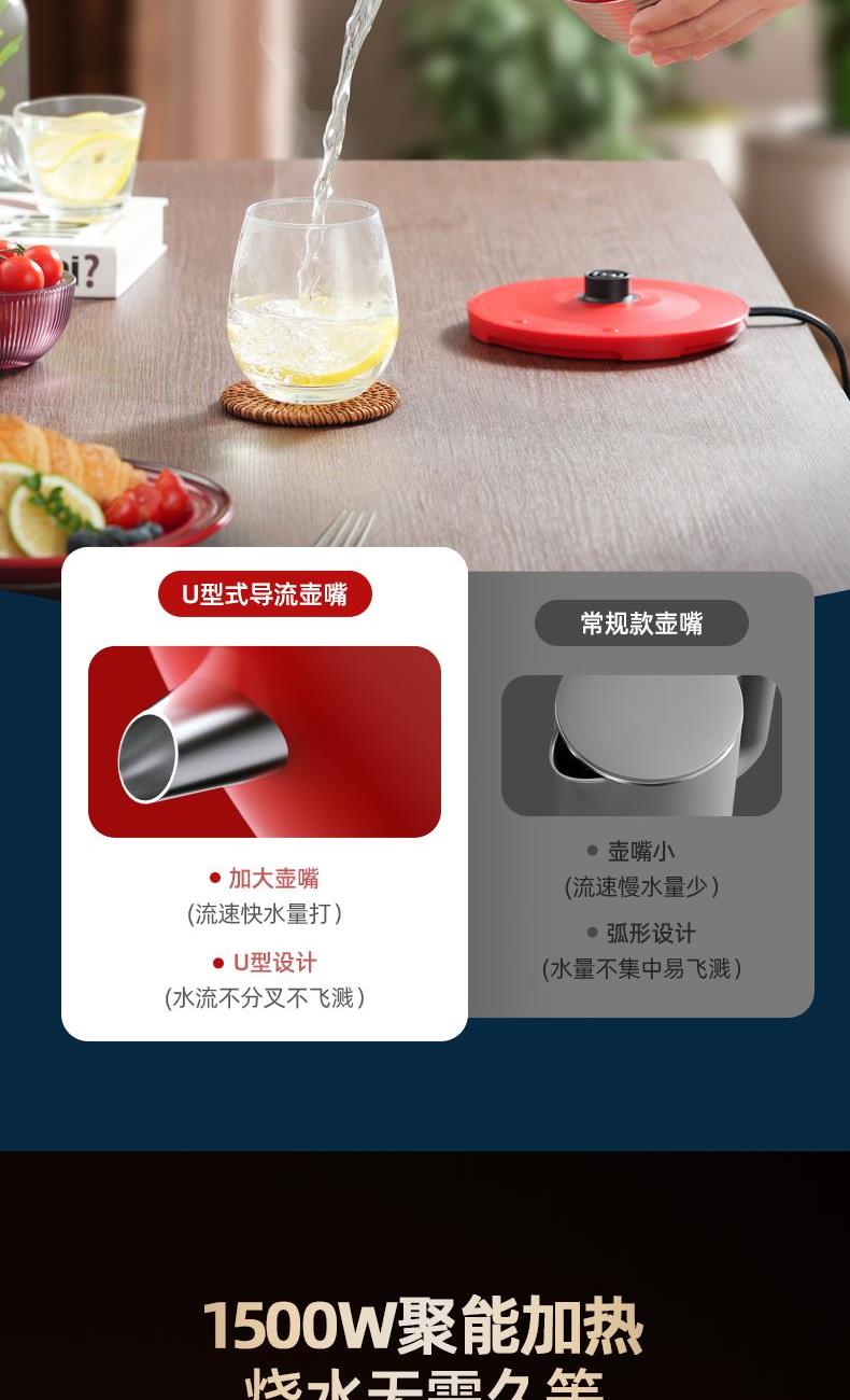 额定功率:1500W 额定容量:1.6L 额定电压:220V~ 额定频率:50Hz 产品净重:0.9kg 产品毛重:1.2kg 产品尺寸:212x170x240mm 邮包尺寸:250x200x290mm 产品条码:6971537231431 装 箱 数:单台装 316材质发热盘,安全可靠,易清洁; 智能温显表自带温显一键烧水,实时温度显示,用水知温; 一键烧水1500W大功率烧水快,水开跳挚,操作简单; 大口径壶口大口径广式壶口设计方便接水和清洗。