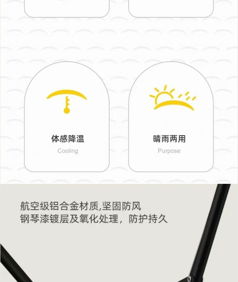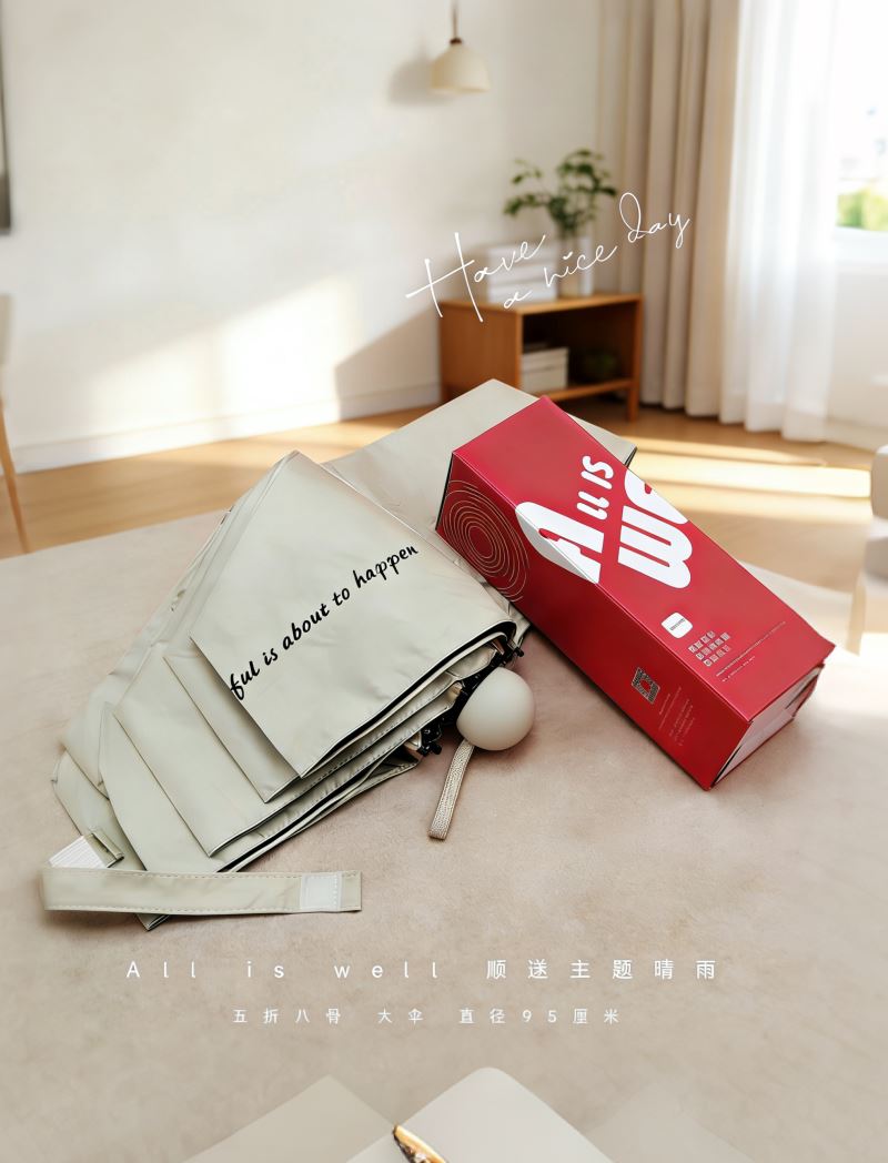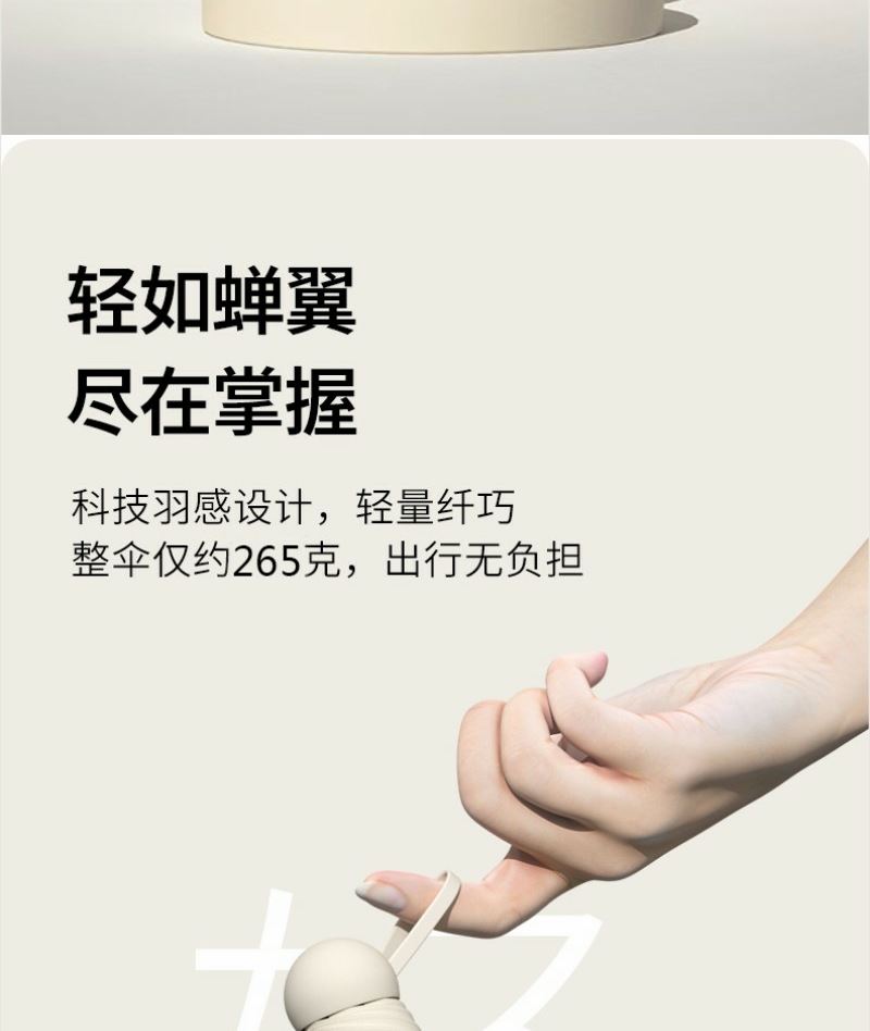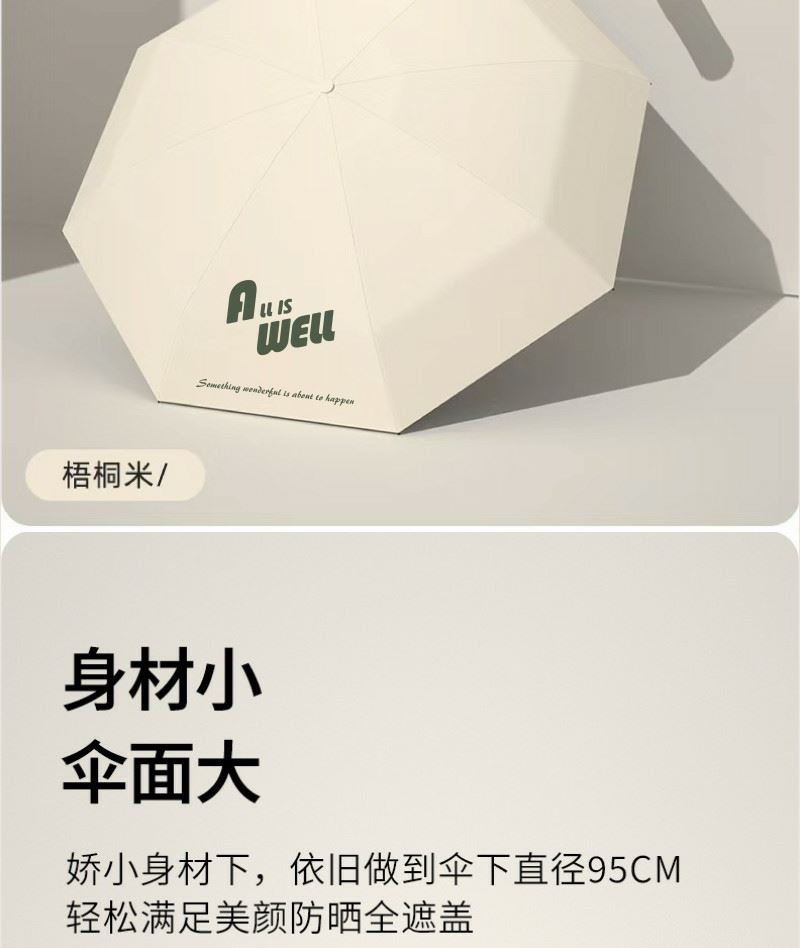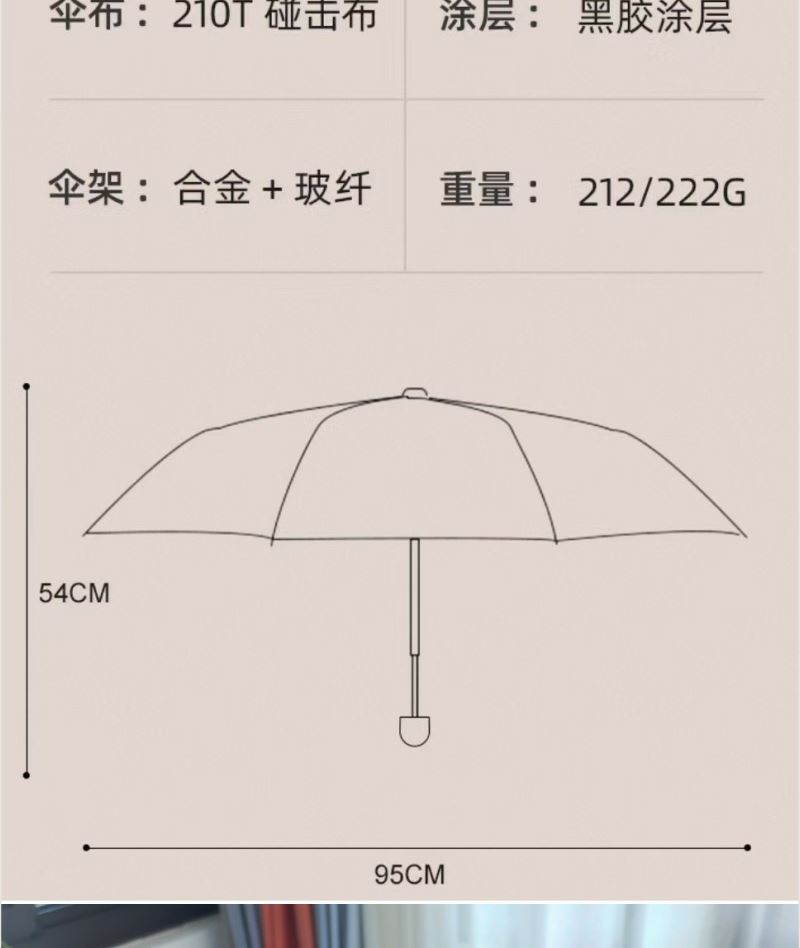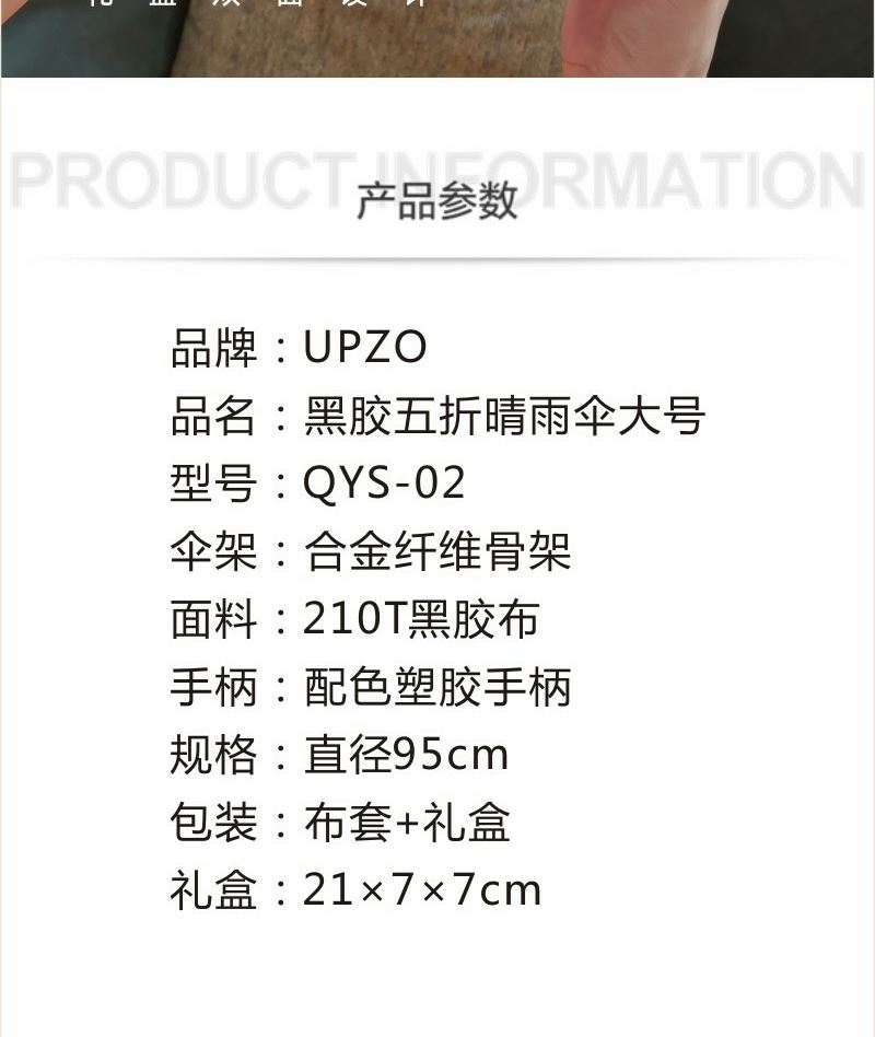 型号:QYS-02 规格:直径95CM 伞架:合金纤维骨架 面料:210T黑胶布 手柄:配色塑胶手柄 包装:布套+礼盒 颜色:梧桐米 礼盒:21*7*7CM