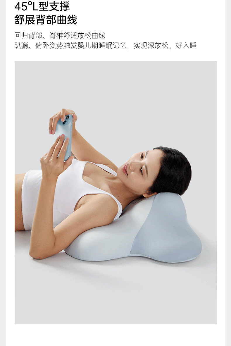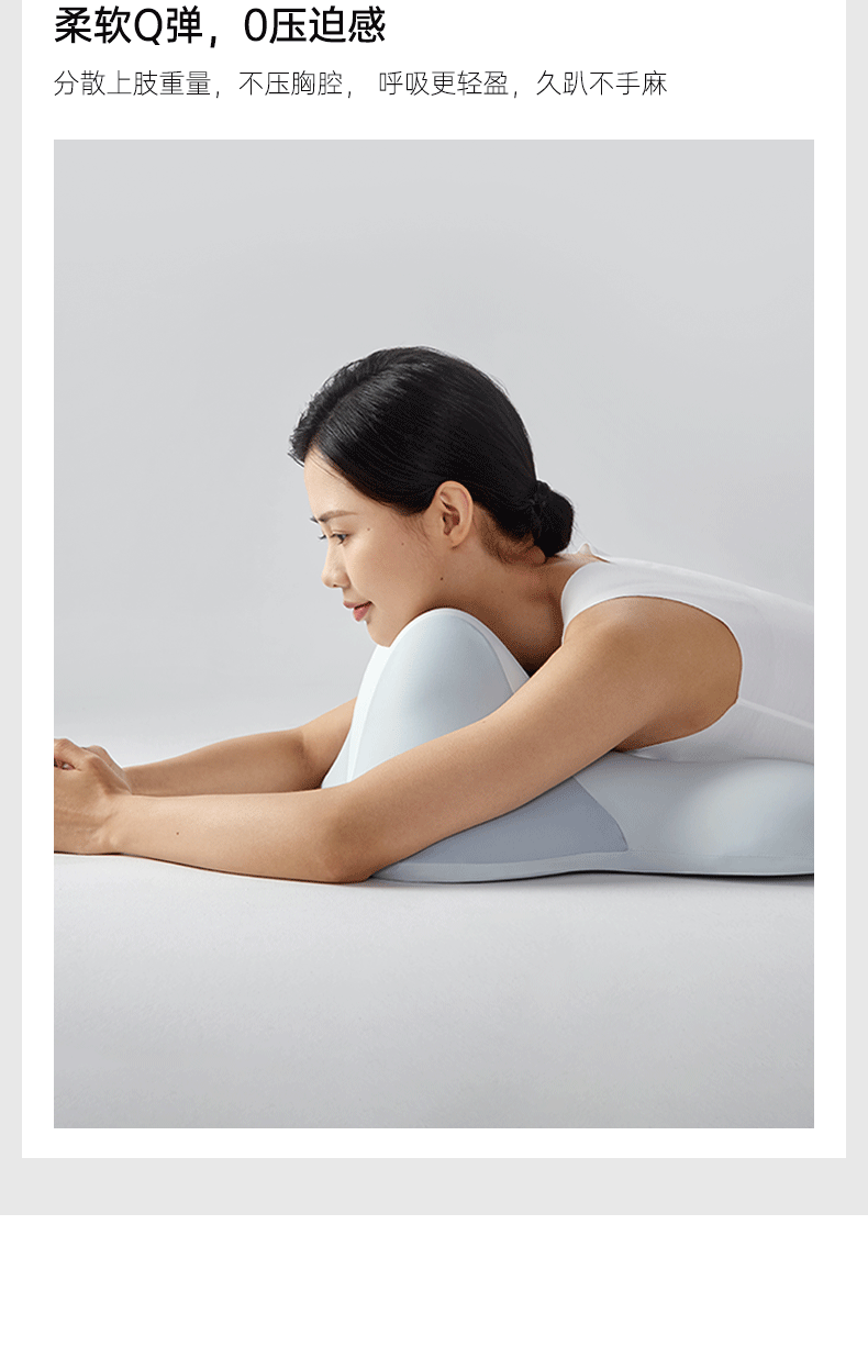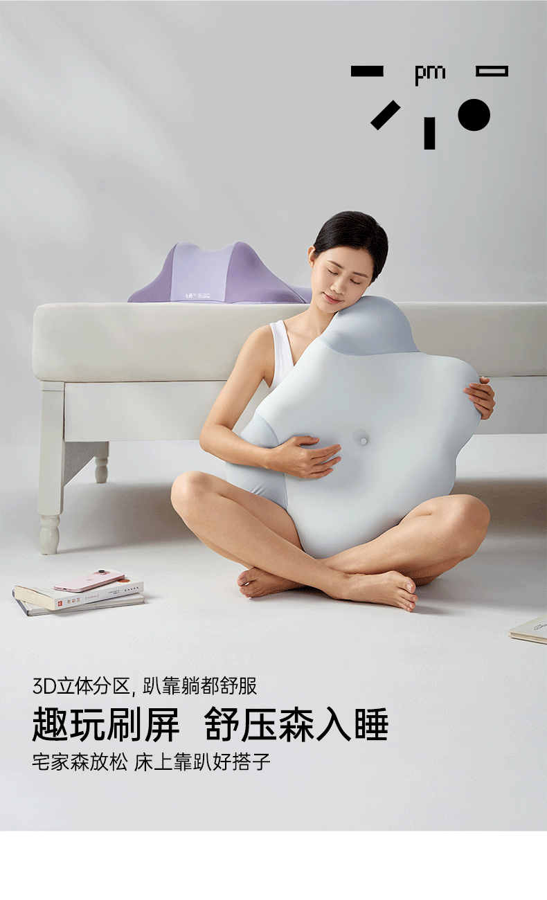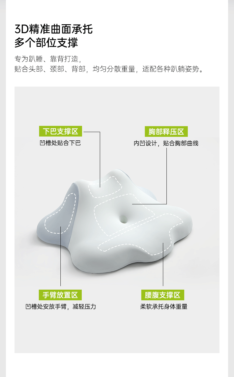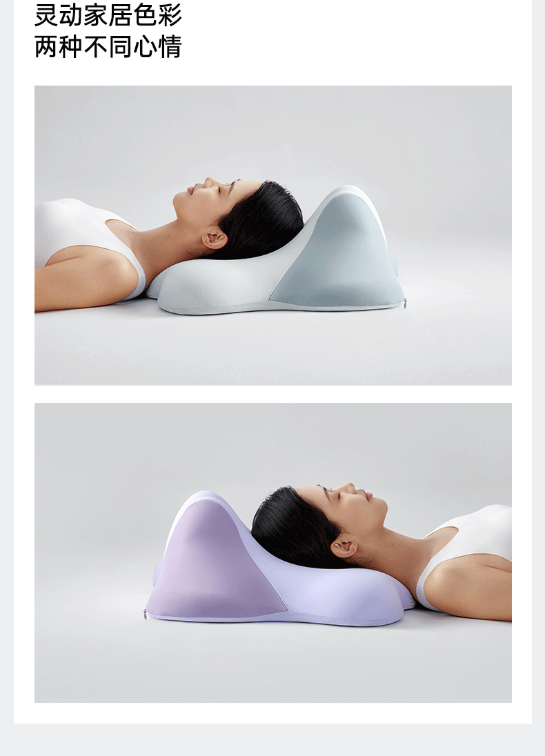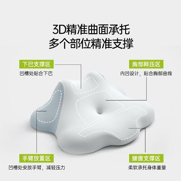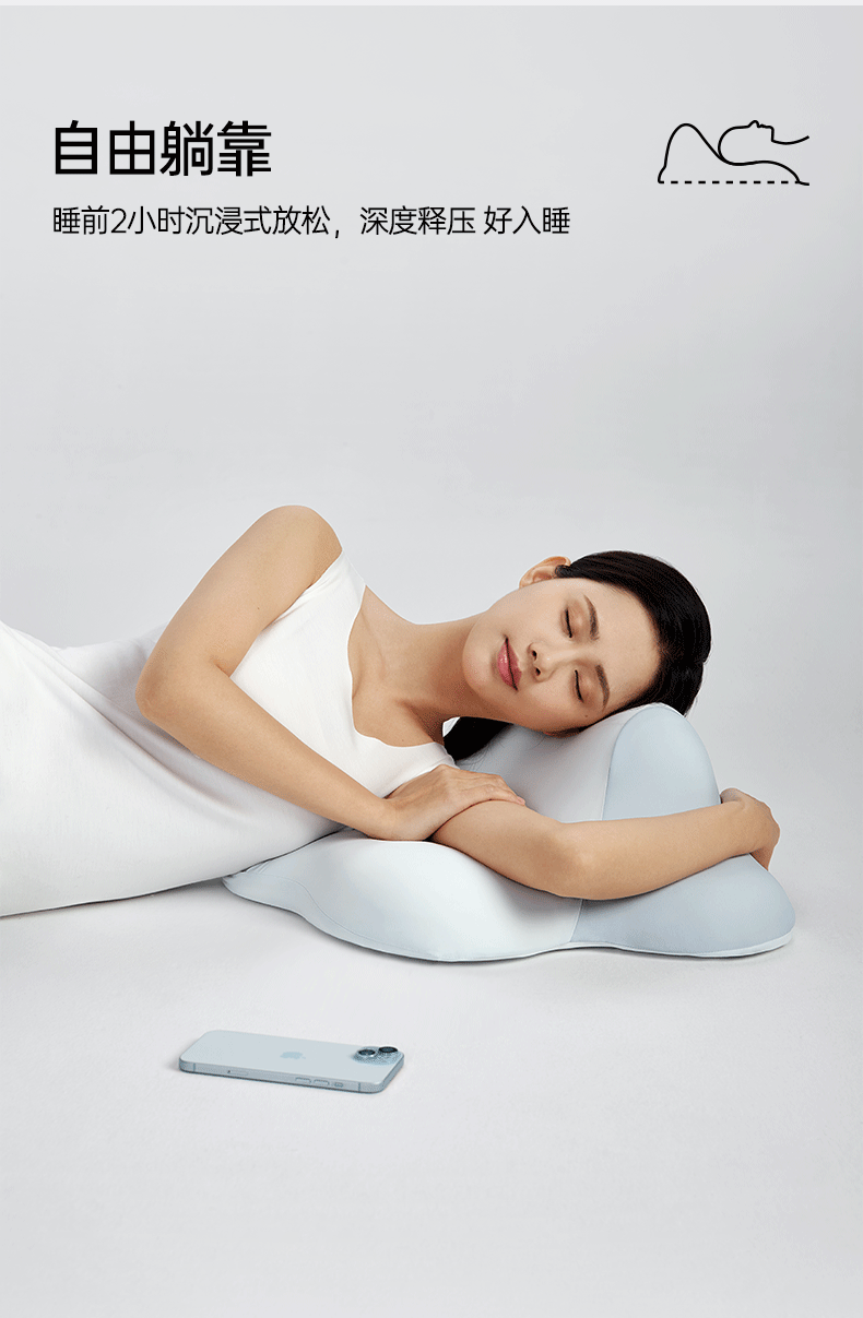 产品规格:610*500*200mm 产品净重:1.5kg 外箱毛重:1.65kg 外箱尺寸:180*180*450mm 产品颜色:雾海蓝/芋泥紫 包装方式:彩盒 1、3D立体分区——“曲面承托、多个部位支撑"”脑窝+腰背+肩颈+胸部+下巴+颈椎+侧脸等身体部位支撑 2、一枕多姿多用 ——"睡前小动作、睡觉也能用"——坐着靠背+仰卧靠肩+趴躺托胸+平躺托颈+侧睡托脸 3、两种形态可用——“平放更好躺、立放更好坐" 4、多场景可使用 ——"从沙发到卧室、一枕满足" 5、速干透气面料——"不愁洗、也快干" 6、睡前舒压缓解——"直立切换平卧、血压平稳过渡"、“睡前趴躺过渡、缓解情绪压力"