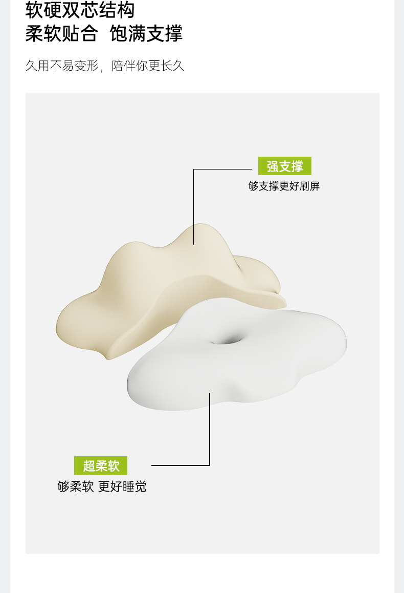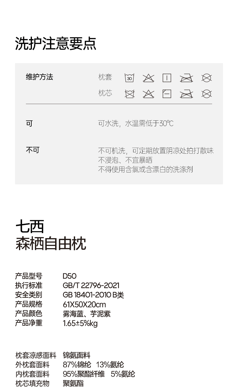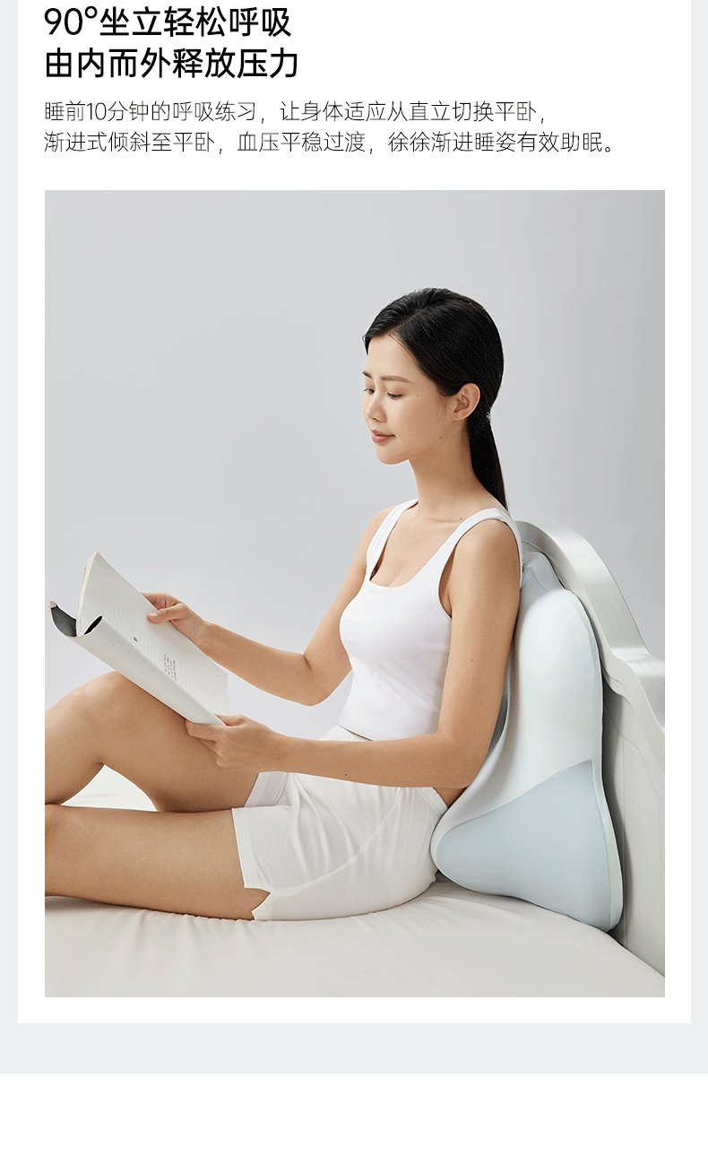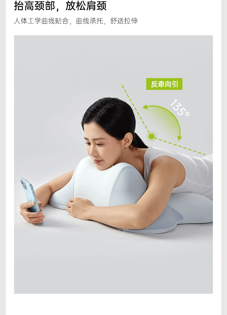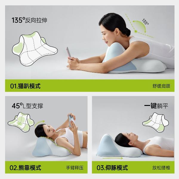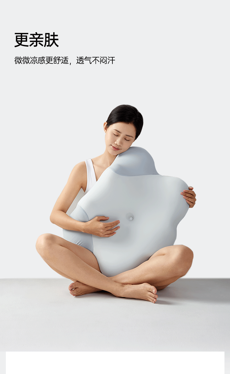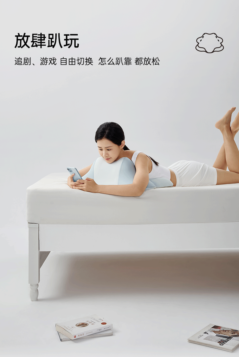 产品规格:610*500*200mm 产品净重:1.5kg 外箱毛重:1.65kg 外箱尺寸:180*180*450mm 产品颜色:雾海蓝/芋泥紫 包装方式:彩盒 1、3D立体分区——“曲面承托、多个部位支撑"”脑窝+腰背+肩颈+胸部+下巴+颈椎+侧脸等身体部位支撑 2、一枕多姿多用 ——"睡前小动作、睡觉也能用"——坐着靠背+仰卧靠肩+趴躺托胸+平躺托颈+侧睡托脸 3、两种形态可用——“平放更好躺、立放更好坐" 4、多场景可使用 ——"从沙发到卧室、一枕满足" 5、速干透气面料——"不愁洗、也快干" 6、睡前舒压缓解——"直立切换平卧、血压平稳过渡"、“睡前趴躺过渡、缓解情绪压力"