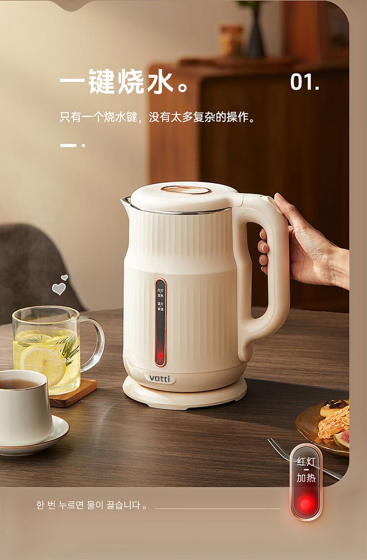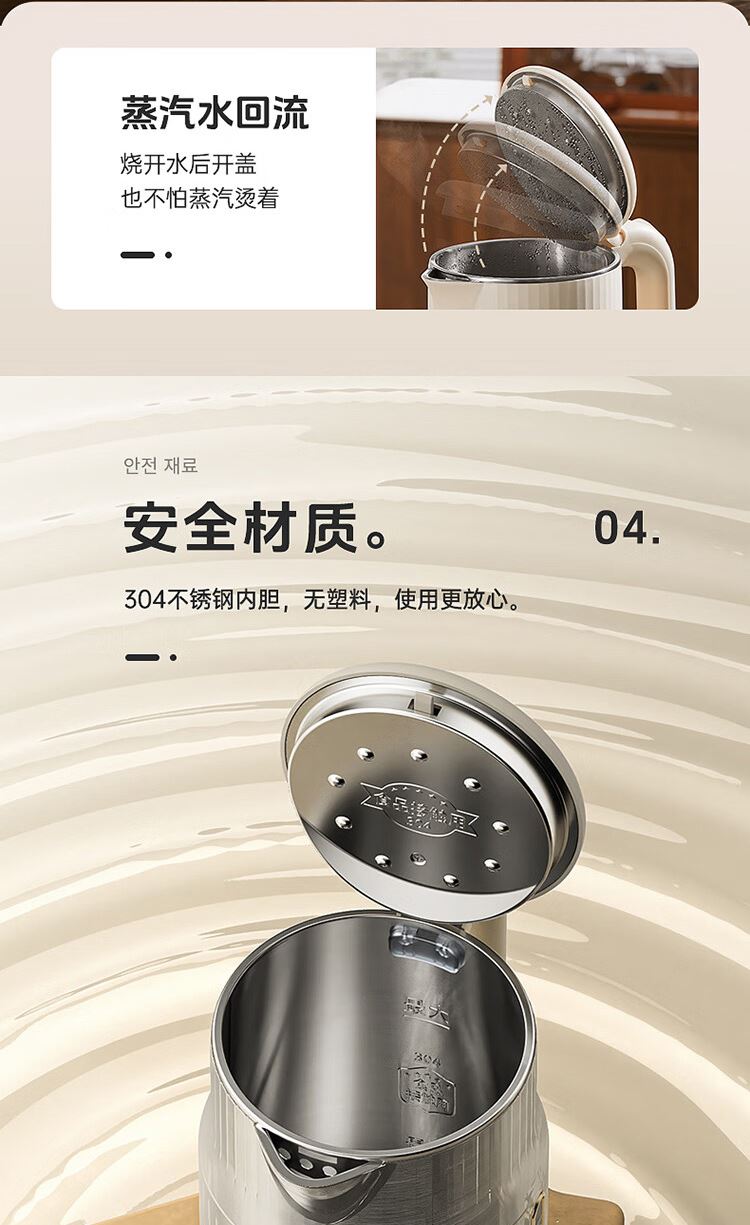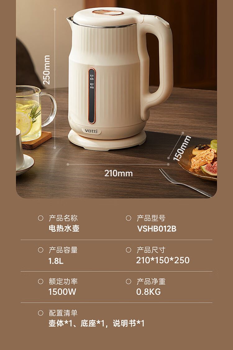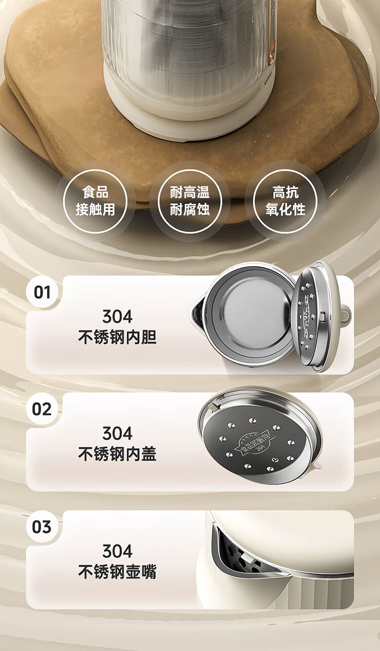 1.大容量:1.8L大容量,一次烧水满足全家畅饮。 2.极速加热:1500W大功率,迅速沸腾,无需漫长等待。 3.安全材质:精选304不锈钢,食品级接触材质 4.坚固耐用:优质不锈钢打造,经久耐用,品质之选。