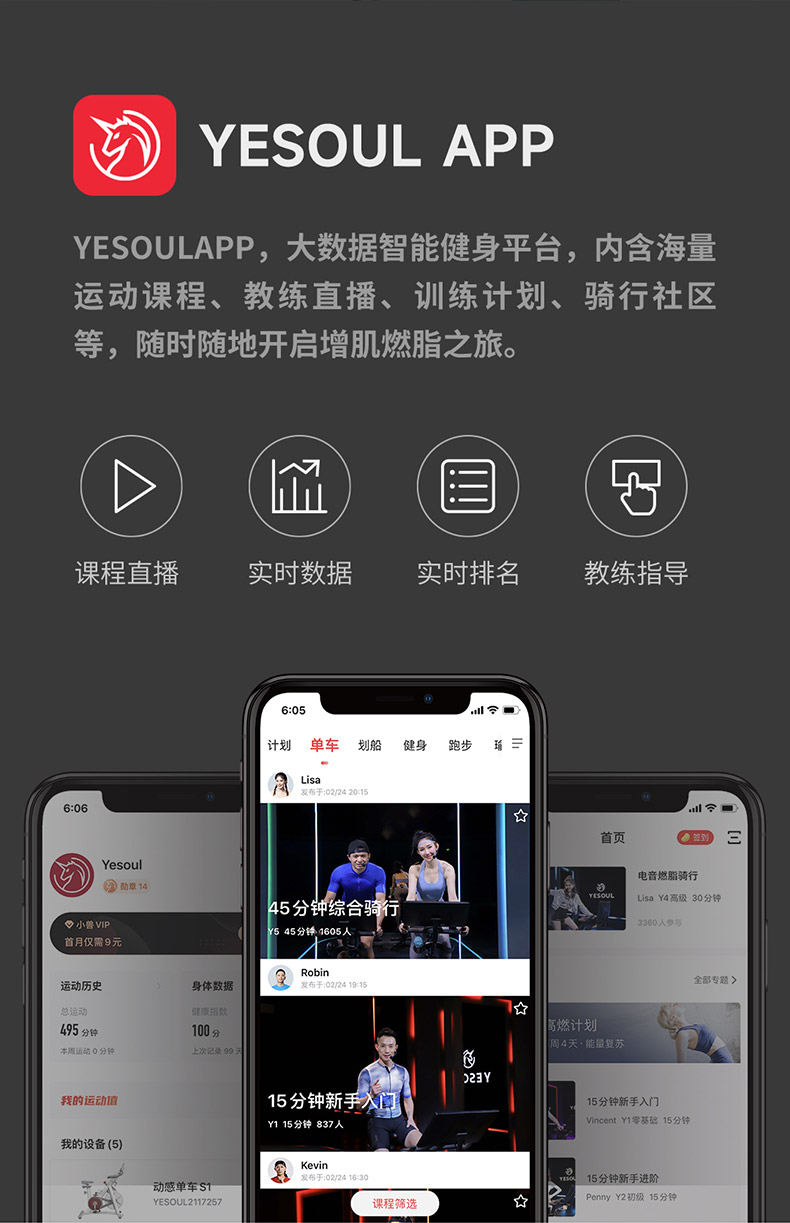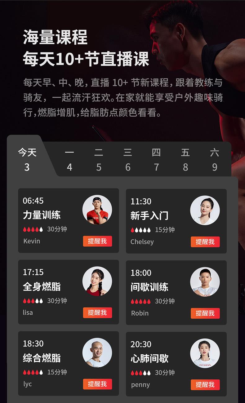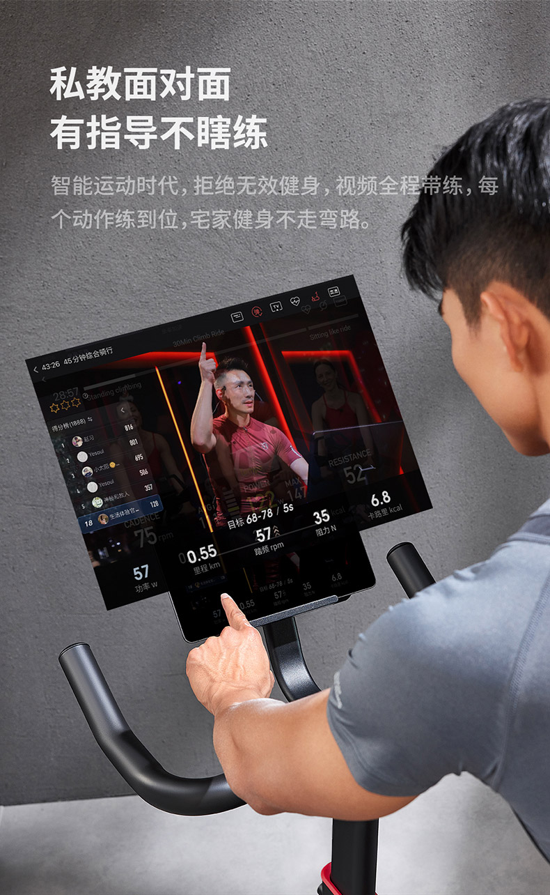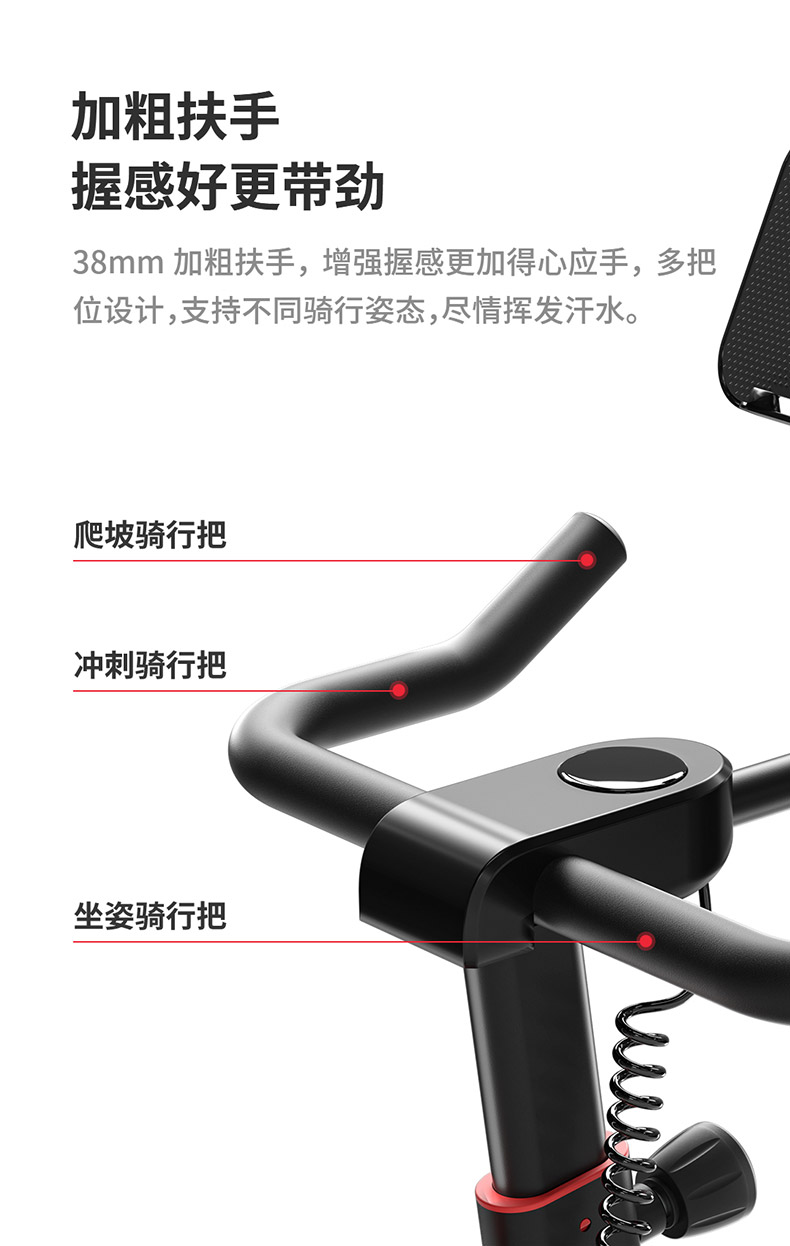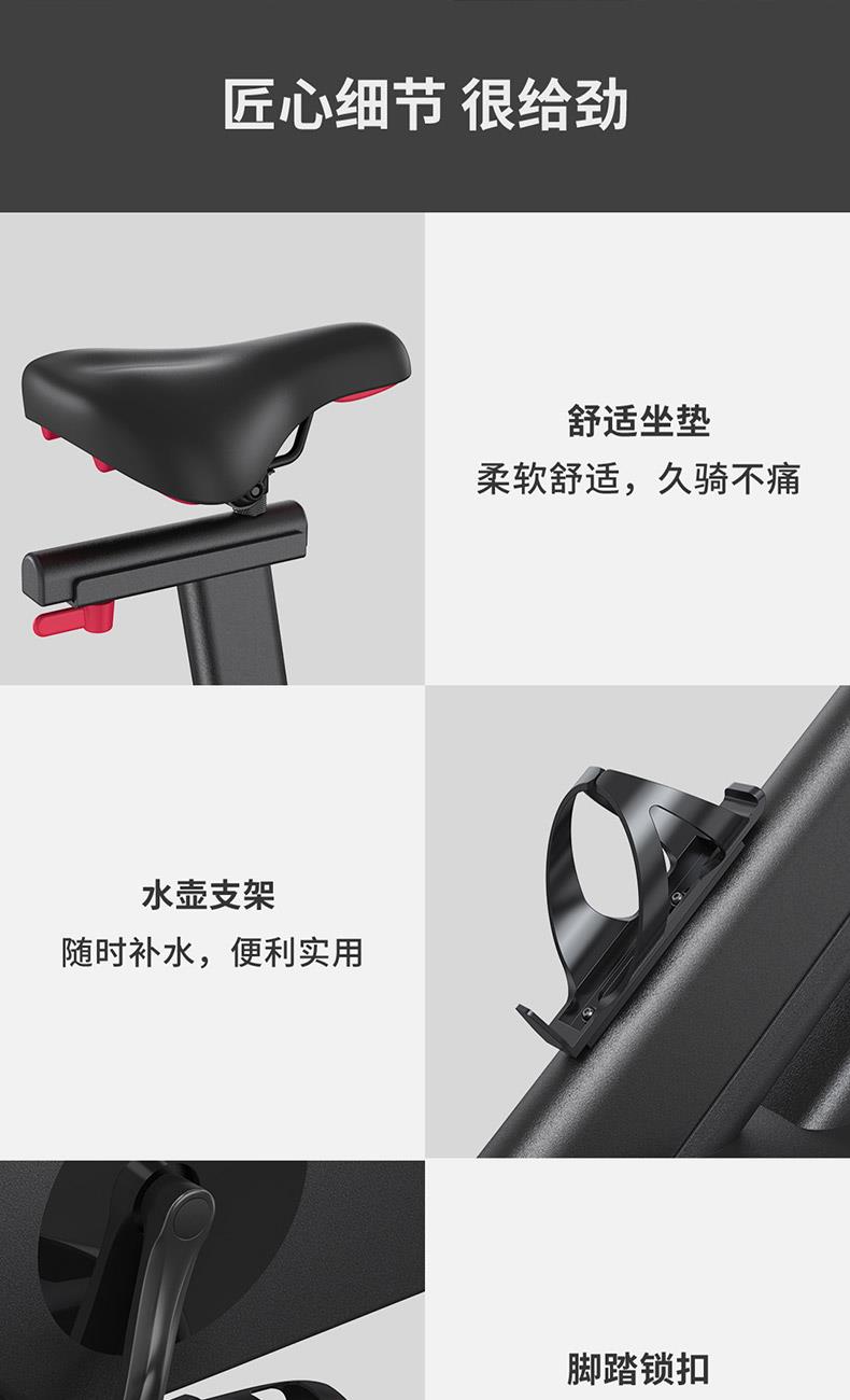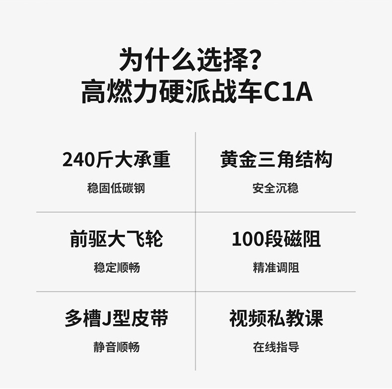 240斤大承重,黄金三角结构 海量直播课程,健身私教带回家 黄金三角结构,安全沉稳 100段磁控阻力和多槽皮带,调控静音骑行 创新惰性设计,防打滑不跑偏,稳定运行 铝制大飞轮,燃脂增肌“助推器”
