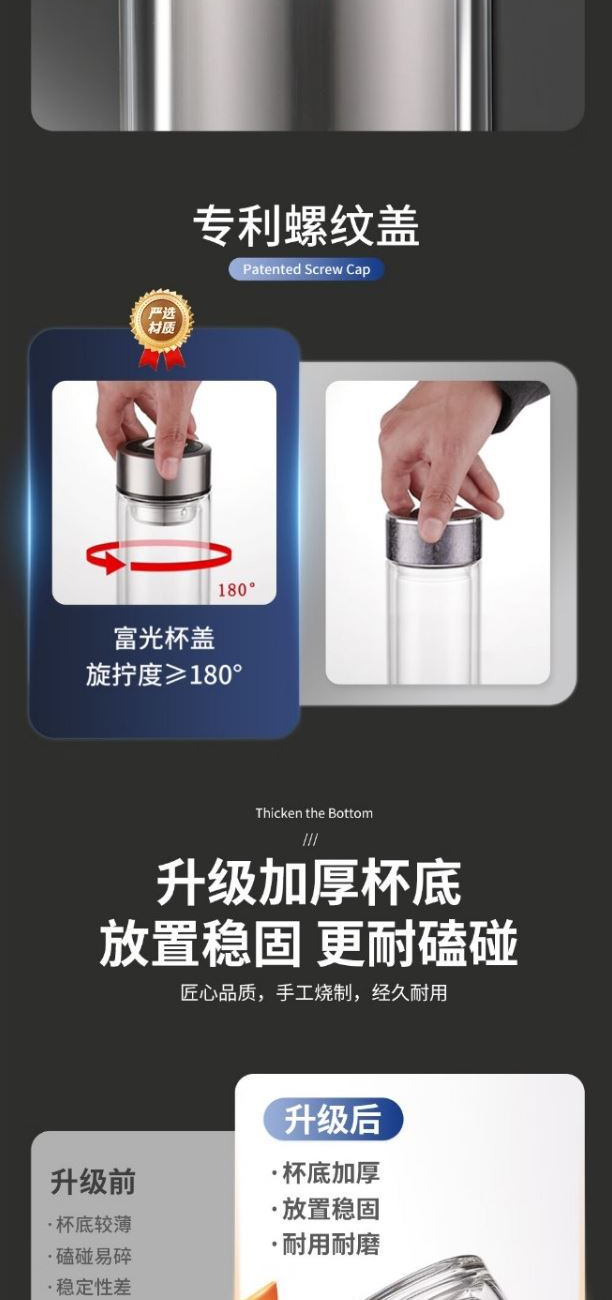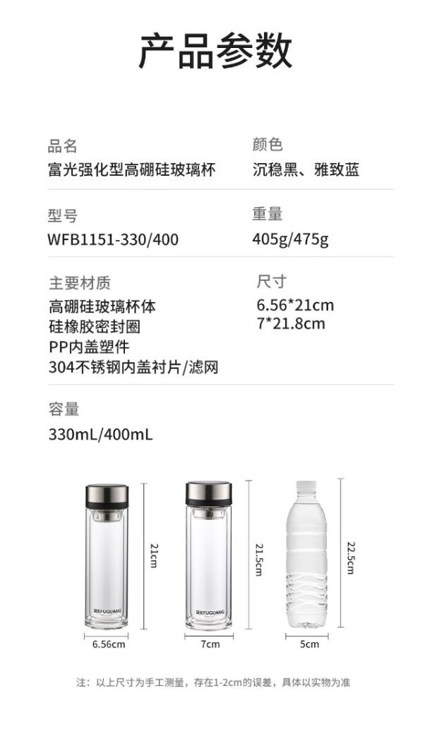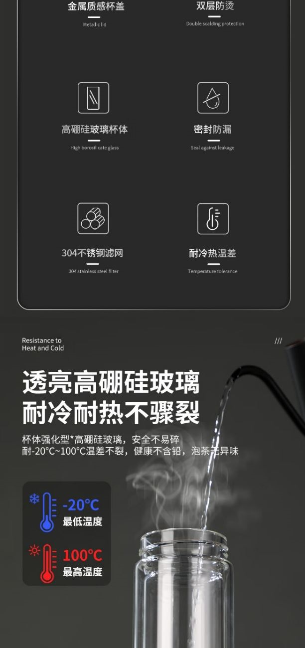 颜色:沉稳黑 雅致蓝 重量:475g 尺寸:70/218mm 材质:304不锈钢滤网,304不锈钢回流盖。 高硼硅玻璃材质,纯手工烧制加厚杯底,经久耐用。 包装:单瓦盒