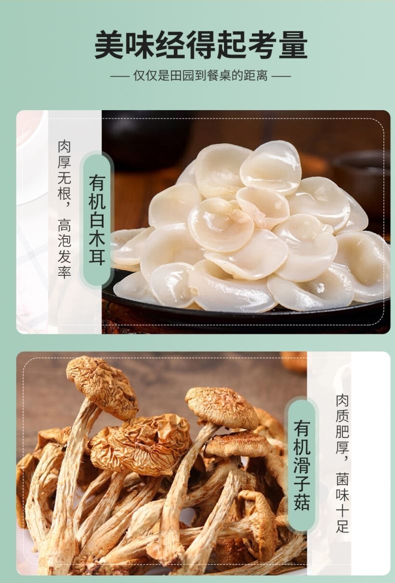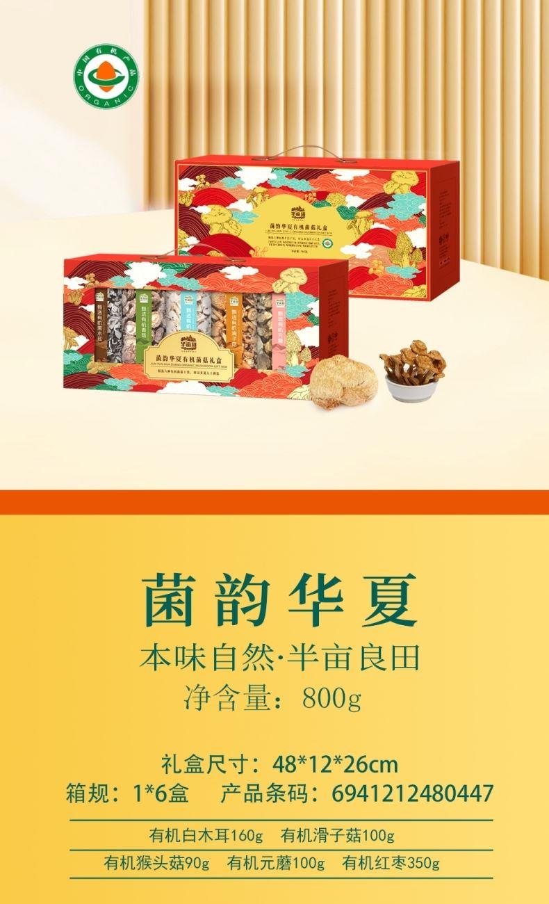 产品配置—罐装: 有机白木耳160g 有机滑子菇100g 有机猴头菇90g 有 机 元 蘑100g 有 机 红 枣350g 净含量:800g 礼盒尺寸:48*12*26cm 半亩川菌韵华夏有机山珍五种有机菌菇干货+有机红枣,山珍菌香浓郁,红枣肉厚核小,礼盒装荟萃自然精华,有机又健康。