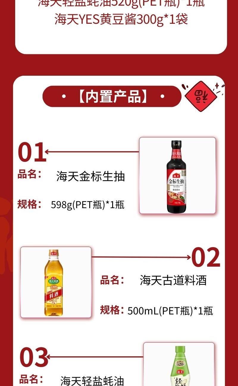 配置: 海天金 标生抽598g(PET瓶)*1瓶 海天古道料酒500mL(PET瓶)*1瓶 海天轻盐蚝油520g(PET瓶)*1瓶 海天YES黄豆酱300g*1袋 卖点: 可选产品丰富多样,礼箱随心组合,多种价位因需而定,充分满足各种送礼需求,是商务送礼、单位福利的用心之选。