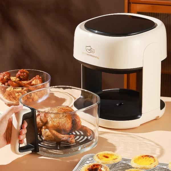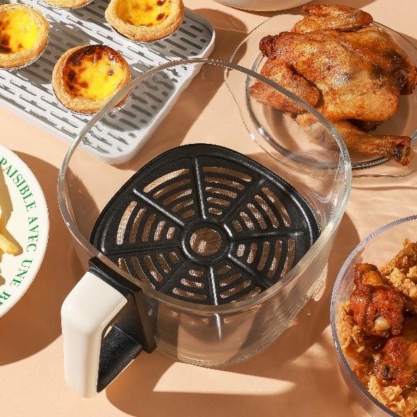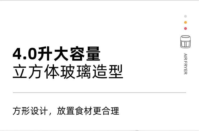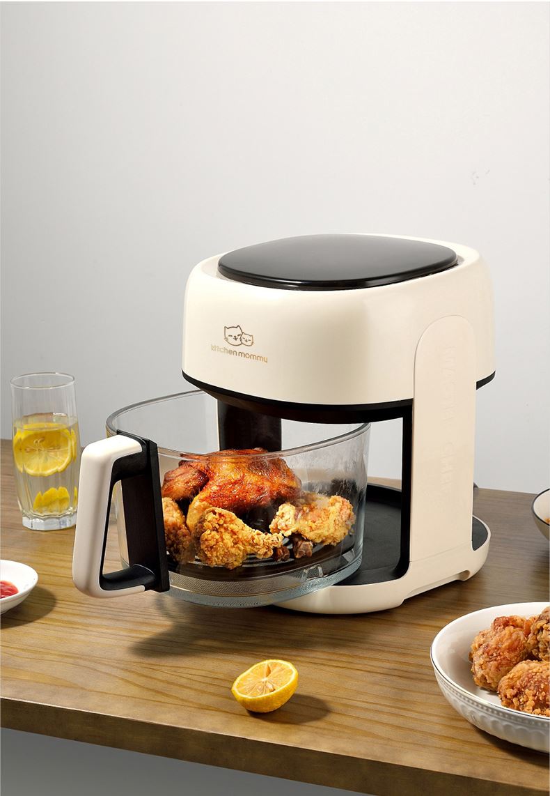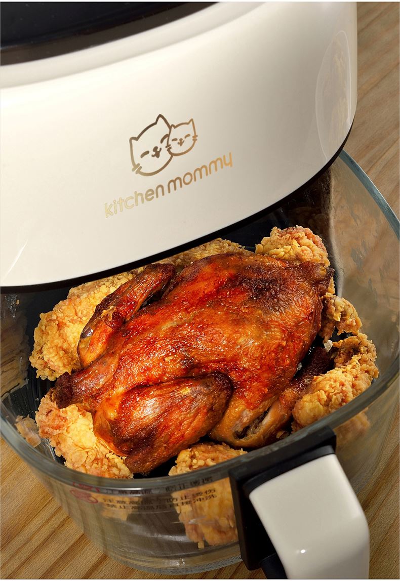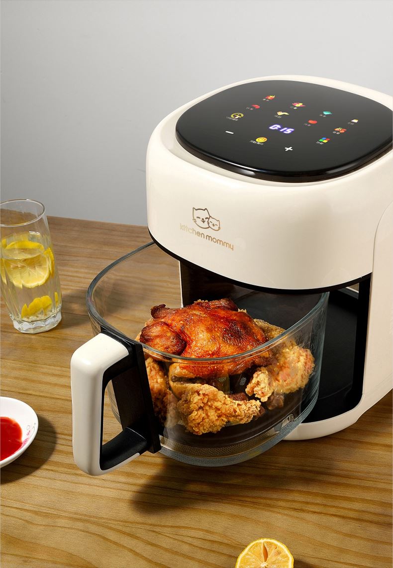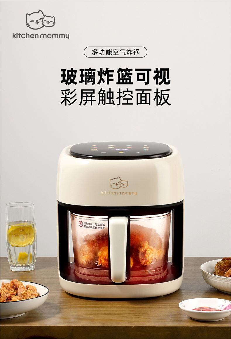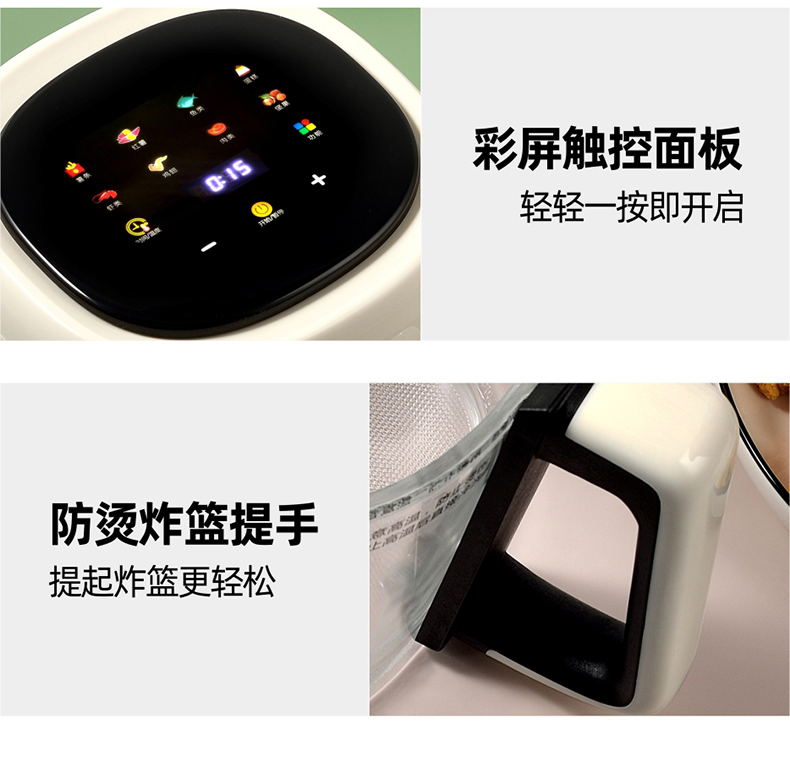 功率:1350W 电压:220V 容量:4L 毛重:4.7Kg 材质:外壳PP+钢化玻璃炸篮 彩盒包装尺寸:318*287*333mm 外箱包装尺寸:590*328*682mm 推荐理由: 1、加厚高硼硅玻璃锅体,360度可视食物 2、大彩屏八大功能选择,触控操作 3、可调式温度,高达200度,NTC智能控温360度循环加热,碳素发热管10叶涡轮扇,结束自动散热 4、抽篮取出即停且保护带记忆