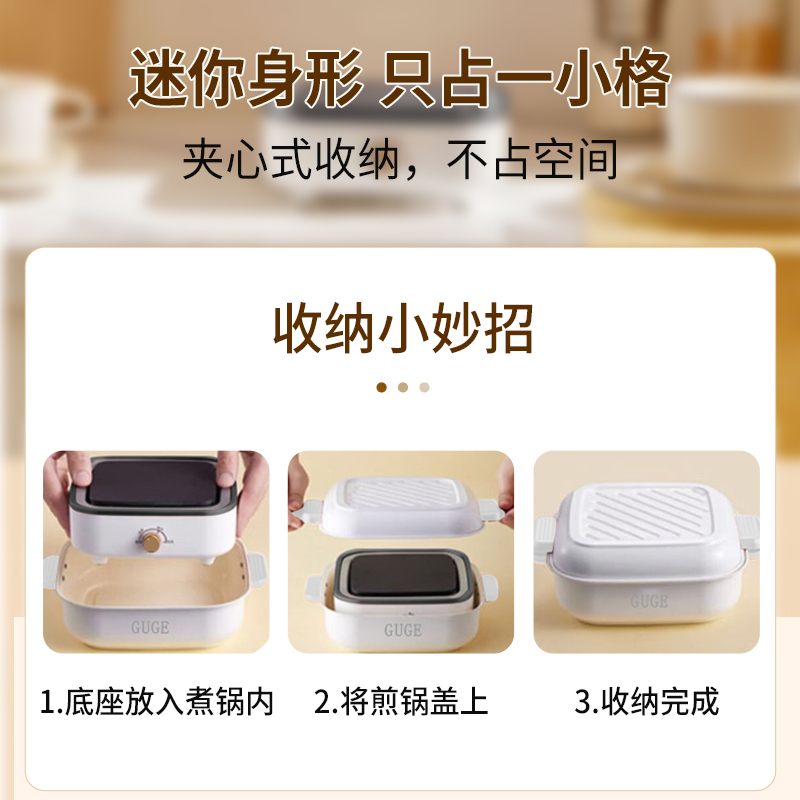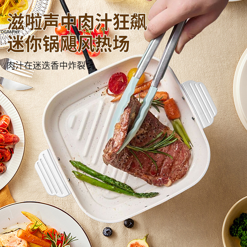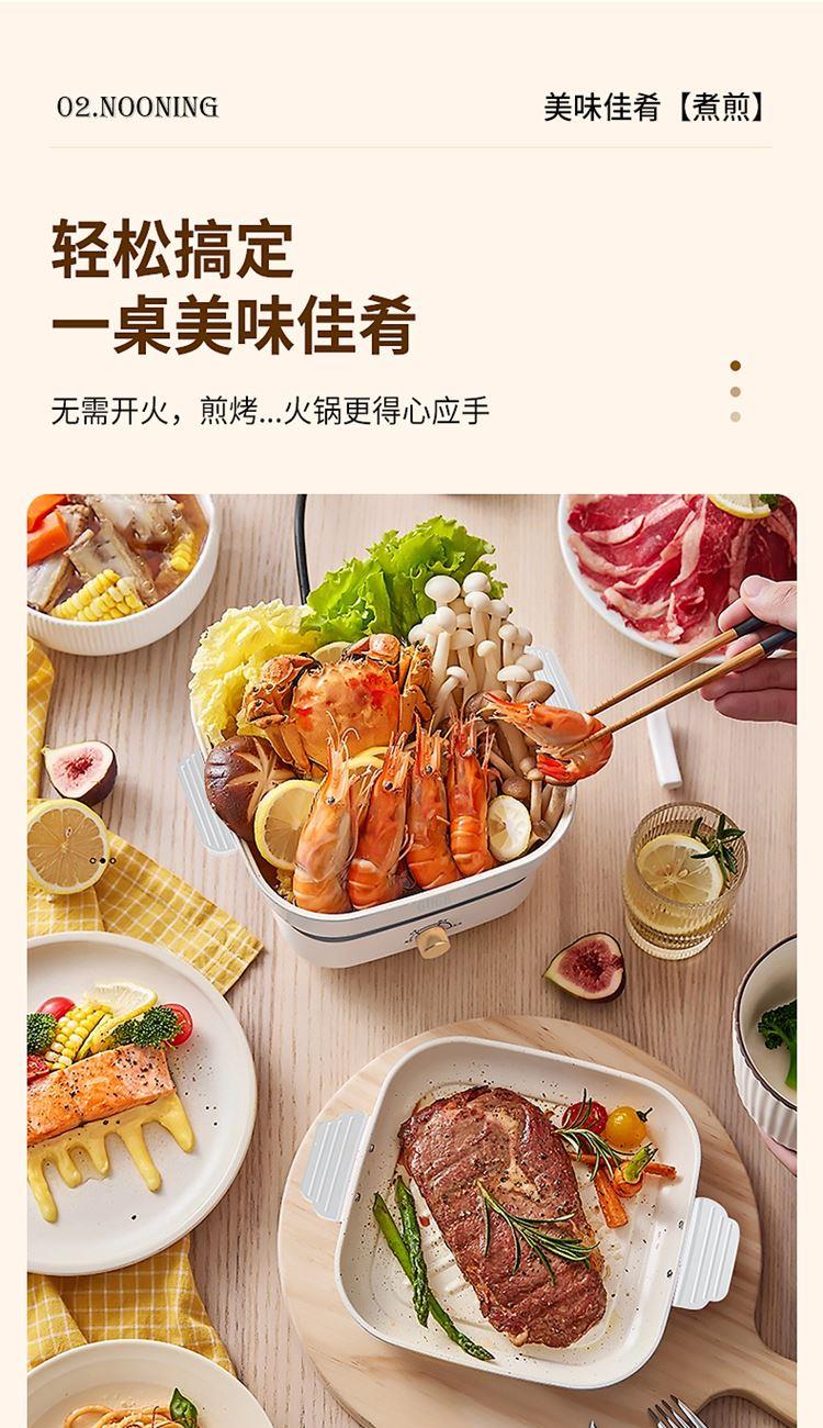 额定功率:800w 额定频率:50HZ 额定电压:220V 额定容量:1.2L 产品净重:1.2kg 配置:煮锅、煎烤锅 产品尺寸:245*197*155mm 包装方式:彩盒+邮箱 ● 美食新“煮”义,煎、炸、蒸、煮、涮、焖、炖、烙样样精通 ● 解锁百样美味,配置煮锅+煎烤锅 ● 三档火力,旋钮一触即达 ● 迷你身形,只占一小格 ●轻松搞定一桌美味佳肴,无需开火,煎烤-火锅更得心应手 ●随行差旅派,锅/碗/壶/多功能三合一