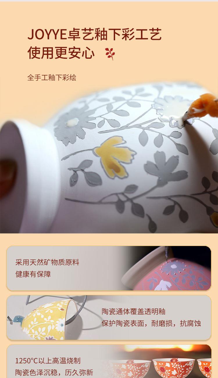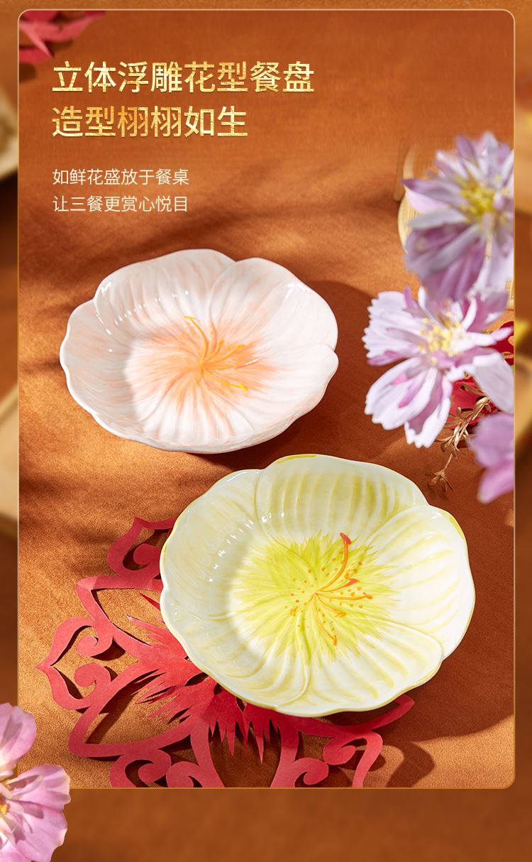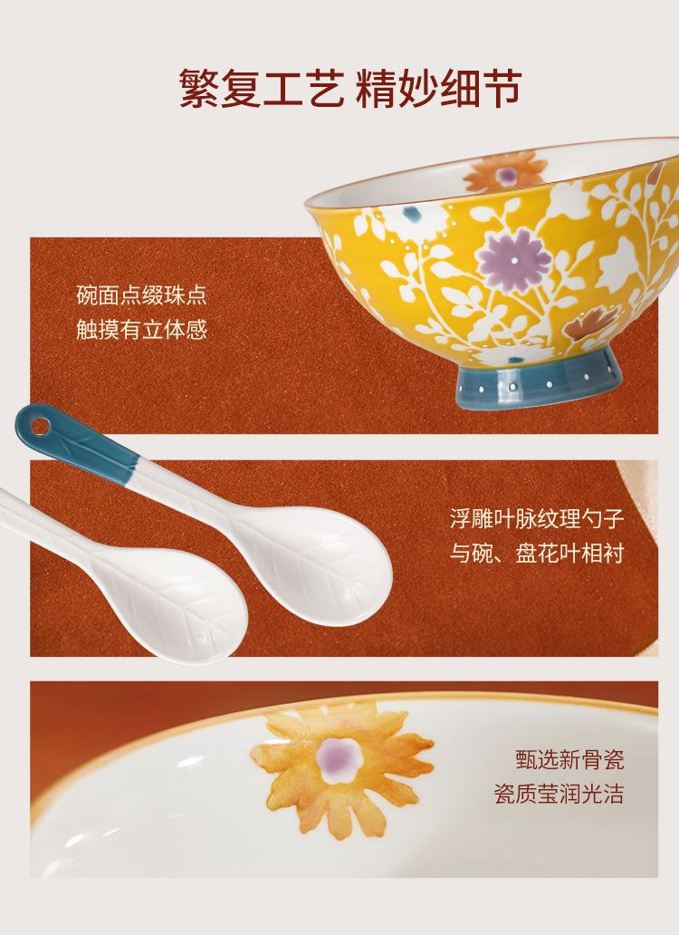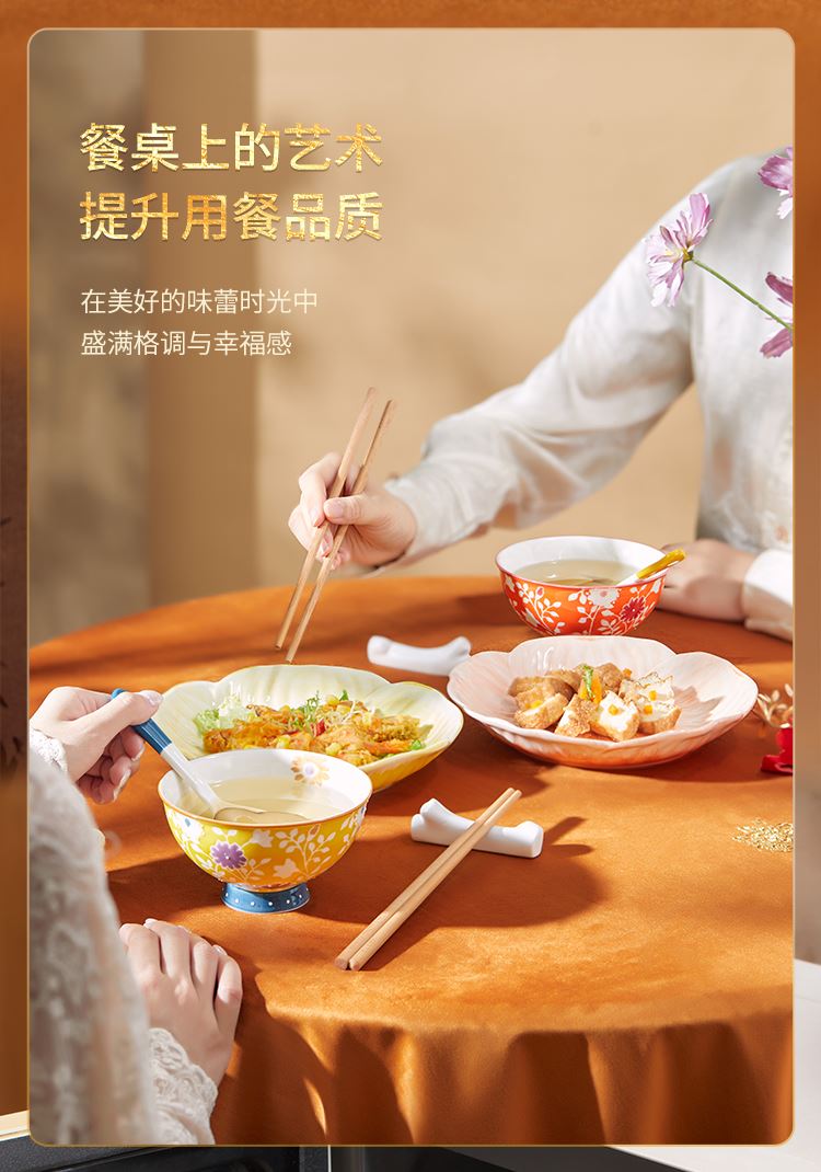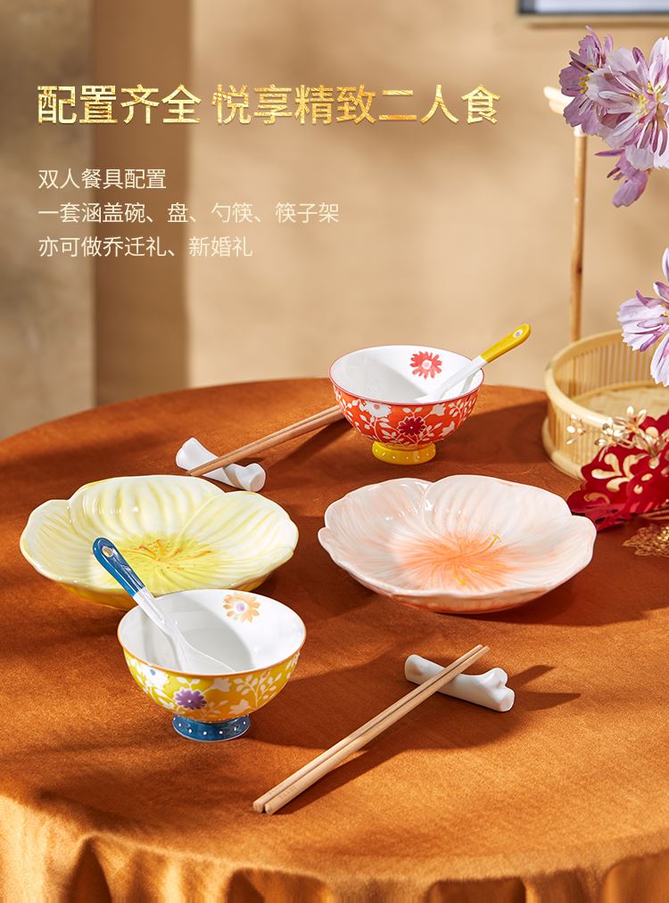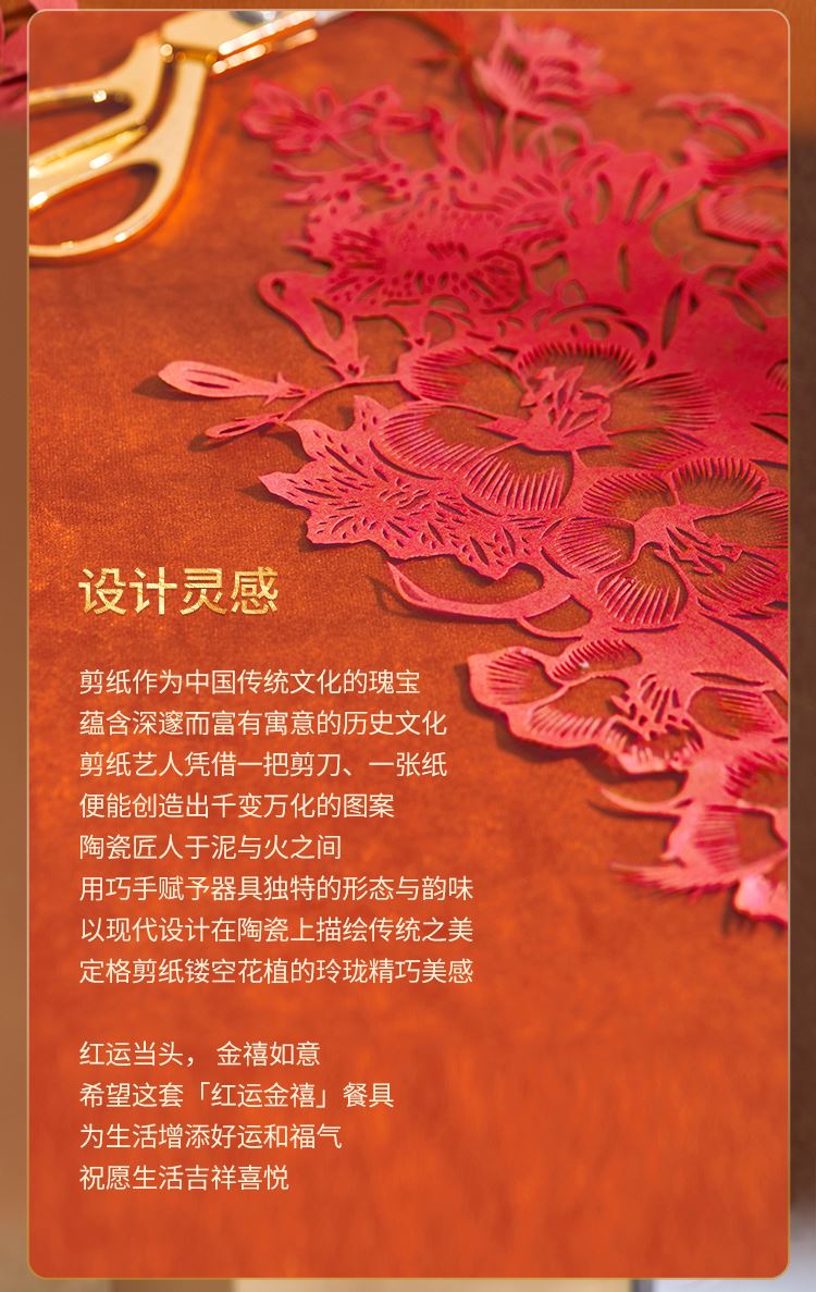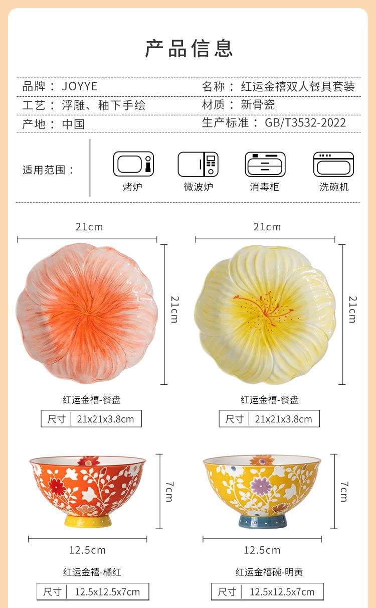 颜色:花色 产品尺寸:饭碗 x2:12.5x12.5x7cm 菜盘 x2:21x21x3.8cm 筷子架 x2:8x1.5x2.5cm 勺子 x2:16cm 筷子 x2:25cm 产品材质:新骨瓷 产品工艺:釉下手绘、浮雕 包装方式:彩盒装 产品卖点: 1. 灵感源于中国传统民间剪纸工艺,以象征吉祥喜庆的橘红和明黄作为主色,将民间剪纸艺术与陶瓷手绘工艺巧妙结合,让中国传统文化之美融入日常生活。 2.双人餐具配置,一套涵盖碗、盘、勺筷、筷子架共 10 件组套,充分满足仪式感用餐所需。 3. 全手工釉下彩绘工艺,在碗面上灵动还原剪纸特色镂空艺术。 4. 携鸿运,赠金禧。花面蕴含“好运”与“喜气”美好祝愿,可做乔迁礼、新婚礼,送礼心意十足。 5. 浮雕立体花型盘,造型栩栩如生,为美食增添食欲。