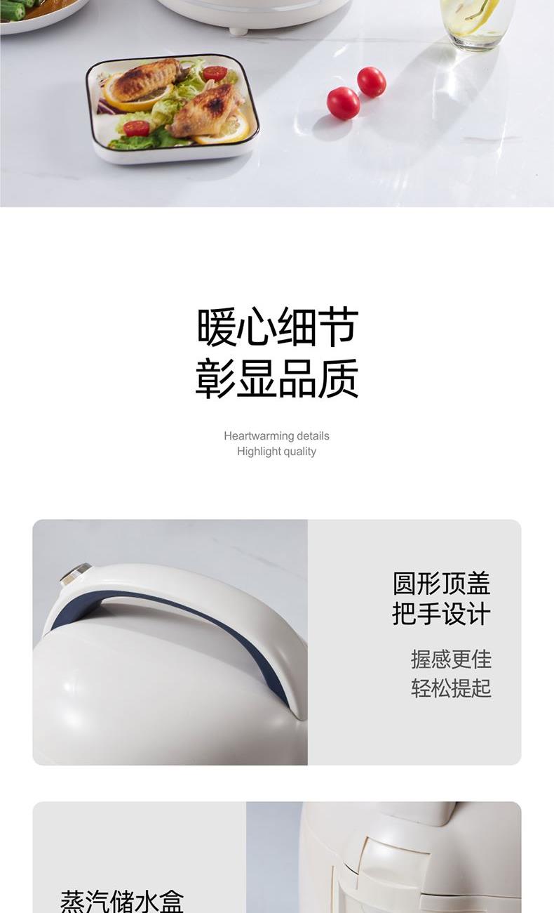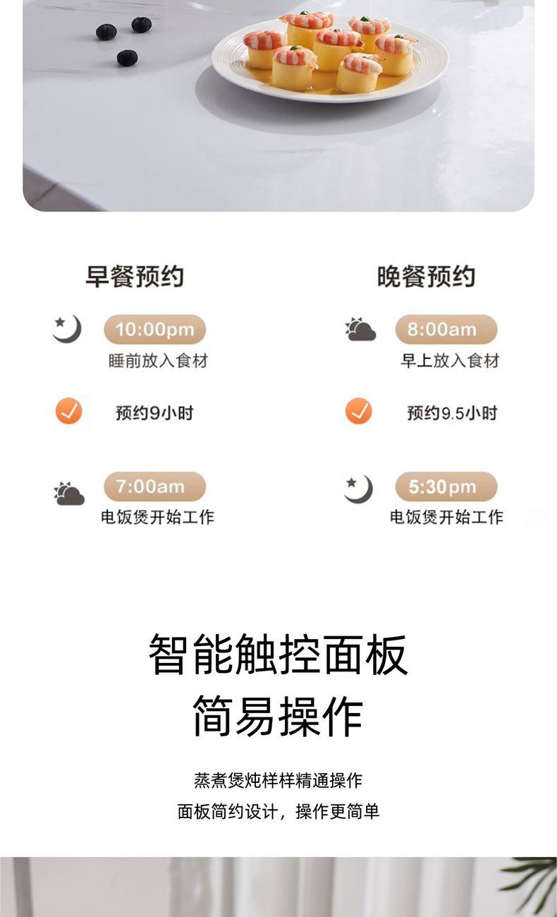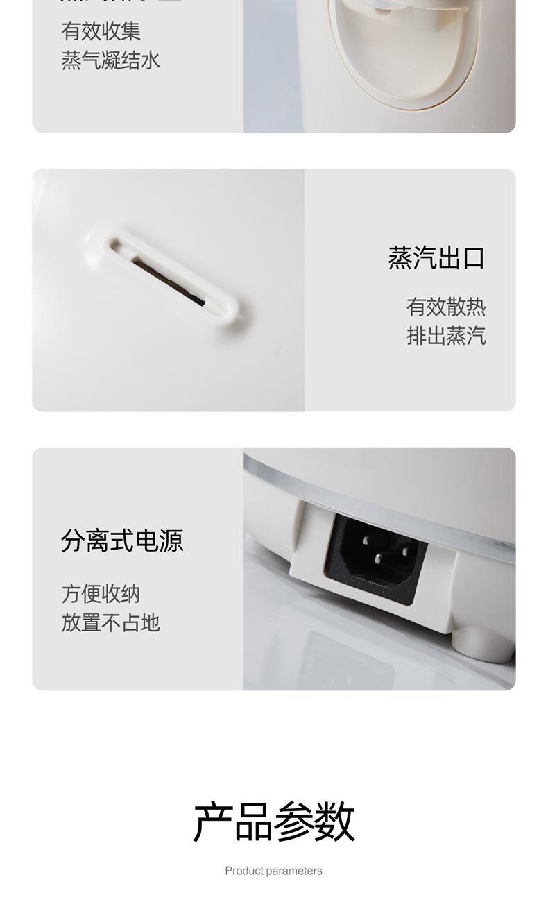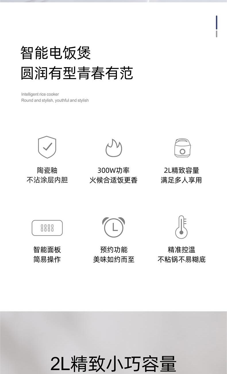 产品颜色:暖白 产品材质:PP+陶瓷釉 额定电源:220V~ 额定频率:50Hz 额定功率:300W 额定容量:2L 单台净重:1.45kg 单台毛重:1.80kg 产品尺寸:210*200*250mm 内箱尺寸:252*252*275mm 外箱尺寸:520*520*570mm 产品清单:主机*1/电源线*1/说明书*1 智能面板,简易操作,蒸煮两用 陶瓷釉不粘图层内胆,一冲一擦易清洗 2L精致容量,小巧易收纳 多功能小锅,煮饭煮粥炖汤样样精通