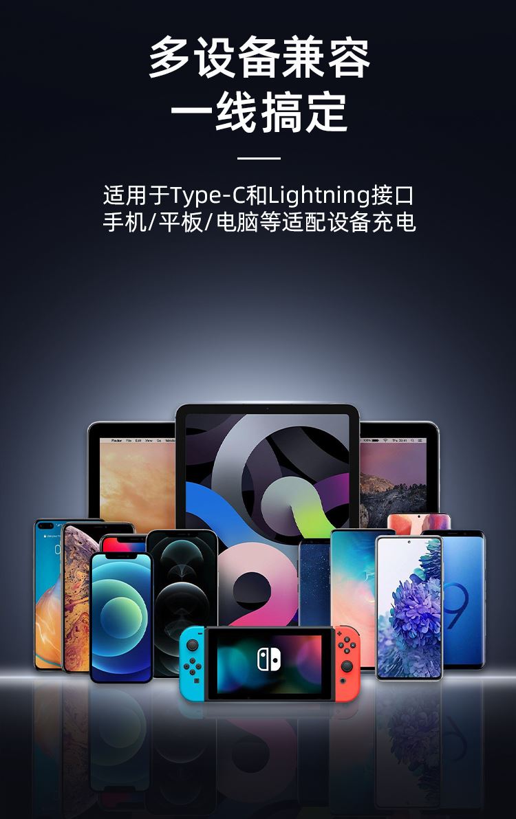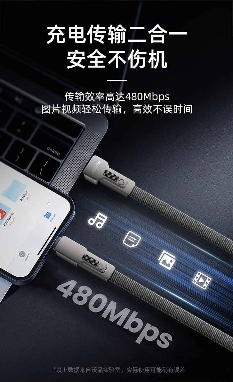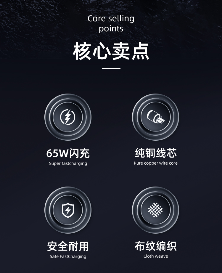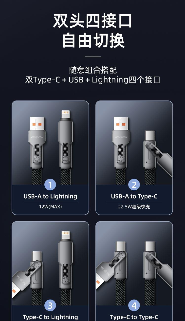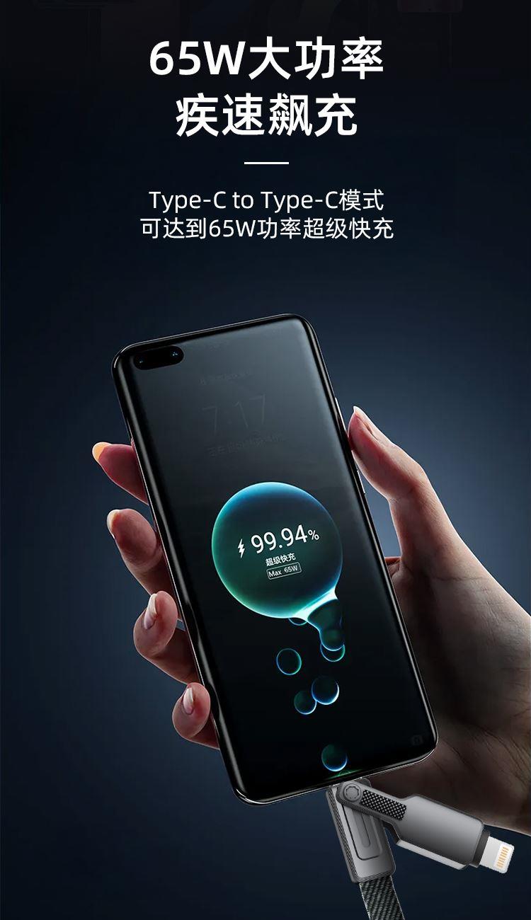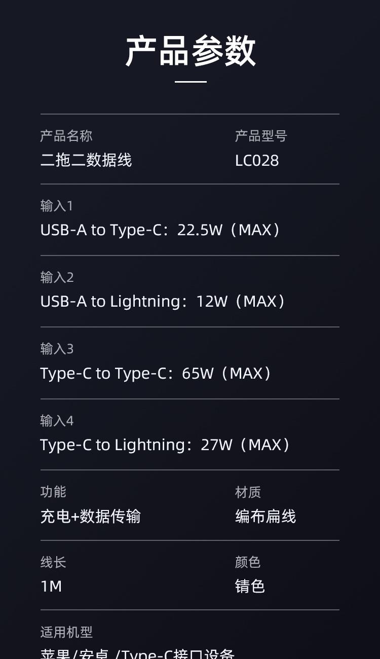 USB-TYPEC 22.5W USB-苹果12W TYPEC-TYPEC 65W TYPEC-苹果PD27W 适用于 Apple/Type-c接口手机/平板等数码产品充电 材质:编布扁线,55*0.08*2+15*0.08*3 纯铜加粗线芯,布纹编织 支持PD 65W,过3A电流,二拖二设计 多设备适配,外观简约时尚 锌合金外壳挂镀工艺,坚固耐用