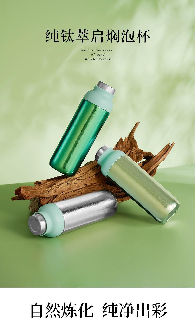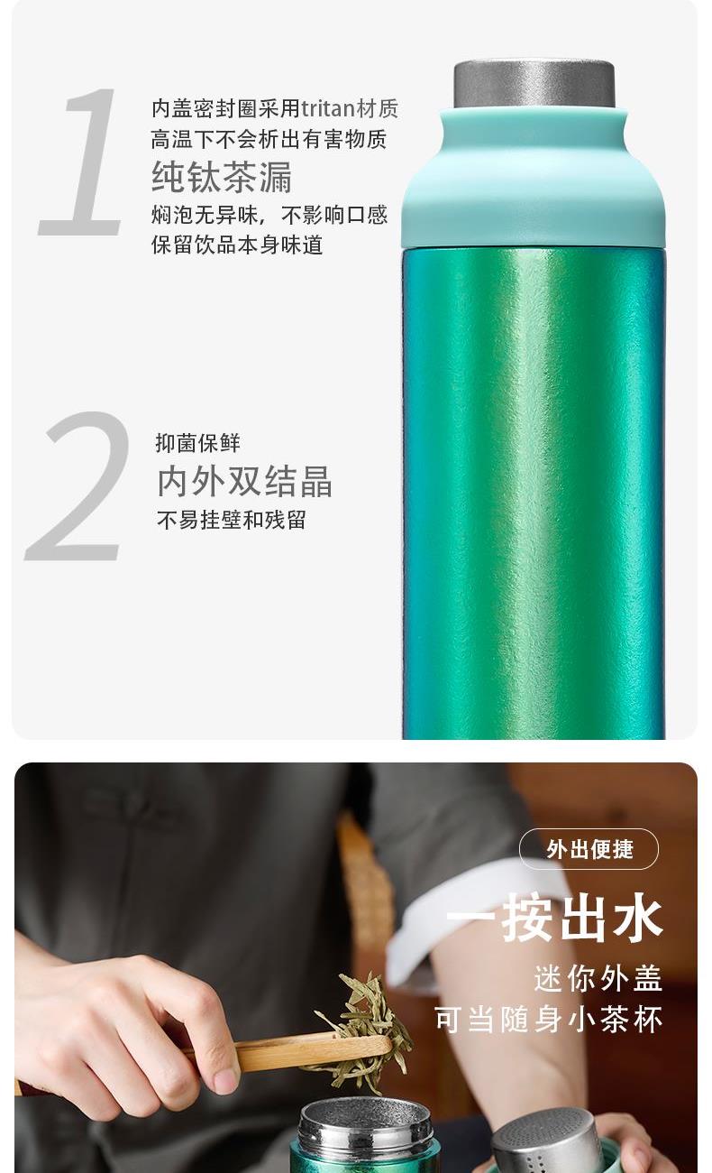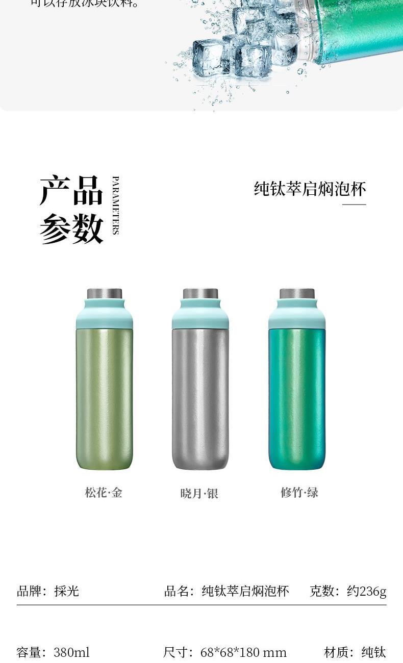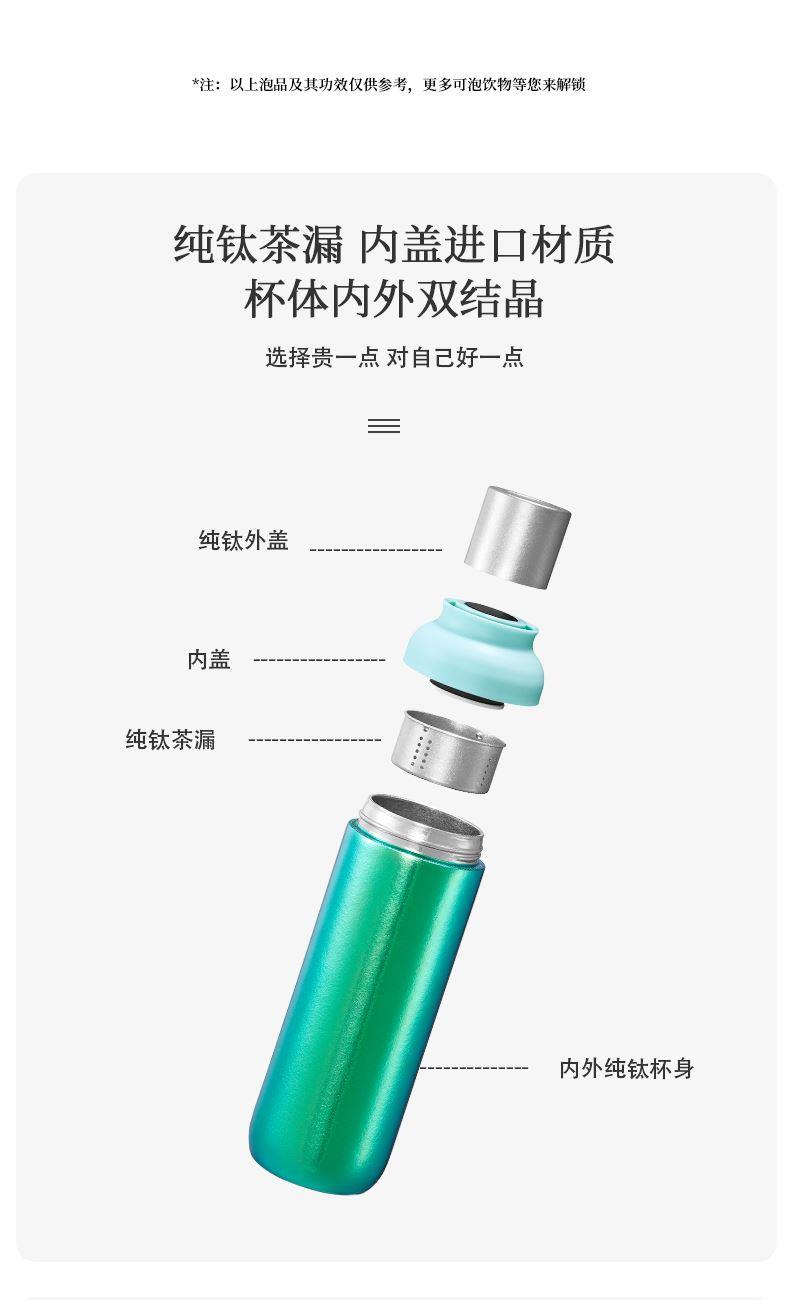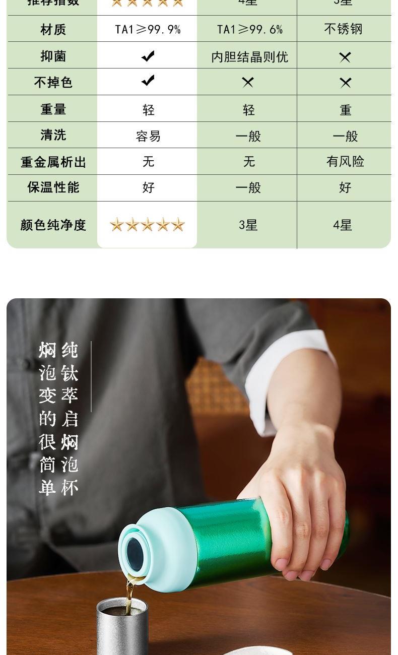 一键开合,单手便捷操作 外盖双层,隔热防烫,精致小茶杯 纯钛材质,内外同品质纯钛,全覆盖结晶,内壁银色结晶,茶汤色泽尽显,耐蚀耐用 无喷砂无油漆无着色剂,焖泡再久不变味,色香味纯享 型号:DBCQ-0401/0405/0406 尺寸:72.5*72.5*225 mm 重量:约280g 容量:400ML 颜色:远山 · 蓝 修竹 · 绿 松花 · 金