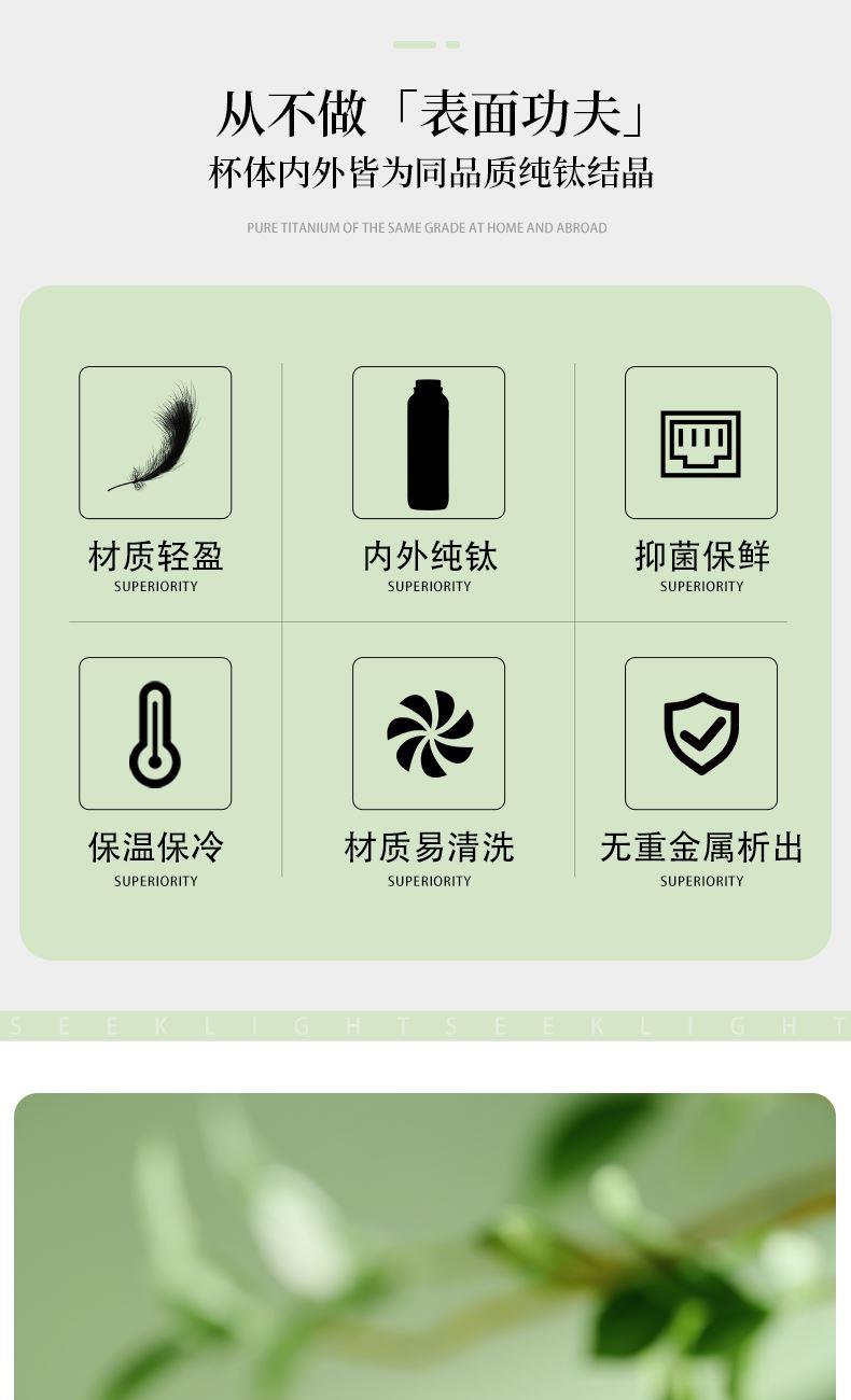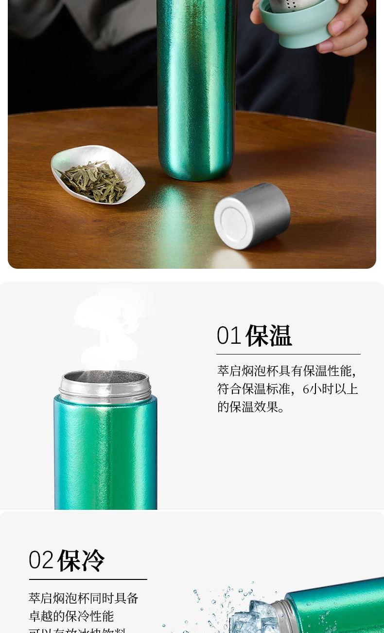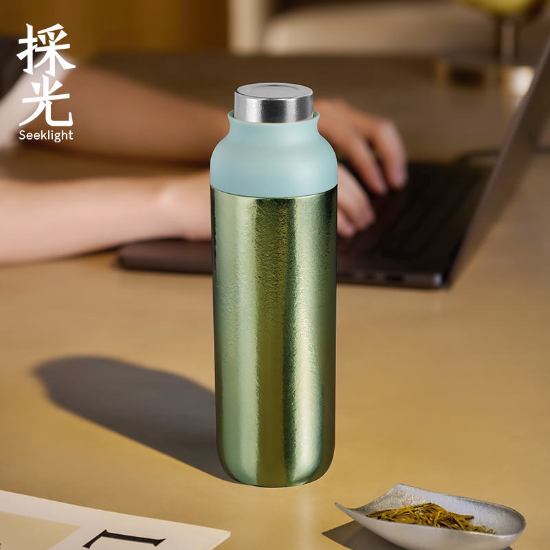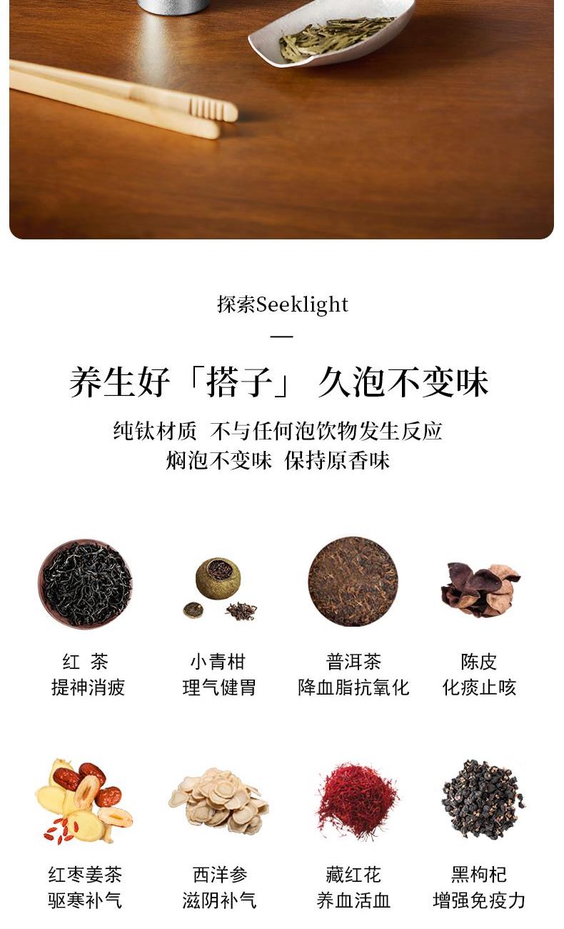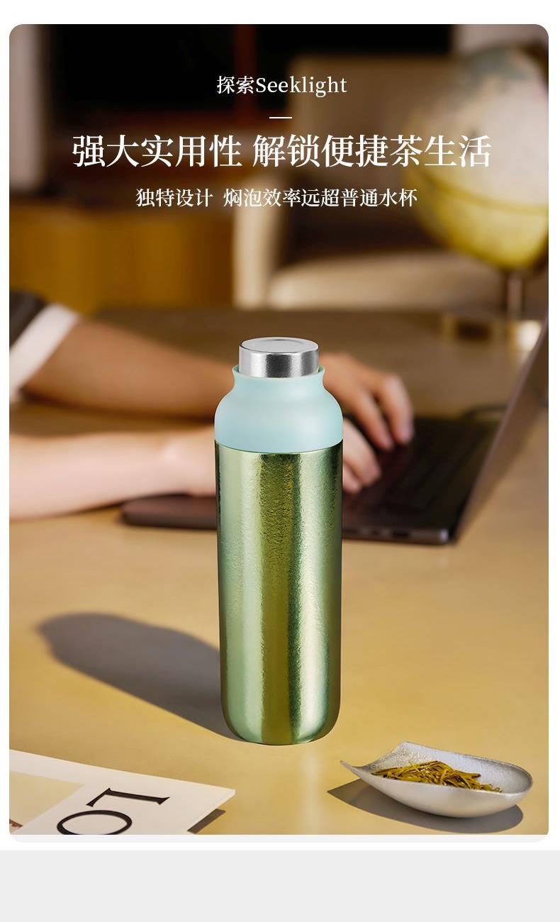 一键开合,单手便捷操作 外盖双层,隔热防烫,精致小茶杯 纯钛材质,内外同品质纯钛,全覆盖结晶,内壁银色结晶,茶汤色泽尽显,耐蚀耐用 无喷砂无油漆无着色剂,焖泡再久不变味,色香味纯享 型号:DBCQ-0401/0405/0406 尺寸:72.5*72.5*225 mm 重量:约280g 容量:400ML 颜色:远山 · 蓝 修竹 · 绿 松花 · 金