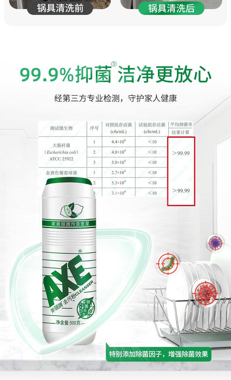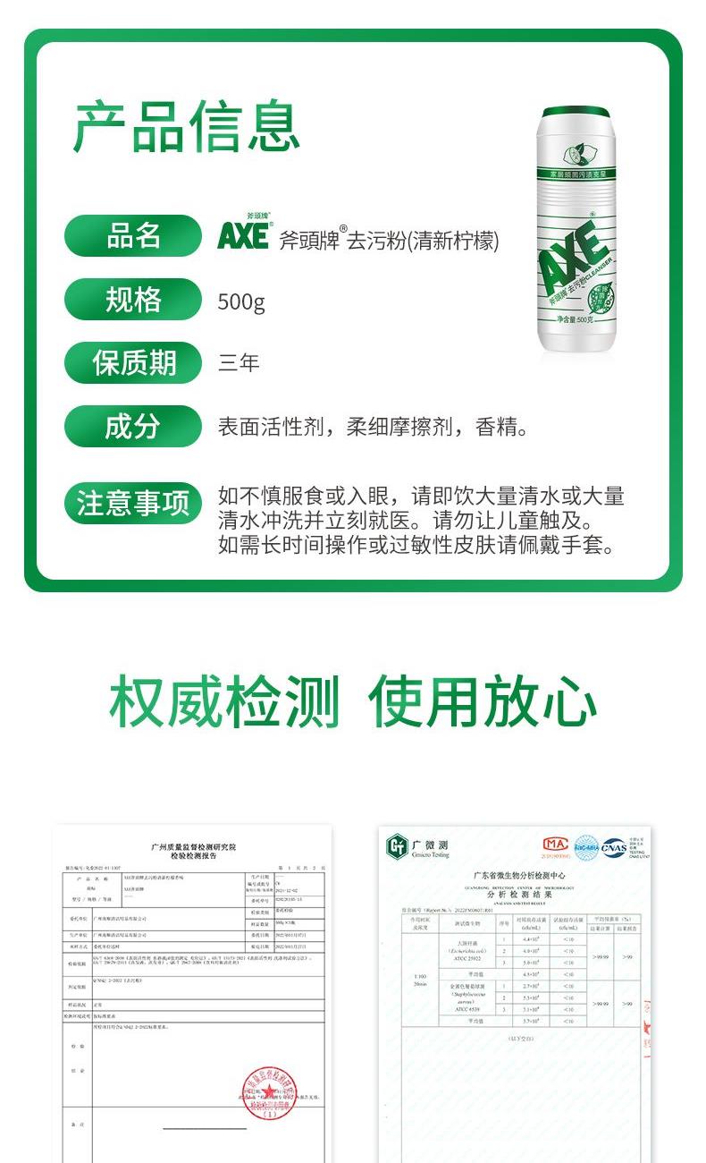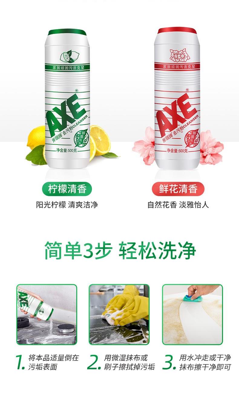 AXE柠檬去污粉500g 卖点: 强力去污 适用范围广不伤家居表面 注意事项: 如不慎服食或入眼,请即饮大量清水或大量 清水冲洗并立刻就医。请勿让儿童触及。 如需长时间操作或过敏性皮肤请佩戴手套。