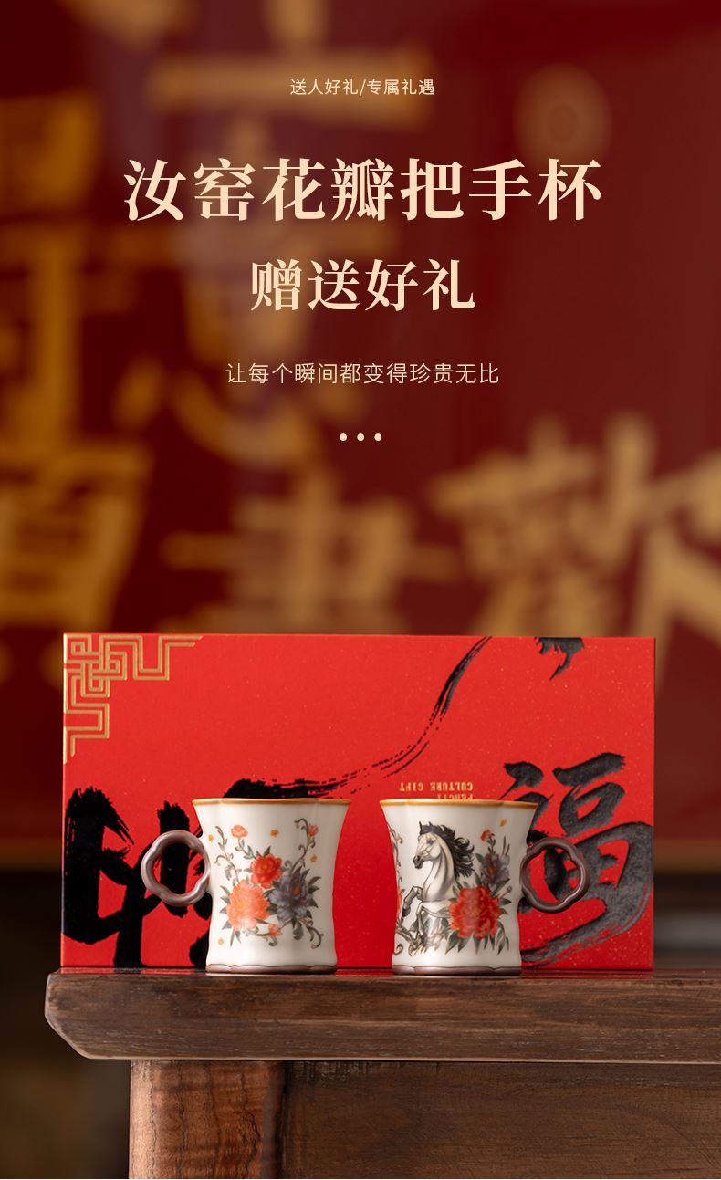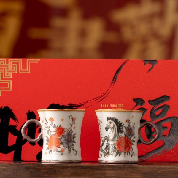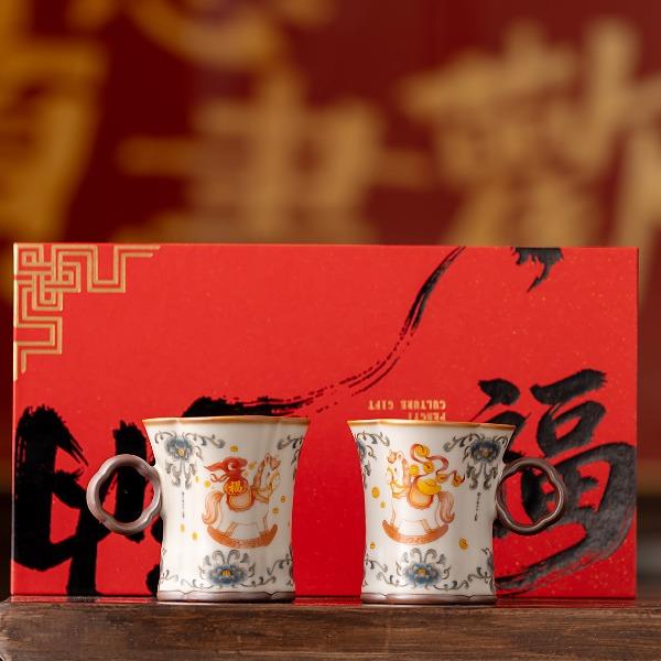 配 制: 2杯 1礼盒 手提袋 材质:汝黄瓷 规格:8.8*7.3cm 容量:90ml 推荐说明:正面马上有钱,反面马上有福。亚黄汝瓷,玛瑙入釉,蝉翼开片,家有千财万贯,不如汝窑一片。技术新品。画面堆料技术,富有立体浮雕质感,真实感强。杯身开片,可养瓷。