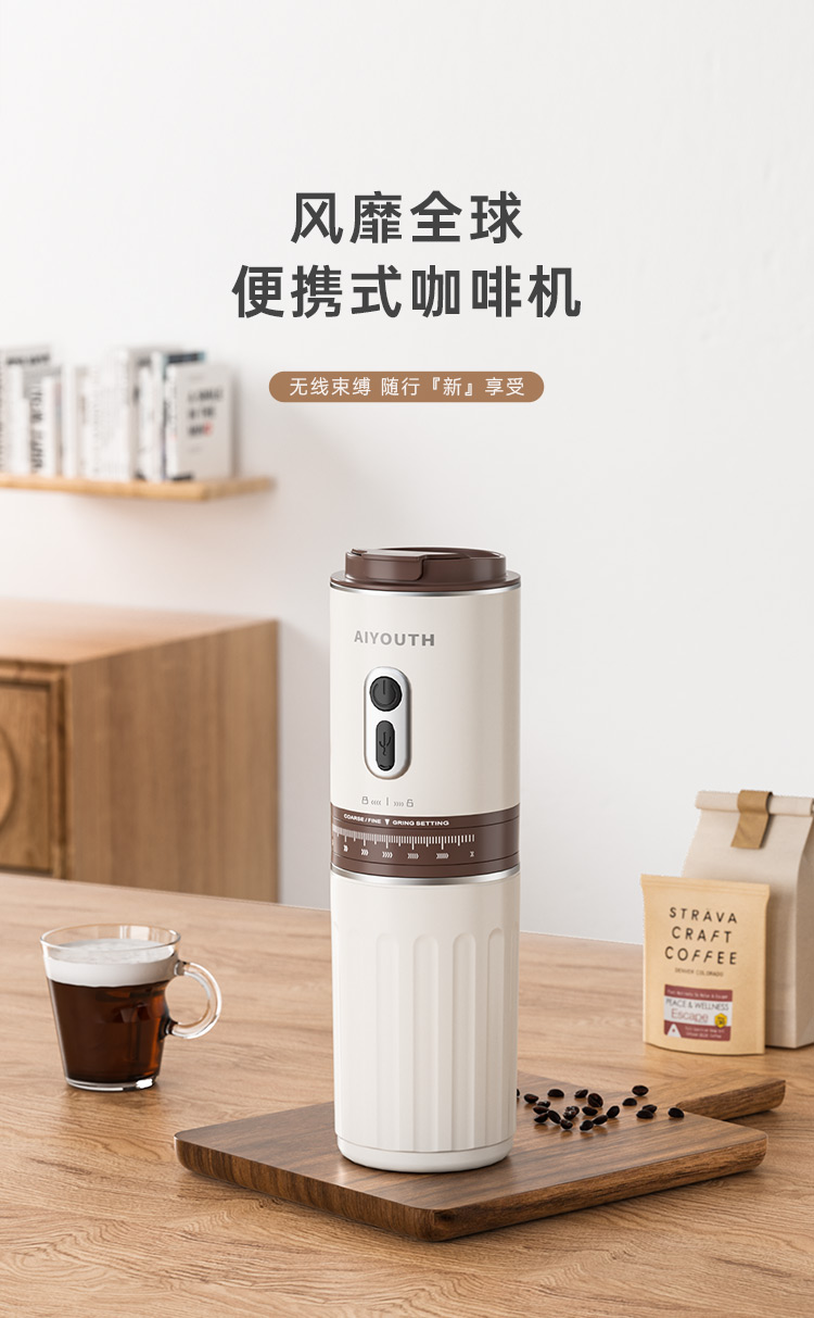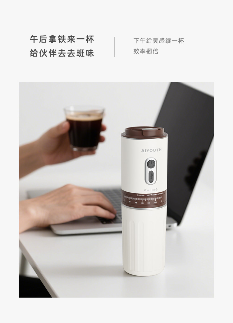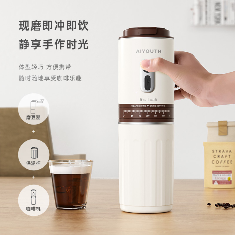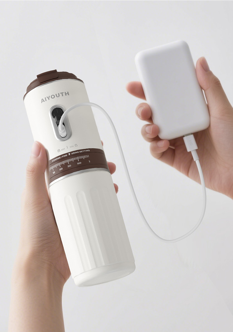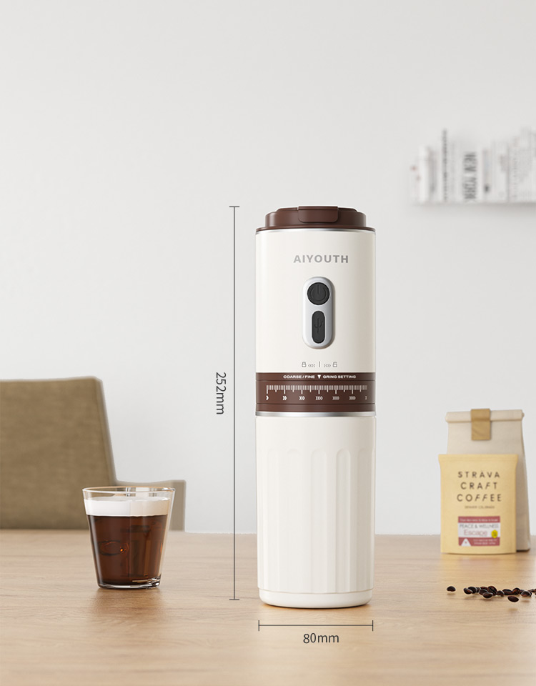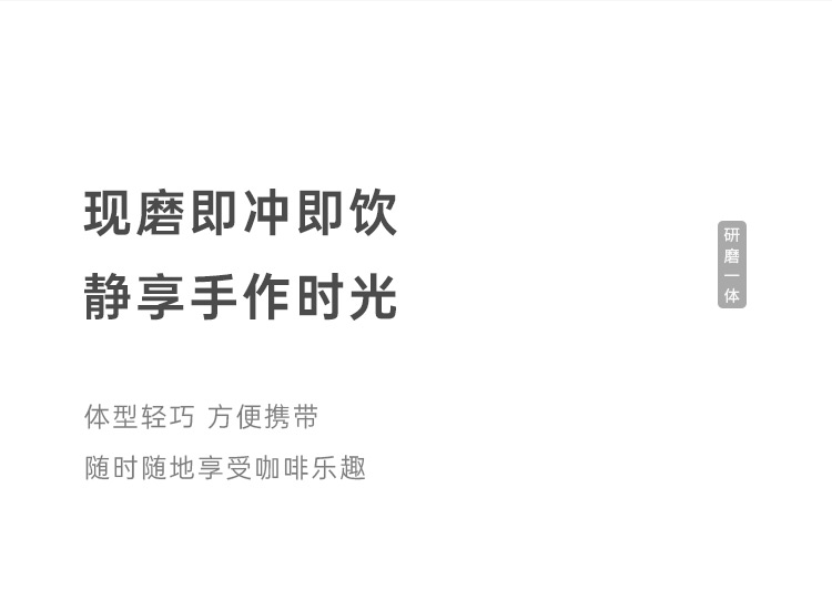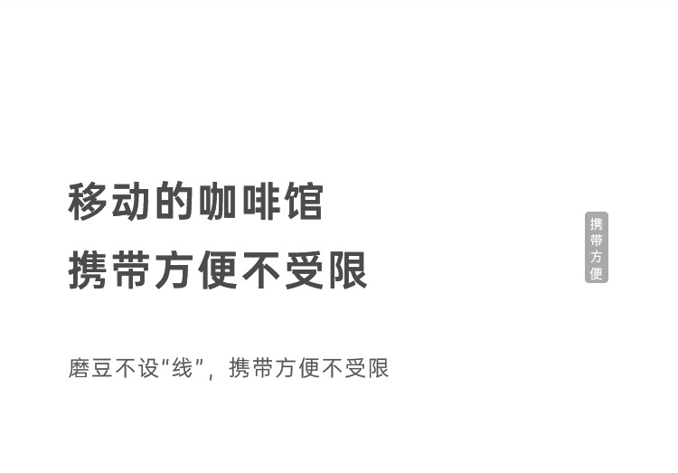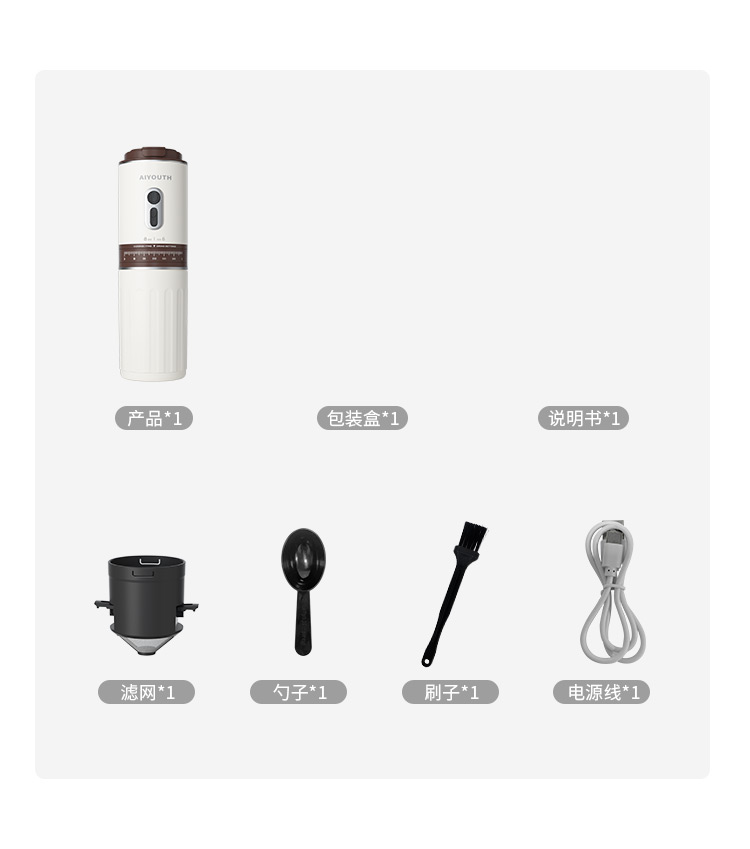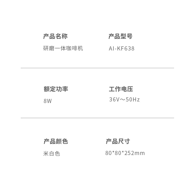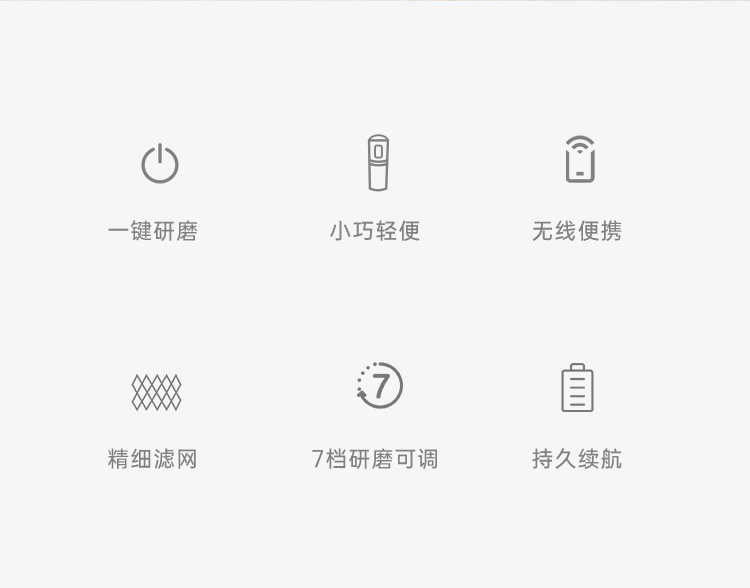 额定电压:36V~ 额定功率:8W 额定容量:250ml 产品毛重: 0.7kg 产品颜色:米白色 包装尺寸:100*100*275mm 包装清单:主机、充电线、滤网、勺子、刷子、说明书 1.一键研磨7档粗细可调节,适配不同冲泡方式 2.持久续航,轻松满足多次冲泡需求,好友分享无压力 3.无线便携咖啡机,多功能三合一,研磨、冲泡、保温咖啡杯 4.细密滤网,有效隔离细小咖啡粉末,冲泡顺畅不堵塞,一冲即净