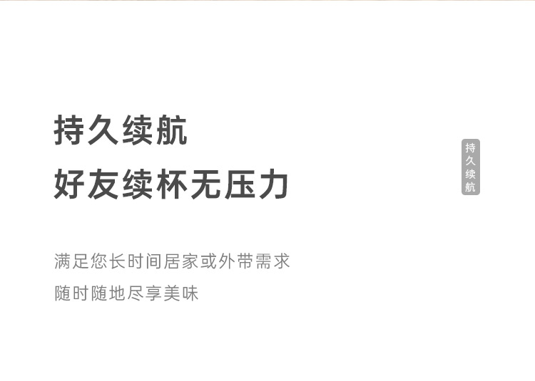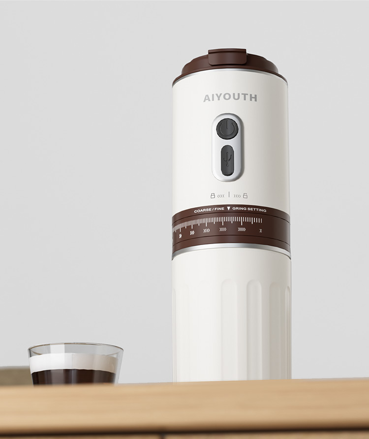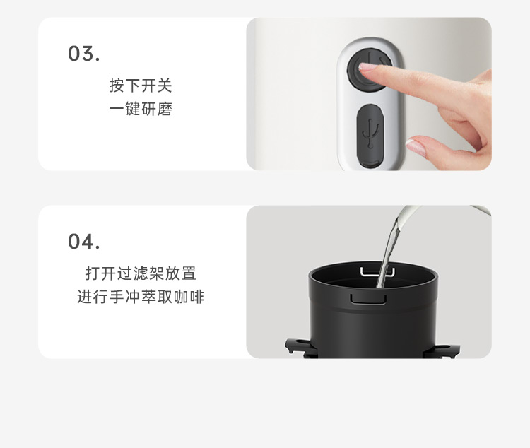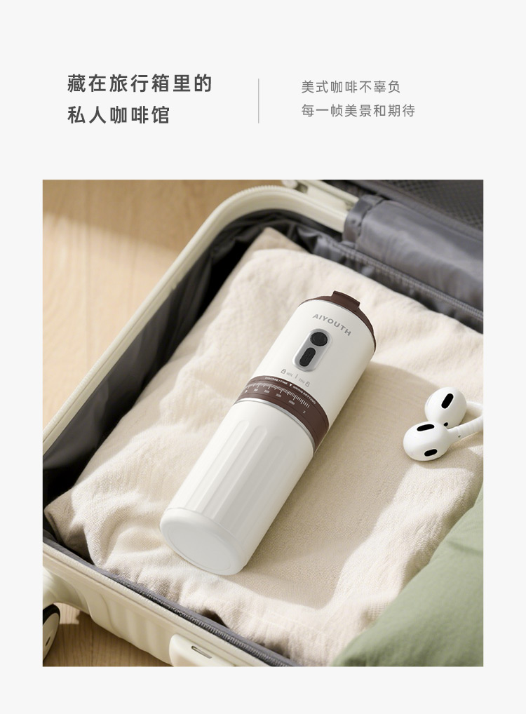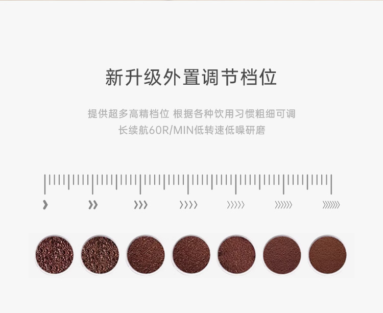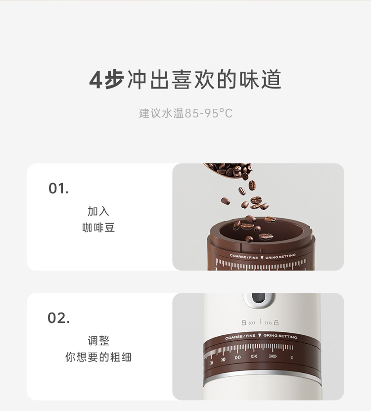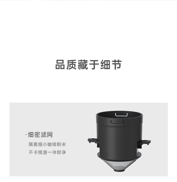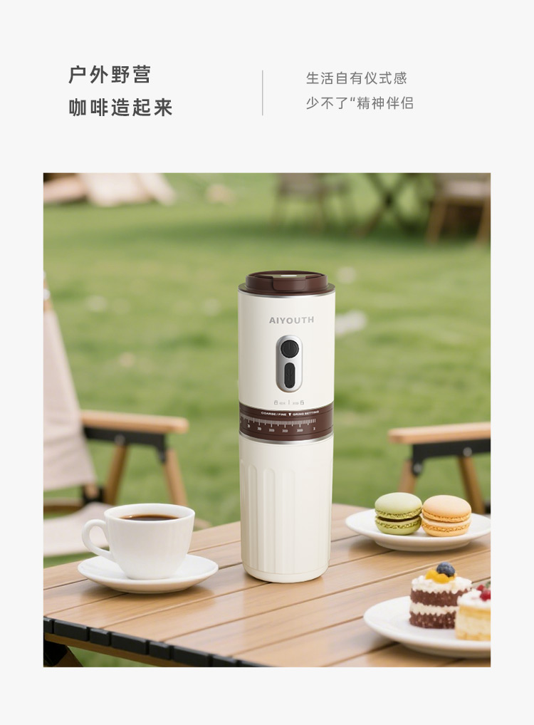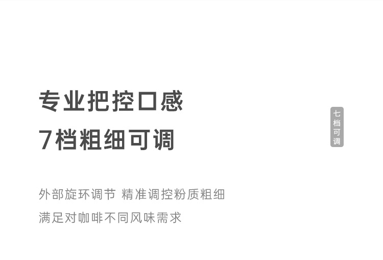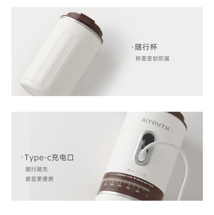 额定电压:36V~ 额定功率:8W 额定容量:250ml 产品毛重: 0.7kg 产品颜色:米白色 包装尺寸:100*100*275mm 包装清单:主机、充电线、滤网、勺子、刷子、说明书 1.一键研磨7档粗细可调节,适配不同冲泡方式 2.持久续航,轻松满足多次冲泡需求,好友分享无压力 3.无线便携咖啡机,多功能三合一,研磨、冲泡、保温咖啡杯 4.细密滤网,有效隔离细小咖啡粉末,冲泡顺畅不堵塞,一冲即净
