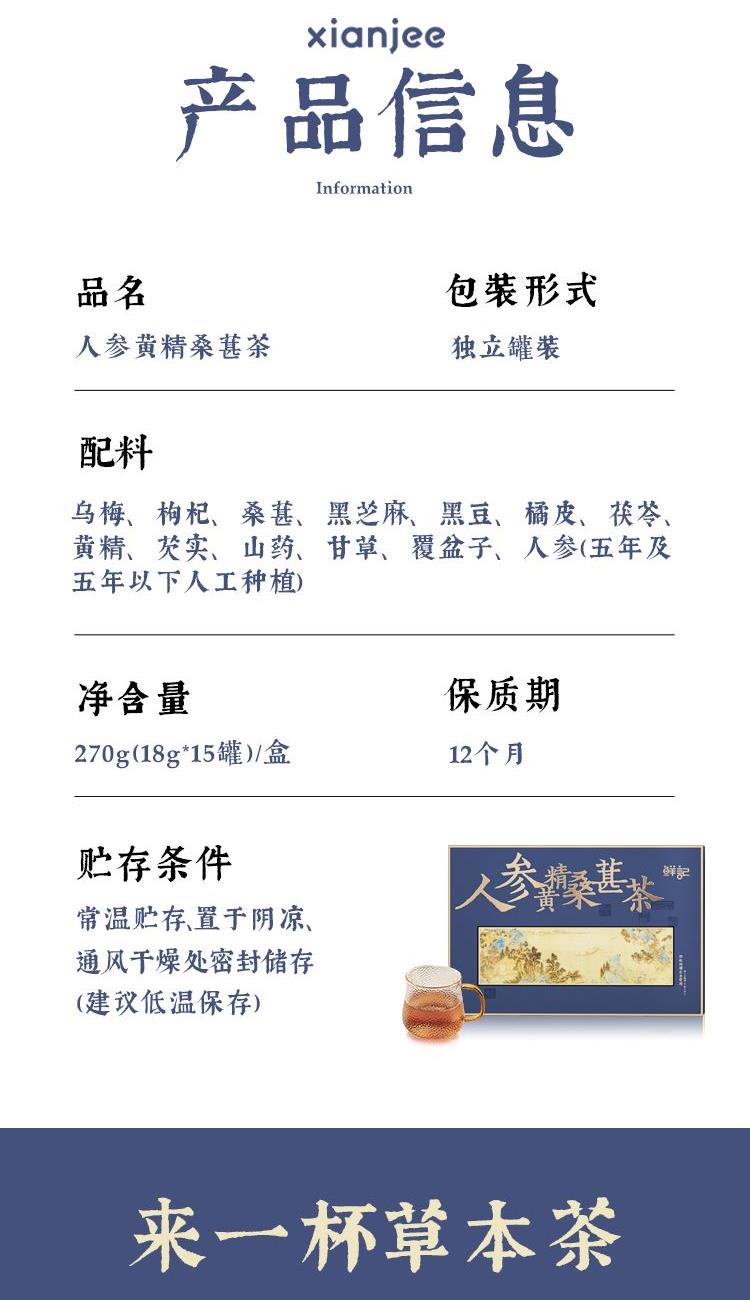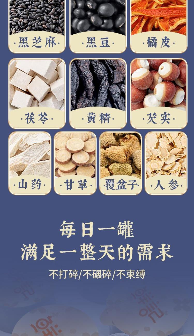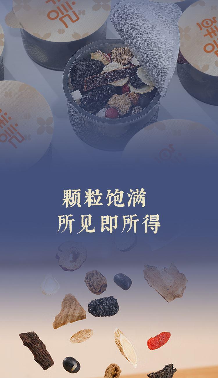 乌梅、枸杞、桑葚、黑芝麻、黑豆、橘皮、茯苓、黄精、芡实、山药、甘草、覆盆子、人参 13味多料养护,甄选好料,科学配比;料足扎实,耐泡味浓。