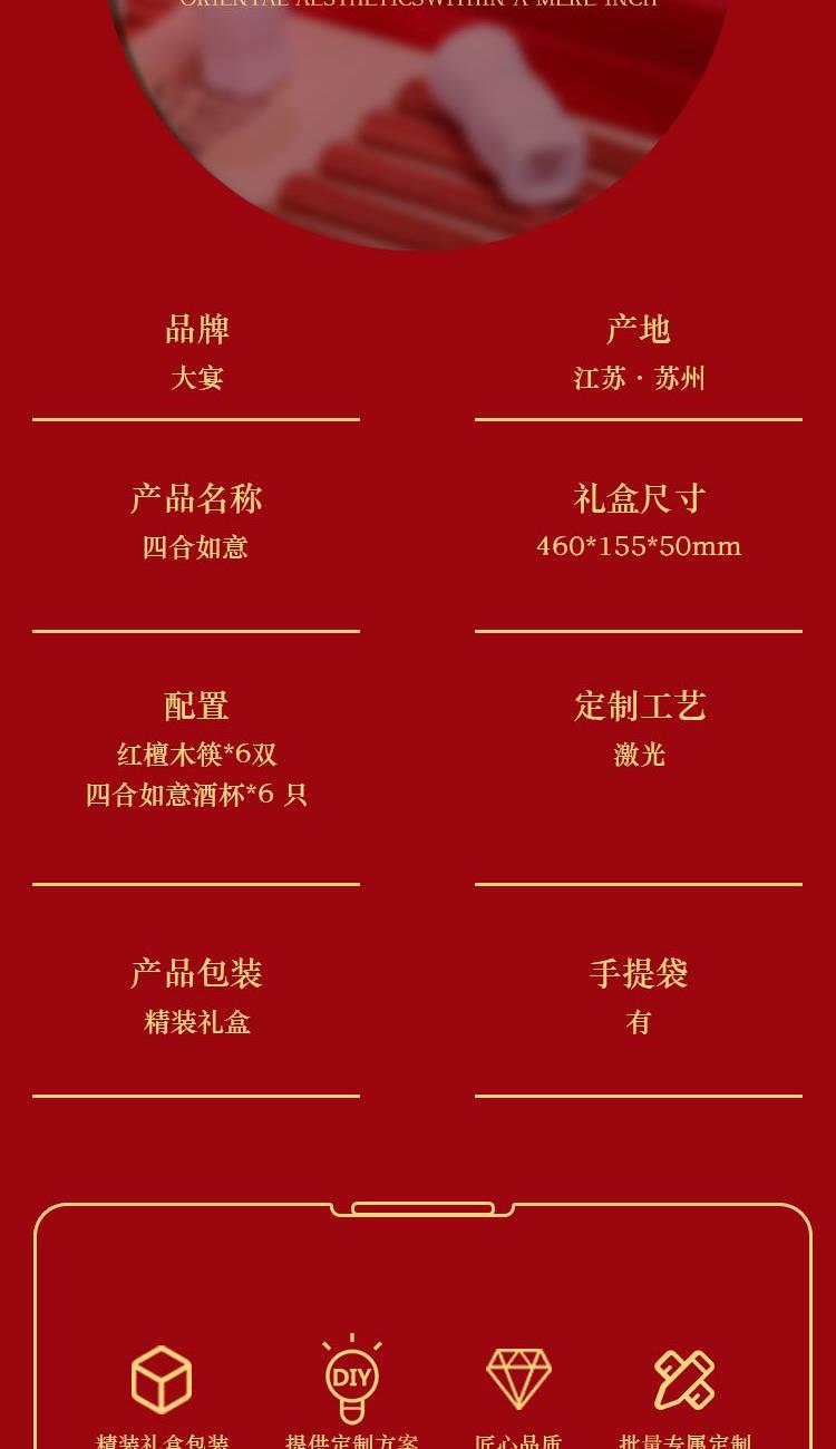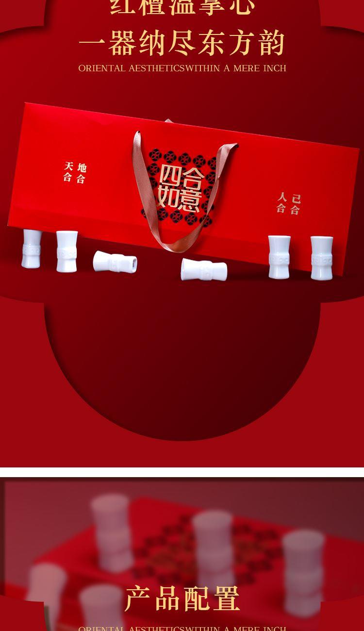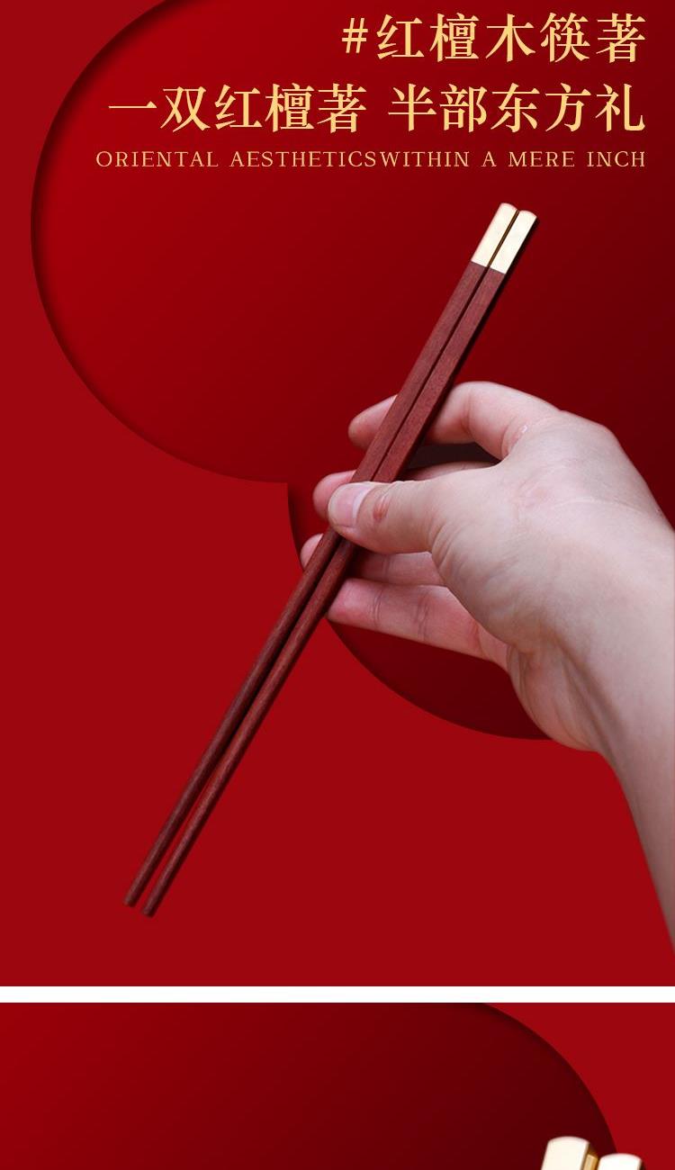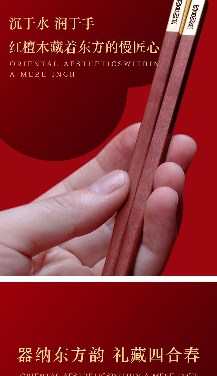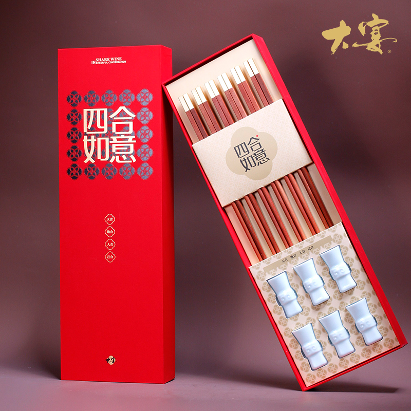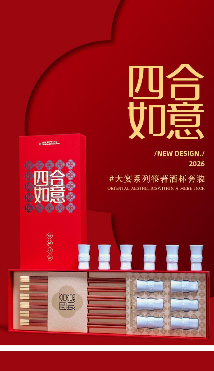红檀木筷x6双;四合如意酒杯x6 只 材质 羊脂玉影青釉 红檀木纯铜镀金筷头 尺寸 包装尺寸:460*155*50mm 红檀木筷:250*7*7mm 酒杯:55*28mm 推荐理由: • 新婚贺礼: "红檀成双,金箸挑喜" • 商务赠礼: "箸福同享,金运长存" • 长辈寿礼: "檀香伴百岁,金箸添福寿“