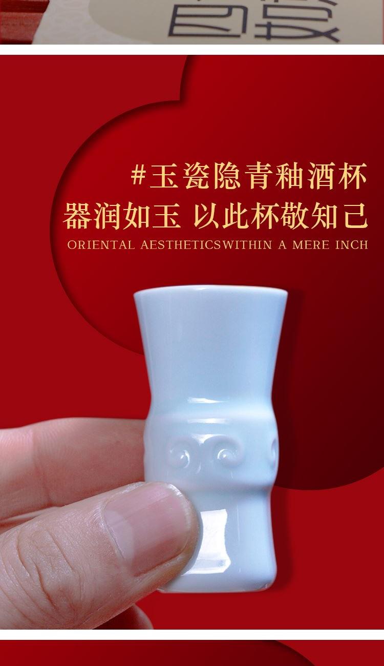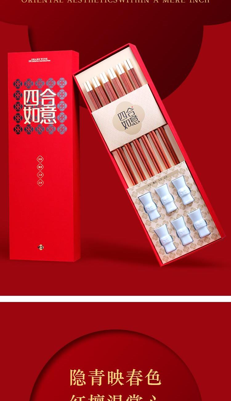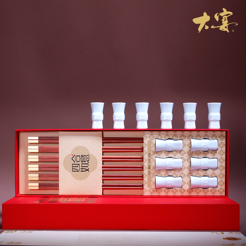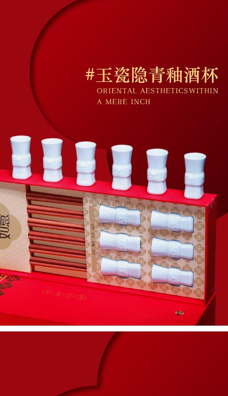 青锦大宴系列【四合如意】礼盒红檀木筷6双玉瓷隐青釉酒杯6只