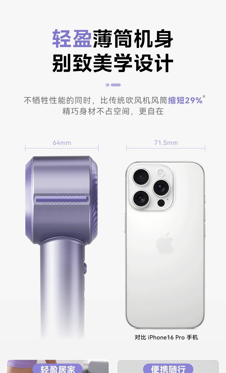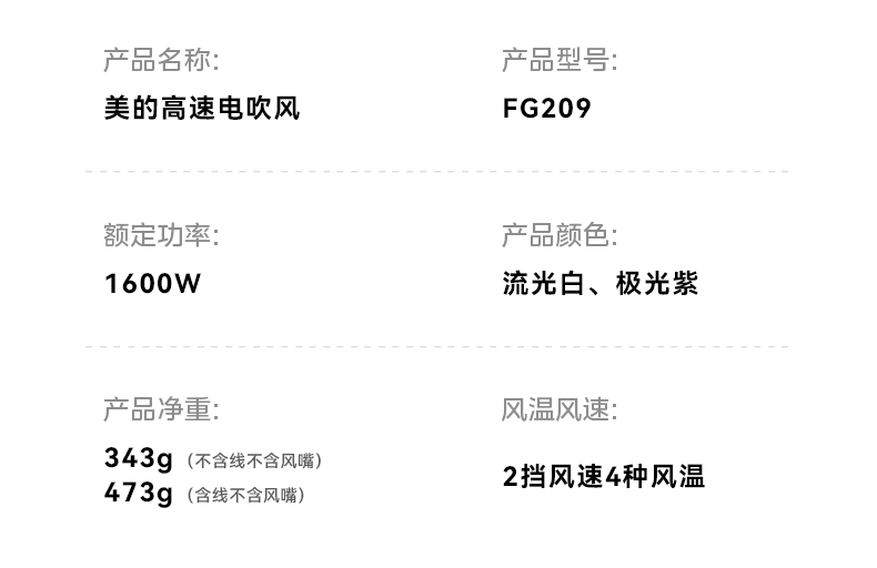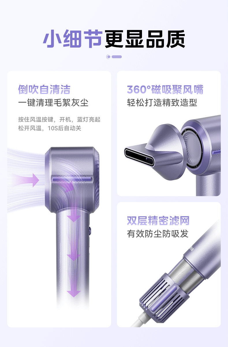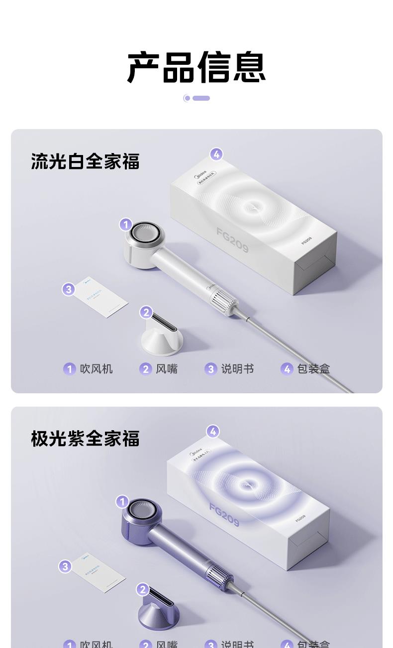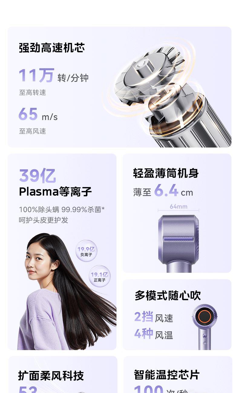 产品规格: 产品尺寸:120 x 85 x 320 mm 包装尺寸:79 x 64 x 306 mm 产品毛重:0.533 kg 产品特点: 高速电机,吹干不烤干 8档模式,2档风速,4档风温 磁吸可拆进风滤网,倒吹自清理毛发 珠光质感,礼盒包装 扩面柔风,高速风吹,发丝不打结 39亿等离子,消灭头螨马拉色菌,呵护头皮健康